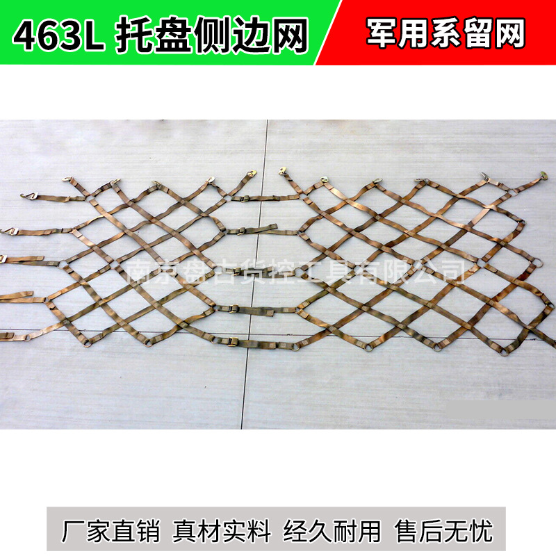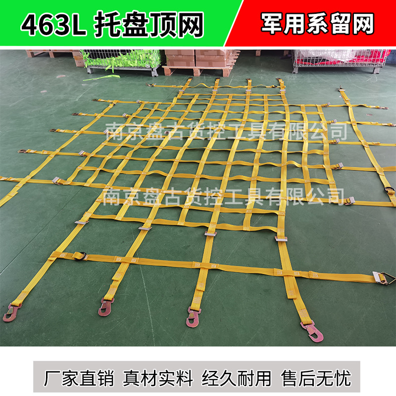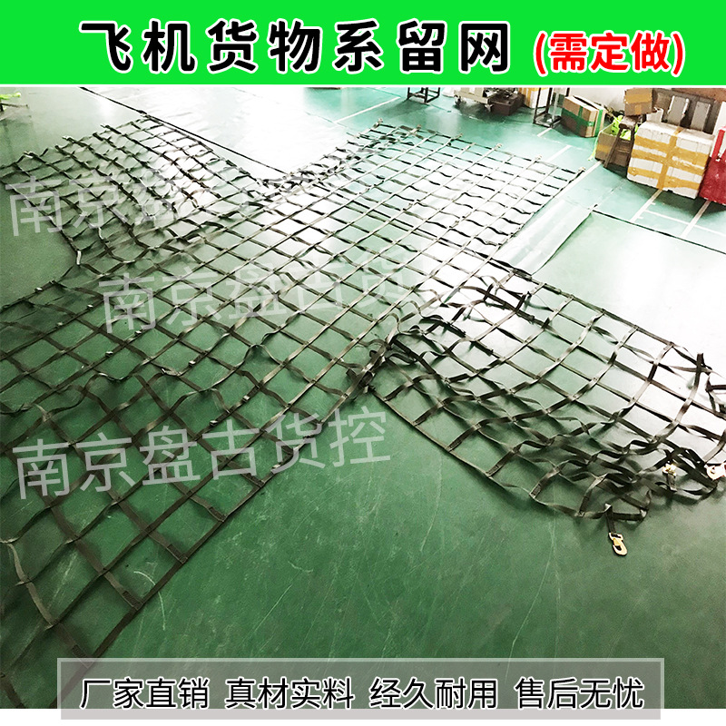 盘古货控 军用航空网严格按照军规相关的规定,通过了织带阻燃试验“15秒水平燃烧试验”,整套产品严格按照《航空网符合性验证试验大纲》要求,通过了极限载荷、延伸率试验以及纺织品老化试验等。我们用最严苛的生产要求,致力于提供客户“高标准、高水平、高质量”的产品!中国的盘古,世界的索具园!