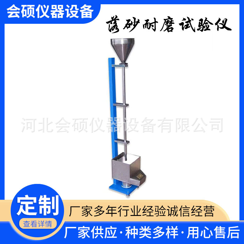 落砂耐磨试验机用来测试标准条件下有机涂层(诸如铝塑复合板或金属漆,汽车漆等)的耐磨性。让一定大小的砂粒通过导管从规定的高度落到试验样板上直至磨到露出基材为止,称取将漆膜破坏所需要的砂量,以单位涂层厚度所用的标准砂量来评定该漆膜的耐磨性。按照GB/T 23988-2009《涂料耐磨性测定落砂法》及ASTM D 968制造,精密控制每一个零部件的尺寸偏差,且主要零部件均采用高级耐磨不锈钢制造。