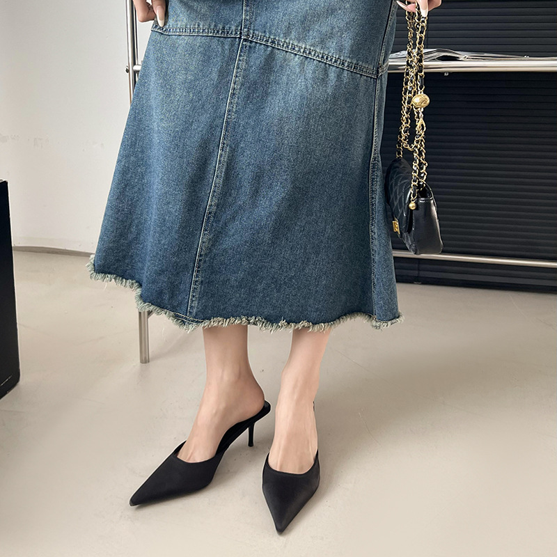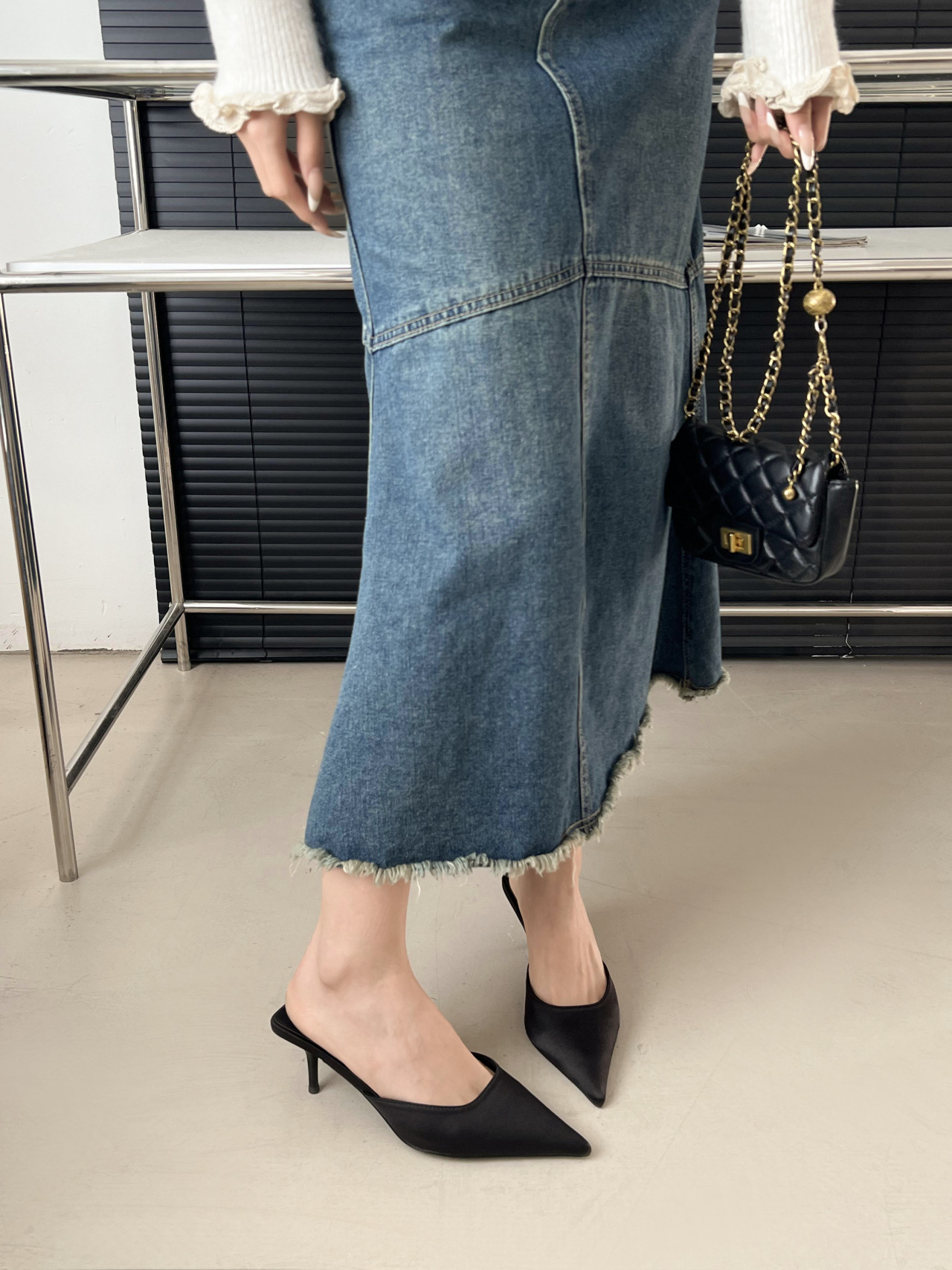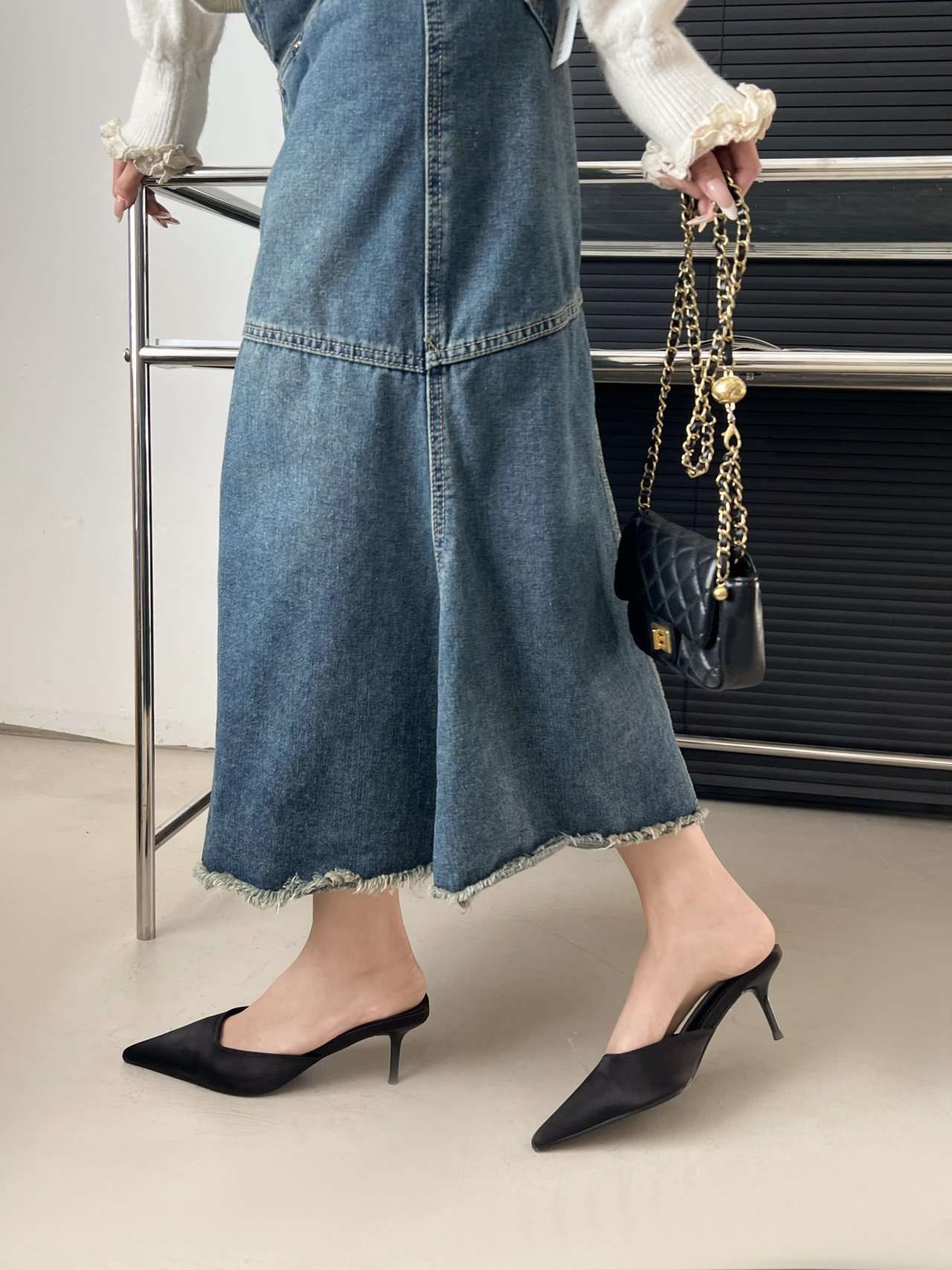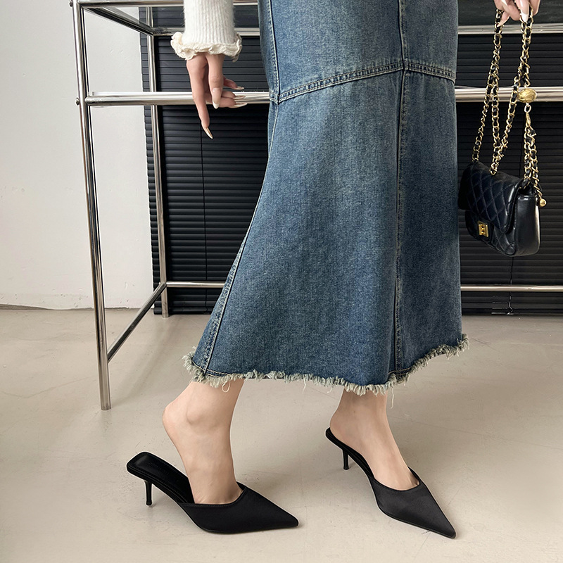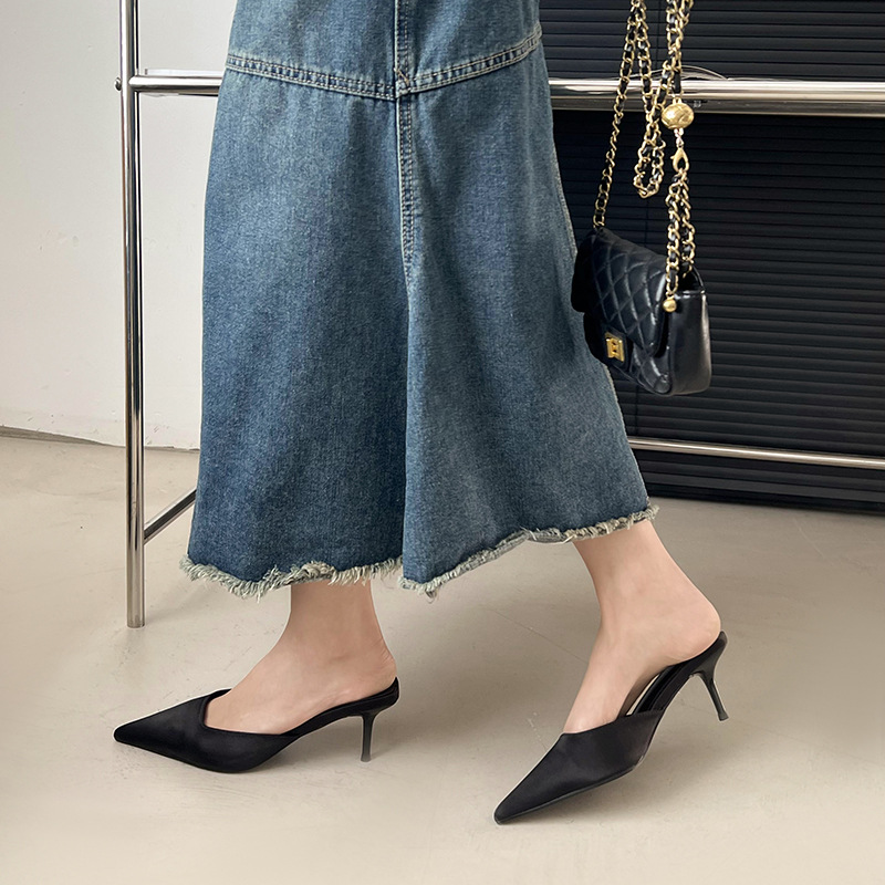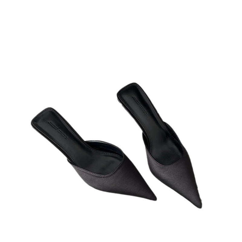 Французский темперамент Баотоу половина тапочек женская обувь носить на улице 2025 новый летний каблук заостренный черный каблуков