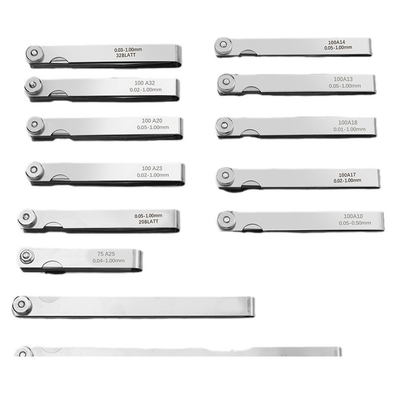 Щуп из нержавеющей стали 100A10, 0,05-0,50 мм.; Щуп из нержавеющей стали 100A13, 0,05-1,00 мм.; Щуп из нержавеющей стали 100A14, 0,05-1,00 мм.; Щуп из нержавеющей стали 100A17, 0,02–1,00 мм.; Щуп из нержавеющей стали 100A18, 0,01-1,00 мм.; Щуп из нержавеющей стали 100A20, 0,05-1,00 мм.; Щуп из нержавеющей стали 100A23, 0,02–1,00 мм.; Щуп из нержавеющей стали 100А32, 0,02–1,00 мм.; Щуп из нержавеющей стали 75А25, 0,04–1,00 мм.; Щуп из нержавеющей стали 32BLATT 0,03-1,00 мм; Щуп из нержавеющей стали 20BLATT 0,05-1,00 мм; Щуп из нержавеющей стали 150A17, 0,02–1,00 мм.; 100A26 0,02 -1 линейка из нержавеющей стали; 89A26 0.04-0.63; 200A17 щуп 0,02-1; 300A17 0.02-1; 300A25; 32 листа латуни; 32 штуки без латунных вставок; 16 штук локтевой щуп