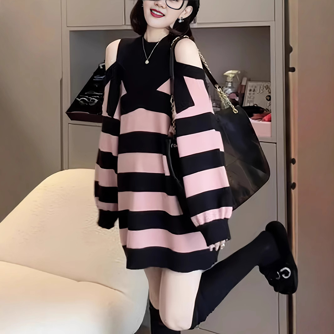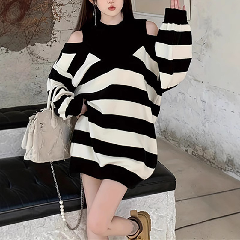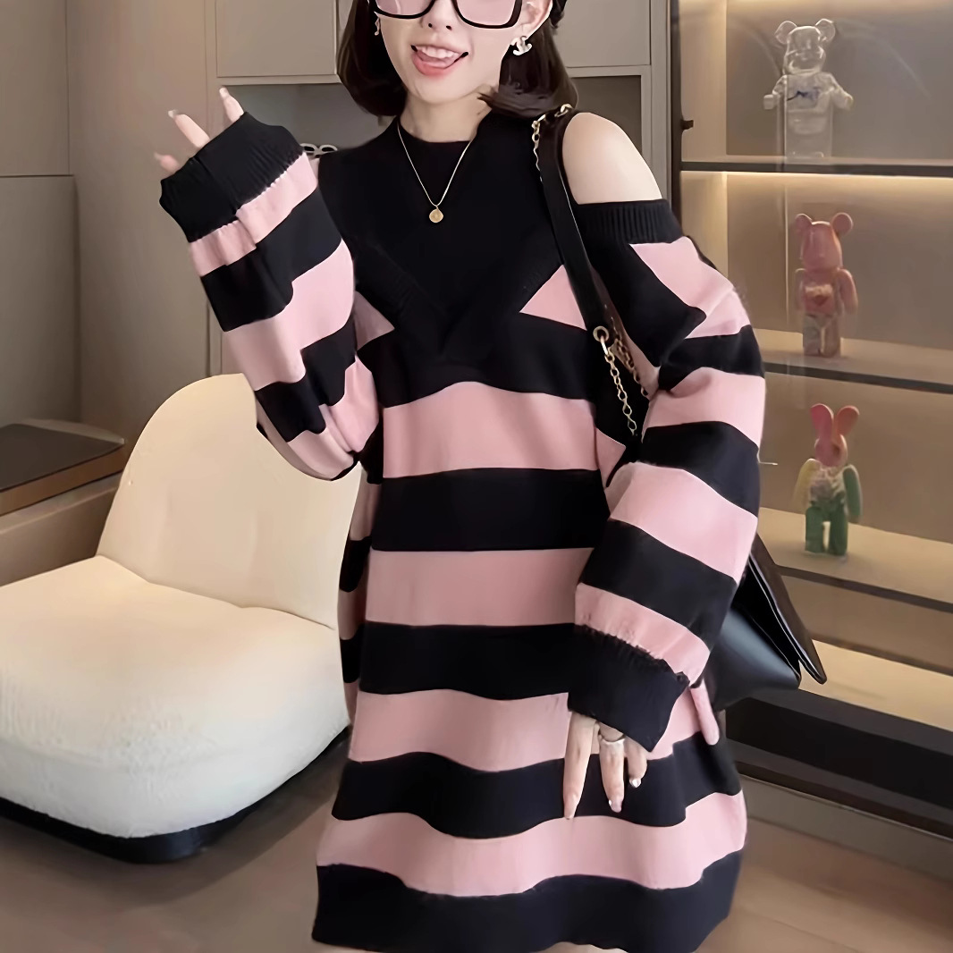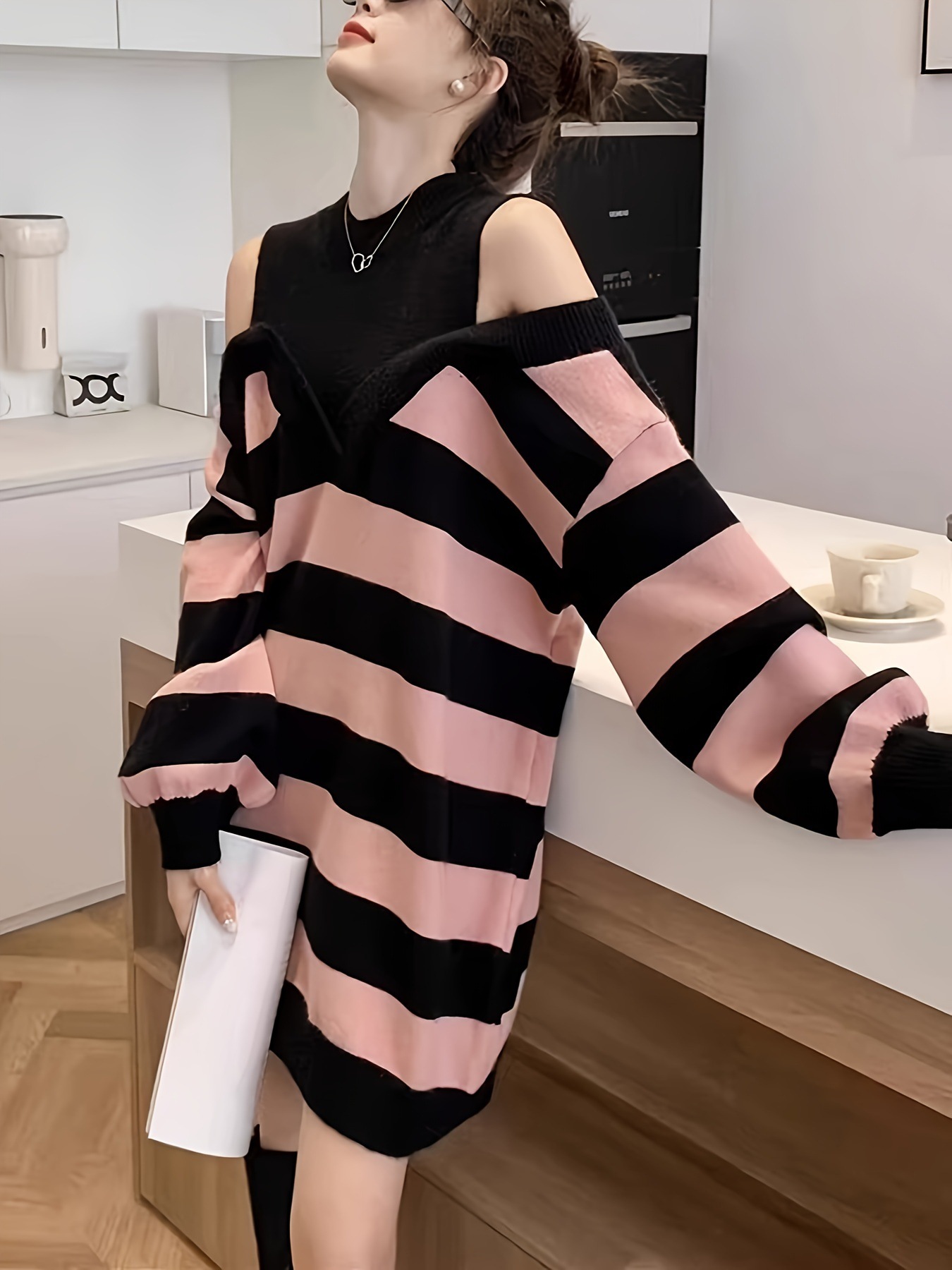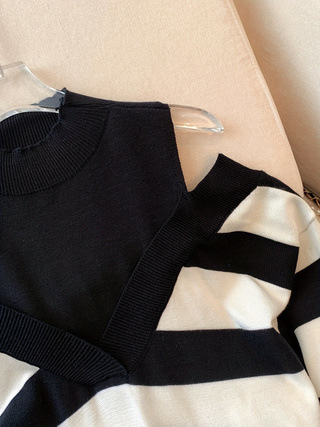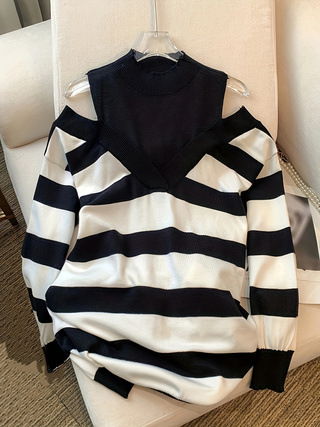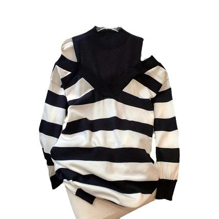 Хит Amazon для международных продаж: женский вязаный топ в полоску, имитация двухслойного дизайна, весна-осень 2025, нишевый дизайн с открытыми плечами и элементами пэчворк