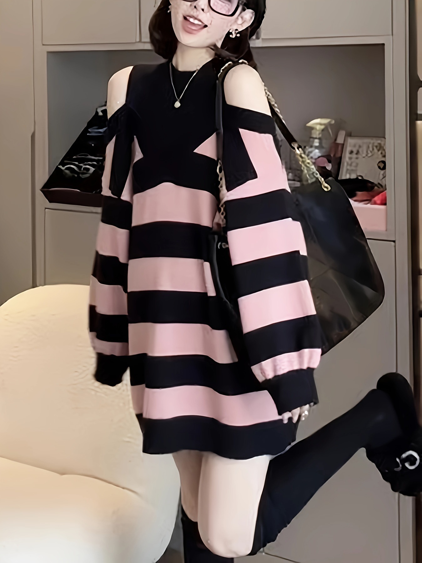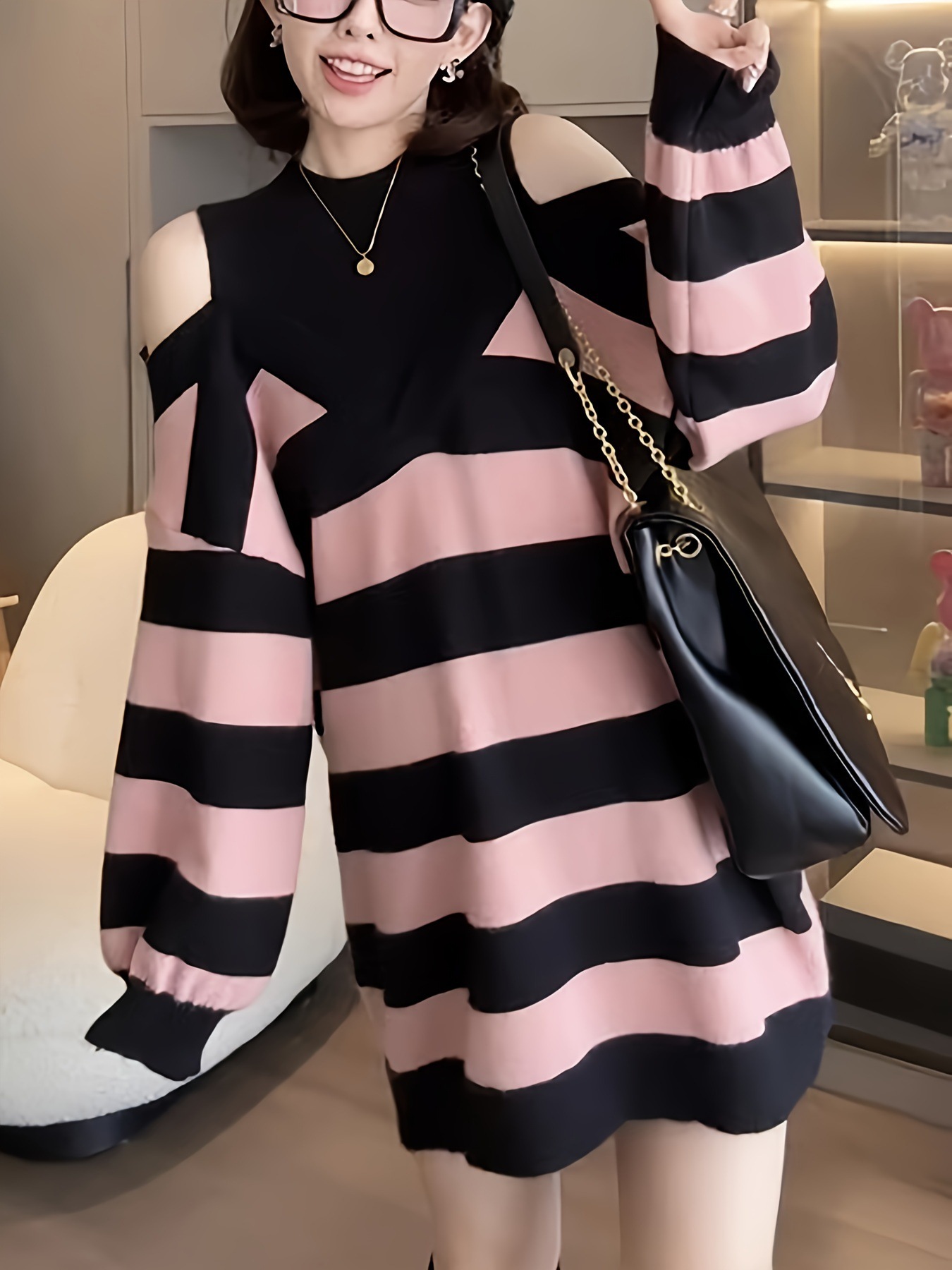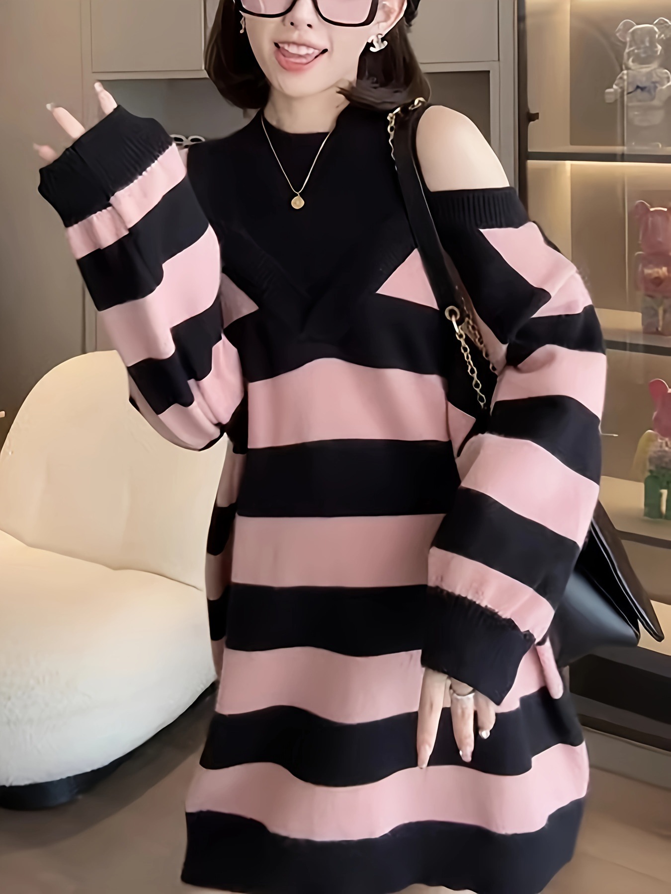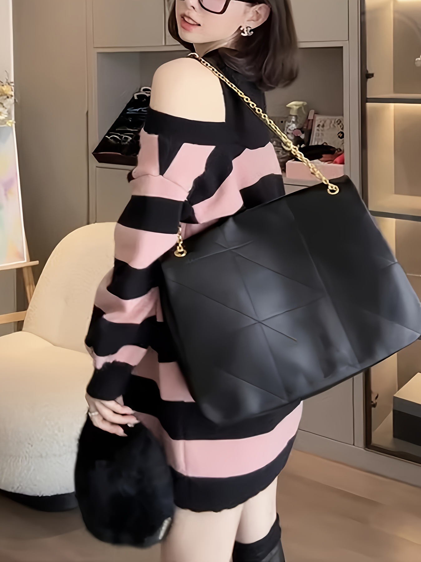 Хит Amazon для международных продаж: женский вязаный топ в полоску, имитация двухслойного дизайна, весна-осень 2025, нишевый дизайн с открытыми плечами и элементами пэчворк