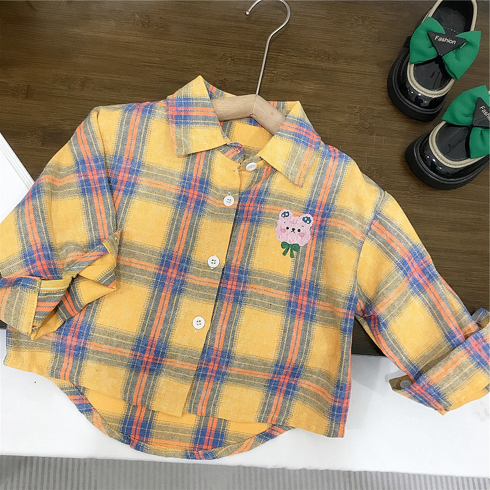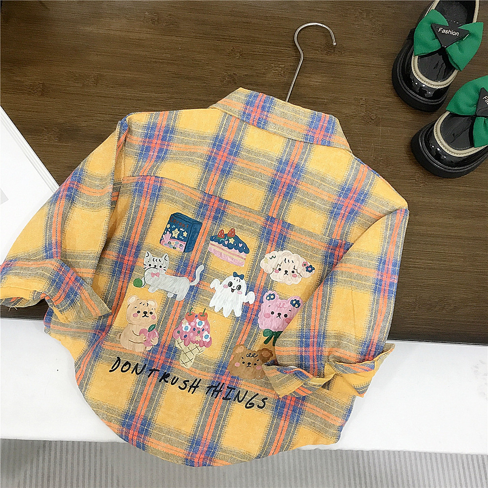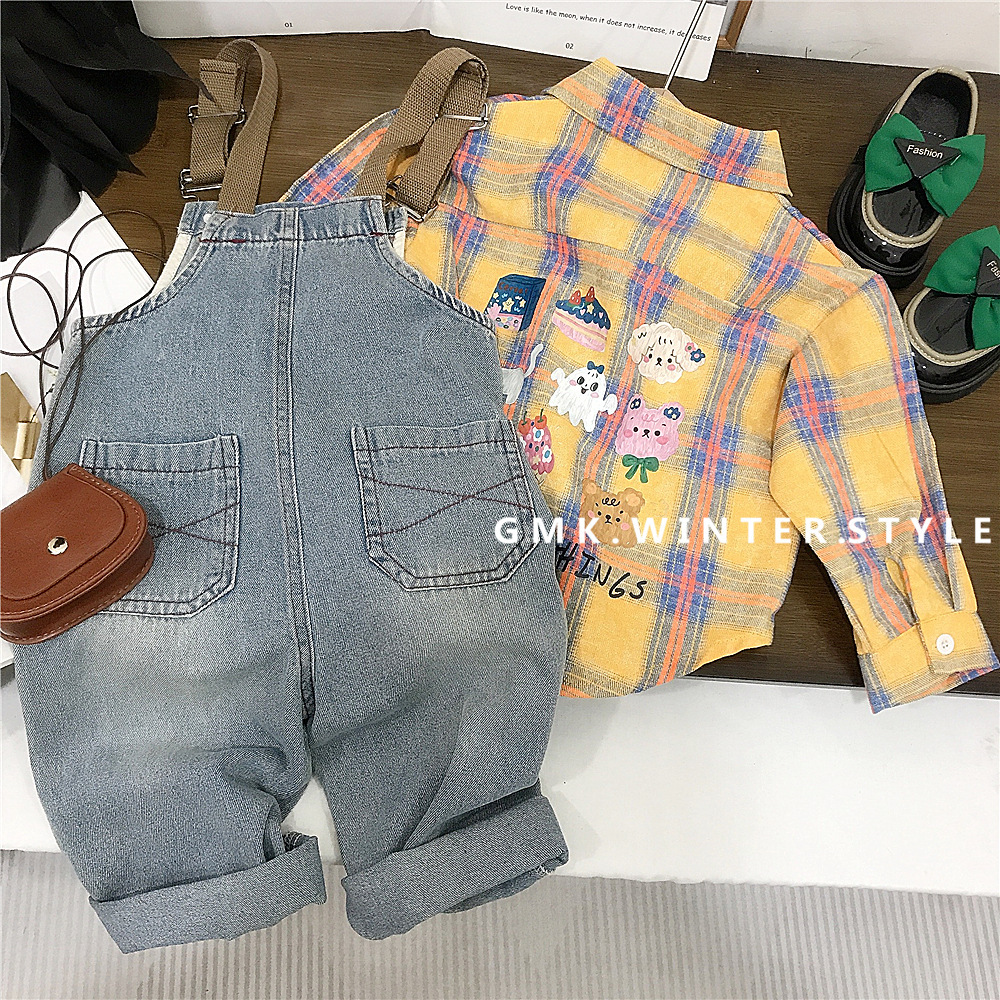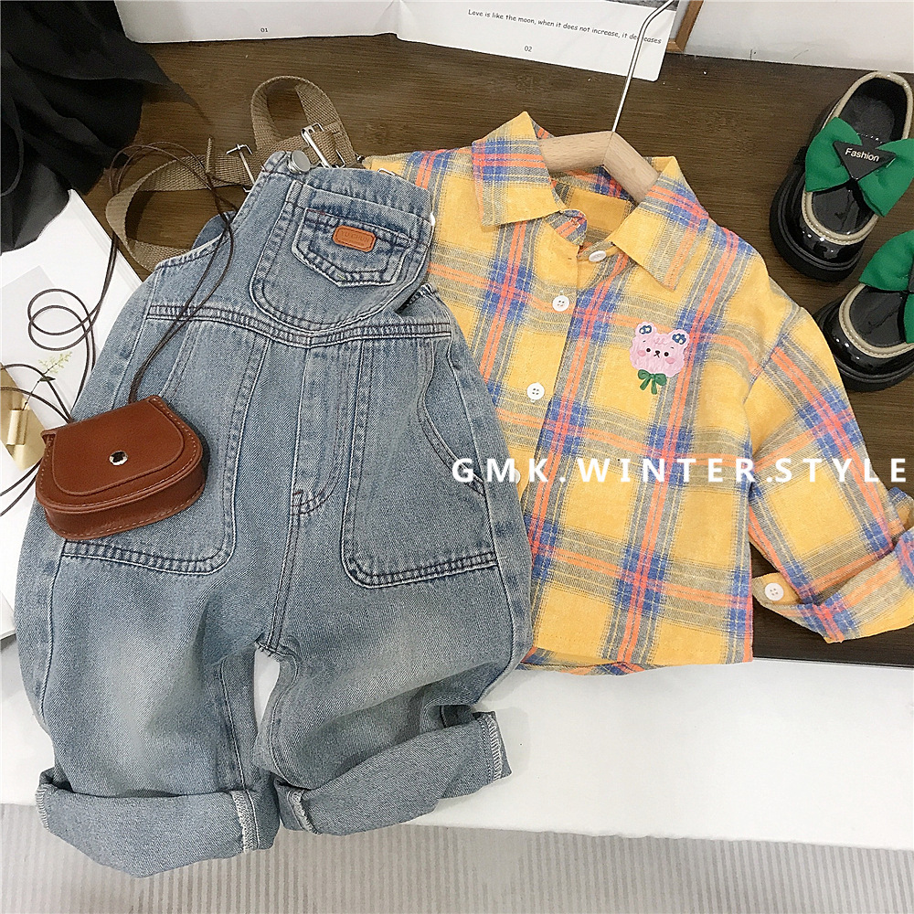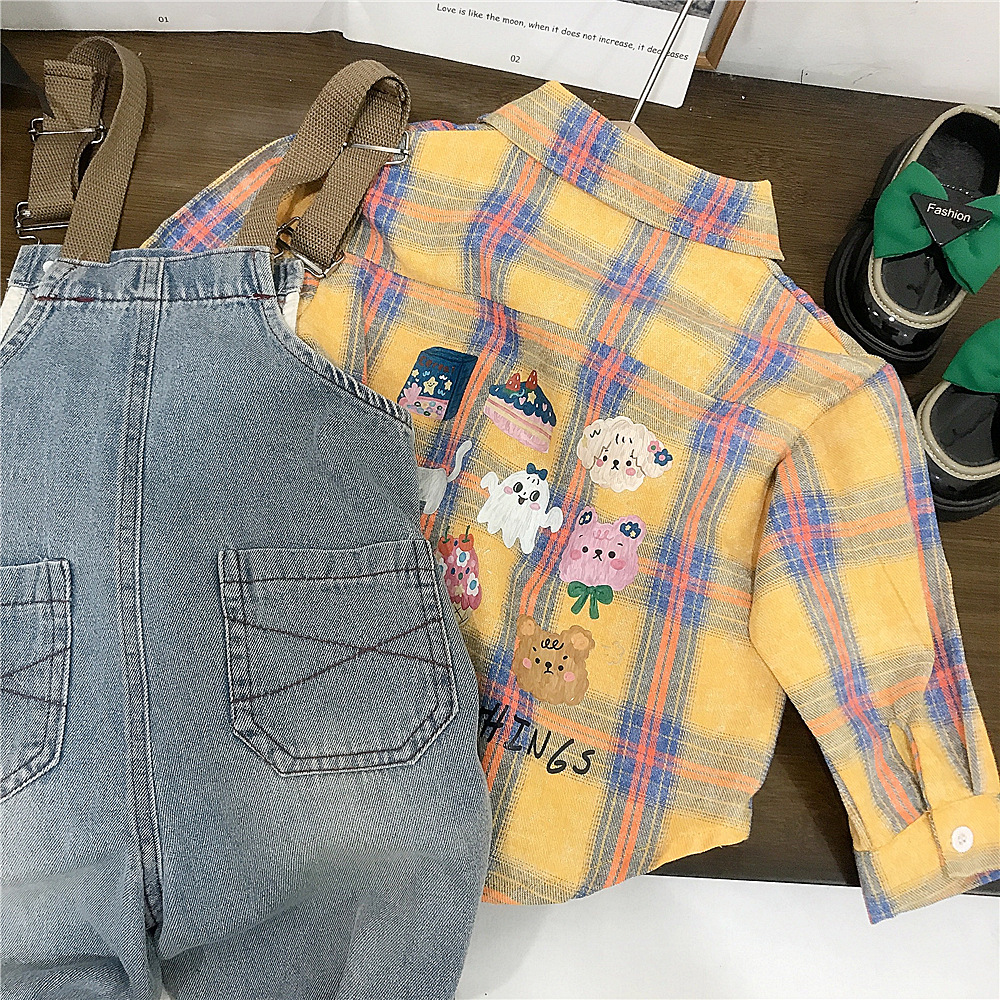 Девушки весенний и осенний новый набор детской одежды осенняя детская мультяшная клетчатая рубашка ретро старый джинсовая спина внешней торговли