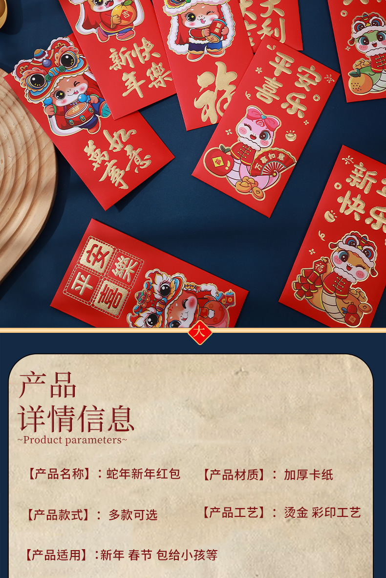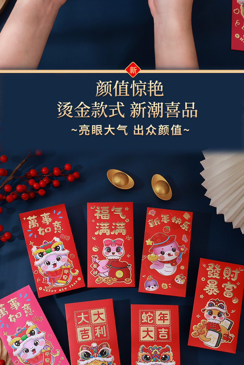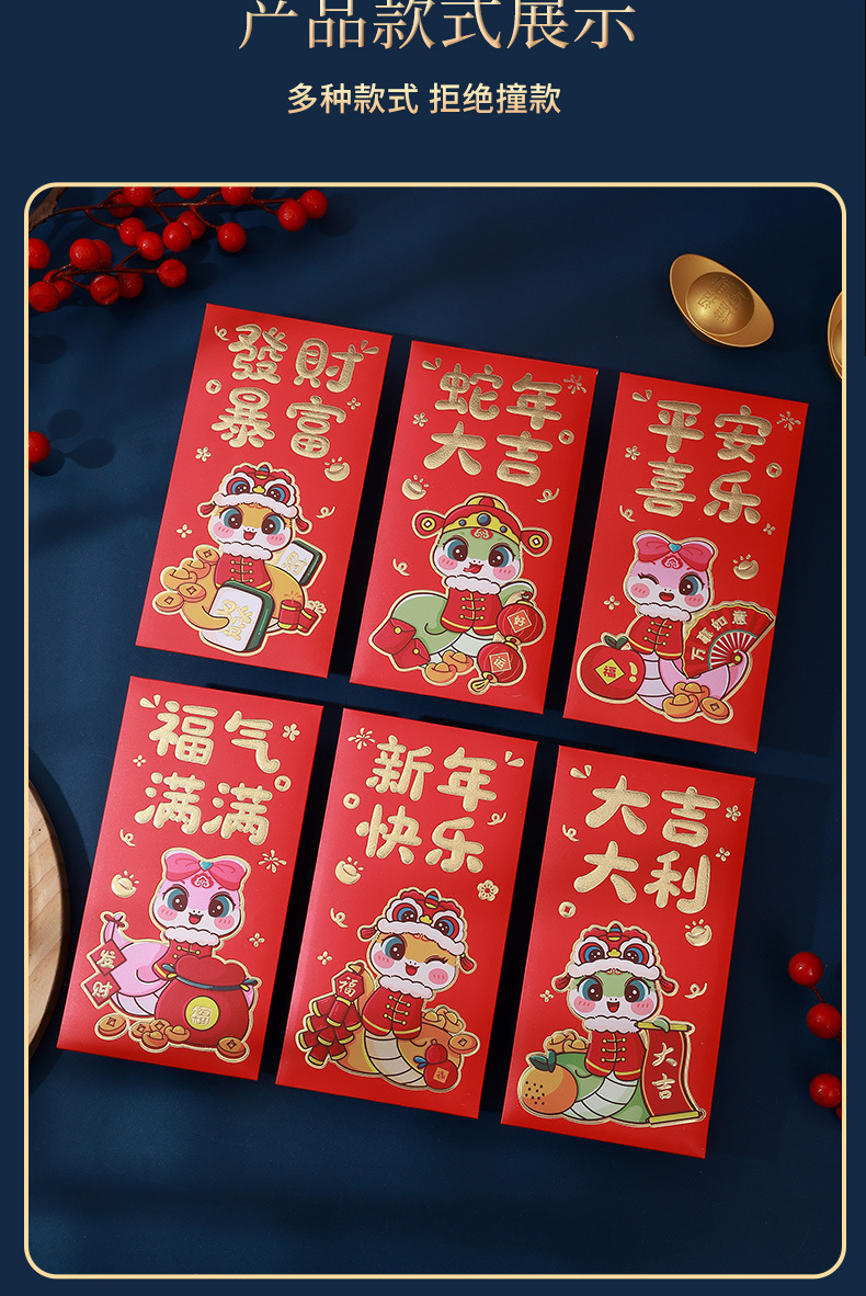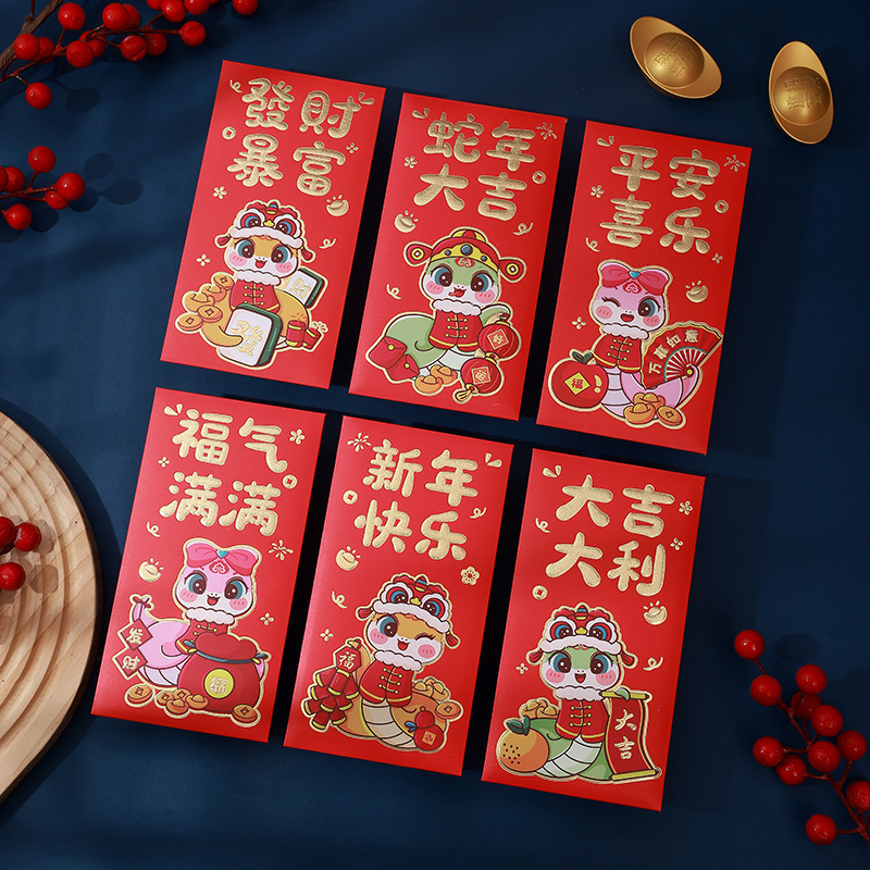 Удачи в год змеи (упаковка из 6 шт.); Год Змеи становится богатым (упаковка из 6 шт.); Змеиные годы радости (упаковка из 6 шт.); Комбинация конверта года «Змеиный красный» (24 шт.)