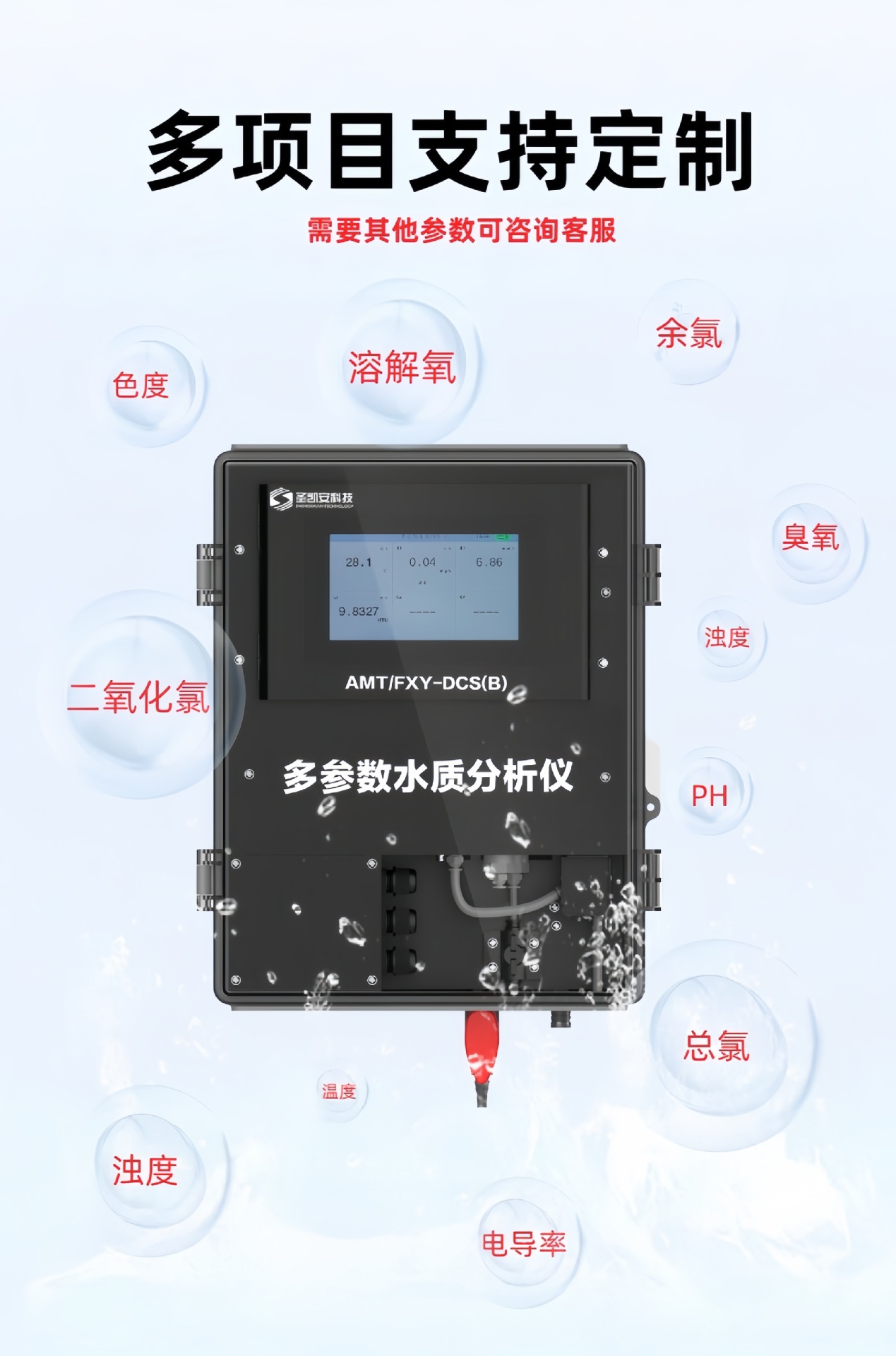 Монитор вторичного подачи воды; PH; ORP; Растворить кислород; Амиачный азот; остаточный хлор; мутность; COD; проводимость; Цвет; Многопараметрический монитор качества воды; Для получения информации о других параметрах обратитесь в службу поддержки клиентов.