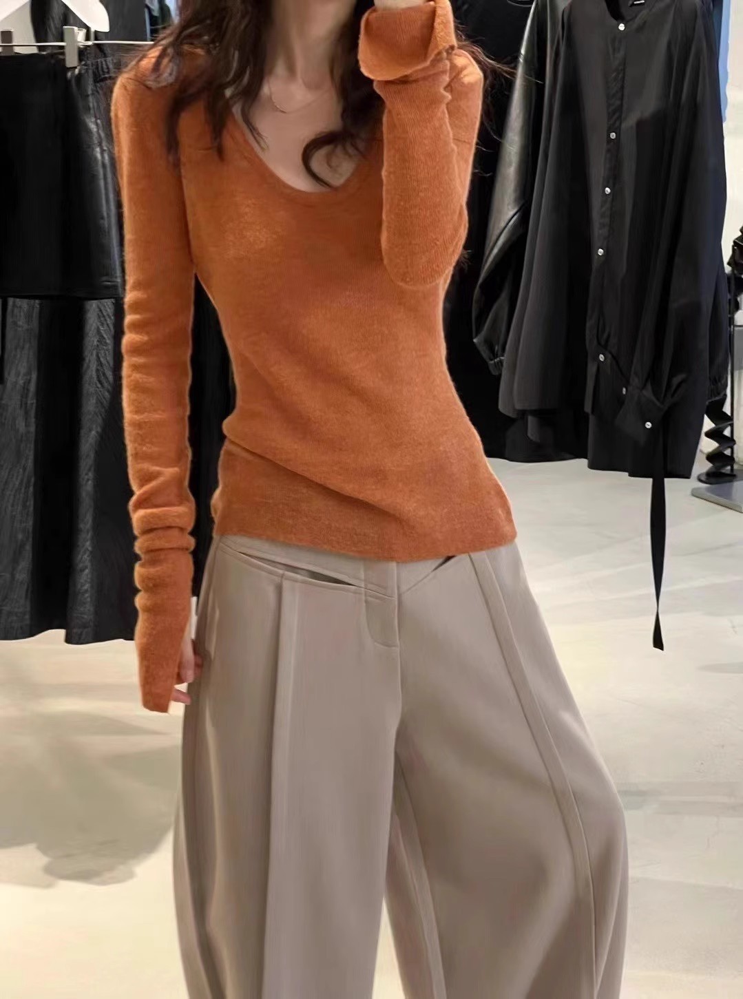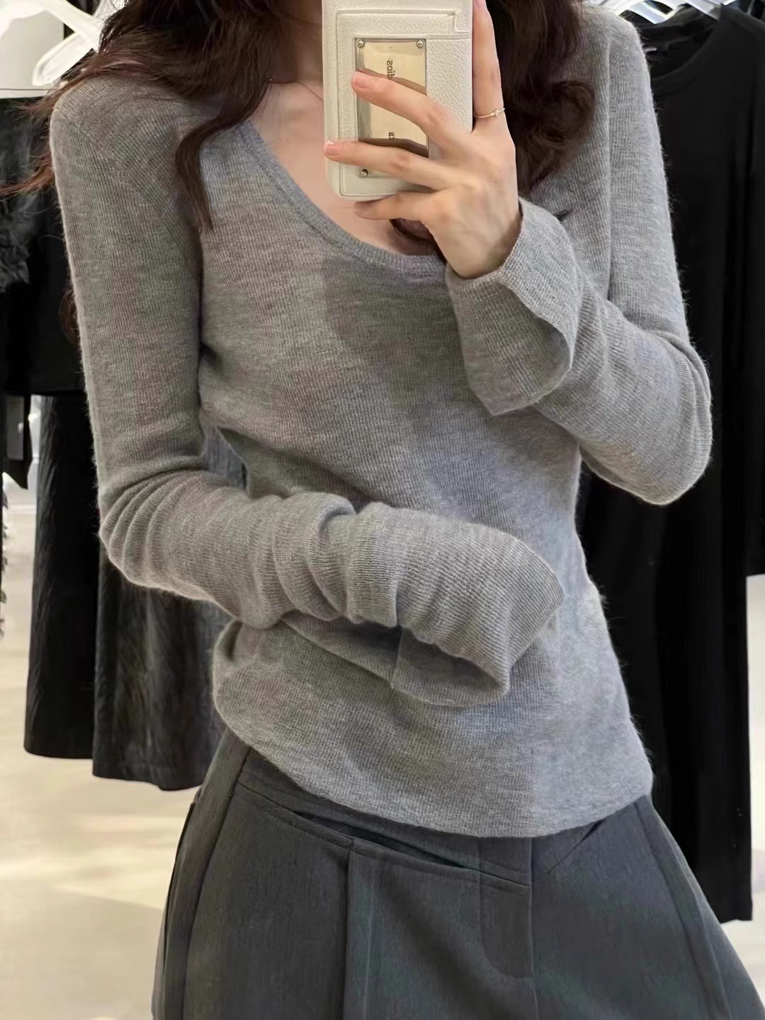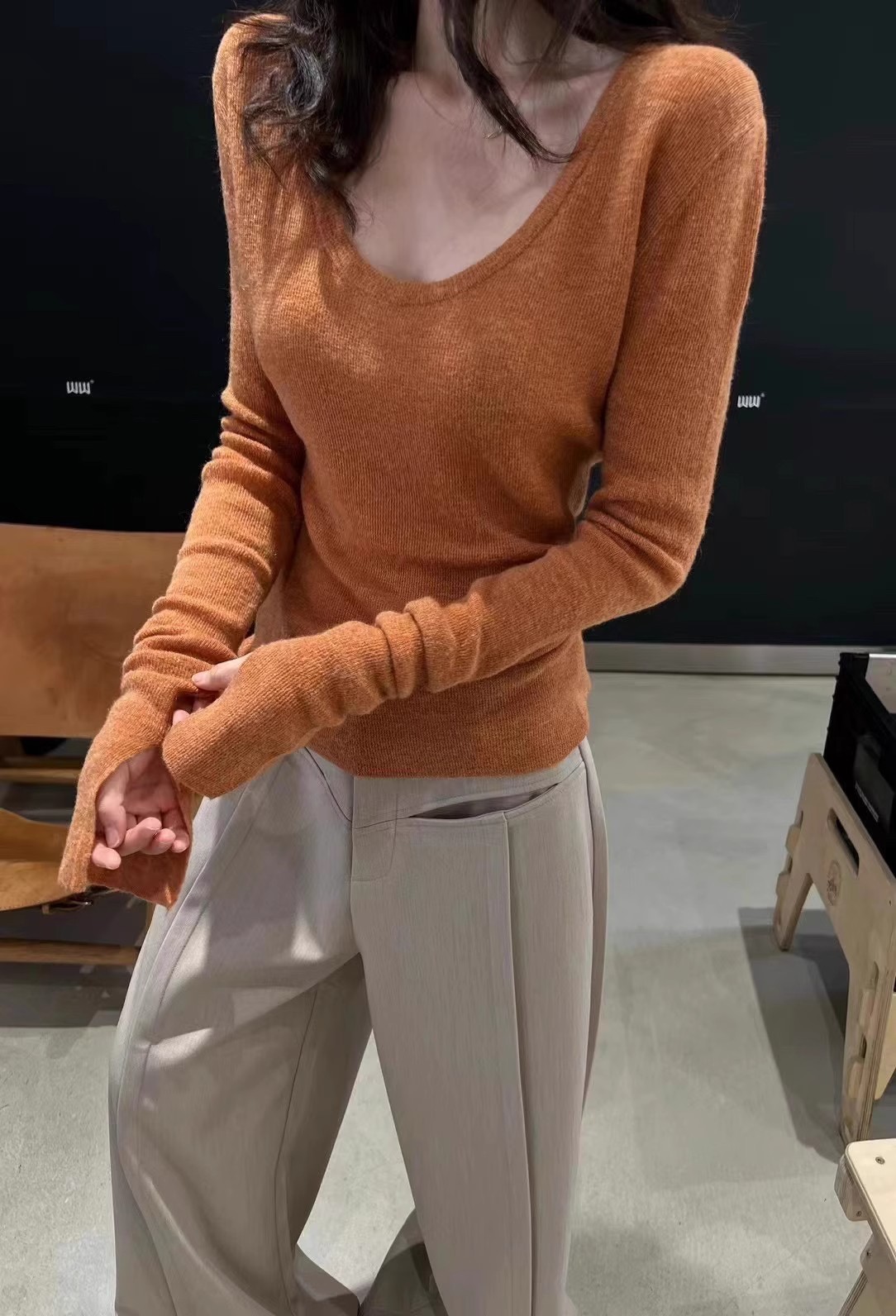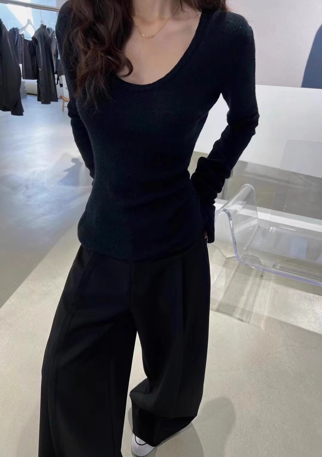 2024 осень и зима новые пригородные минималистские сплошные мягкие клейкие U-образные воротники тонкое тело с длинными рукавами шерстяная трикотажная нижняя рубашка женская