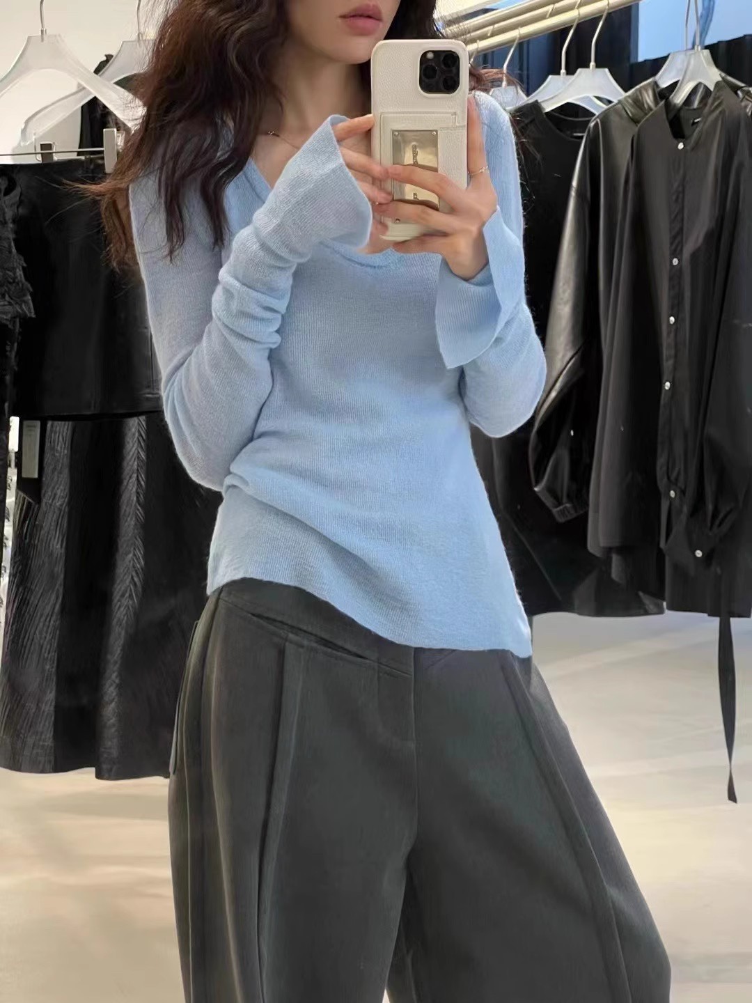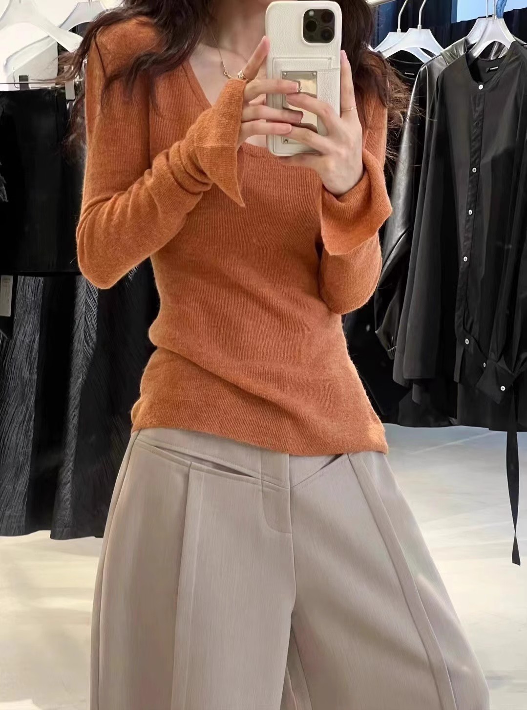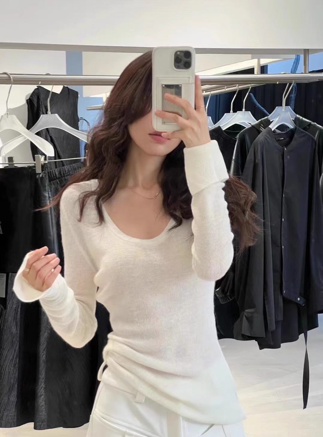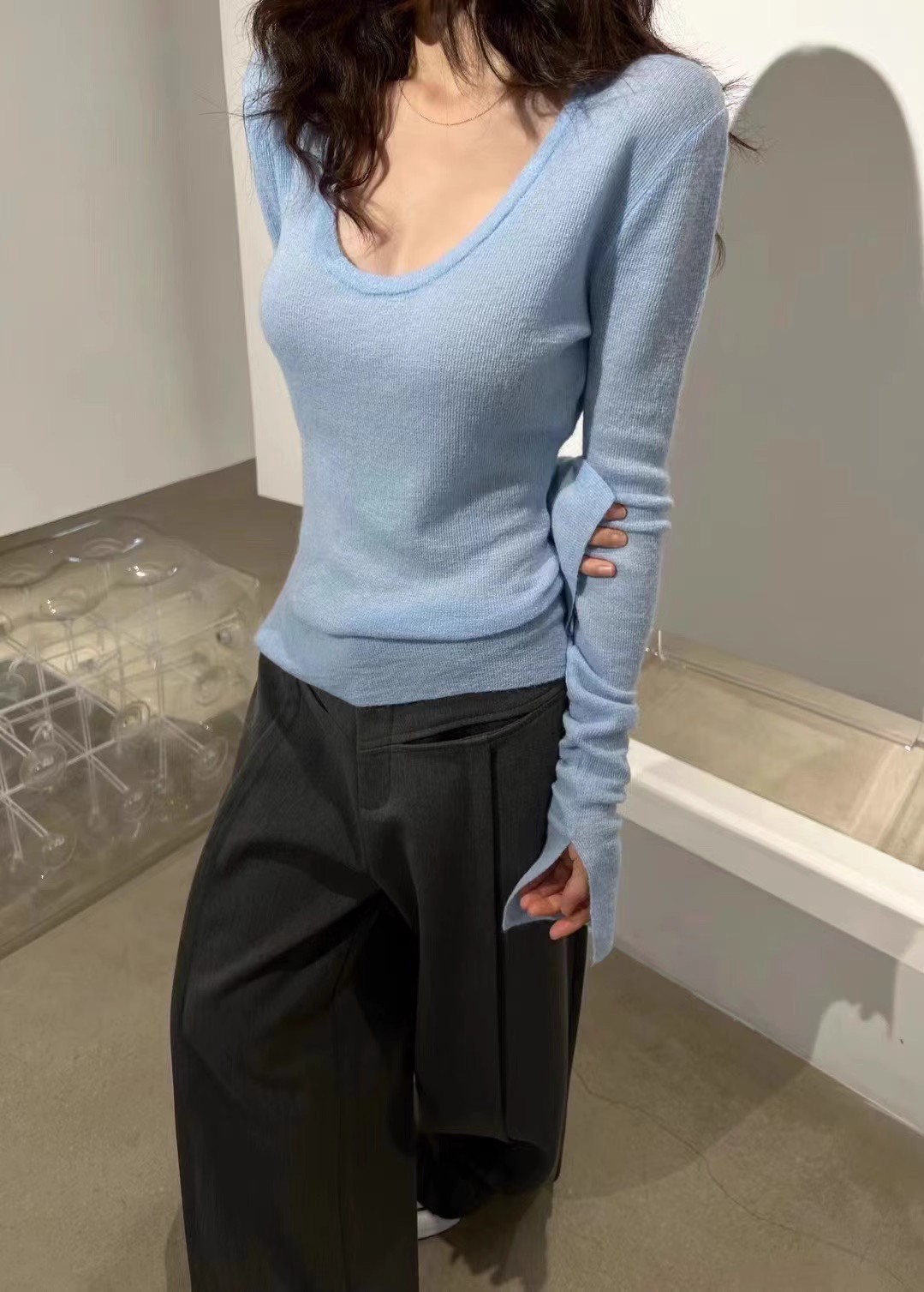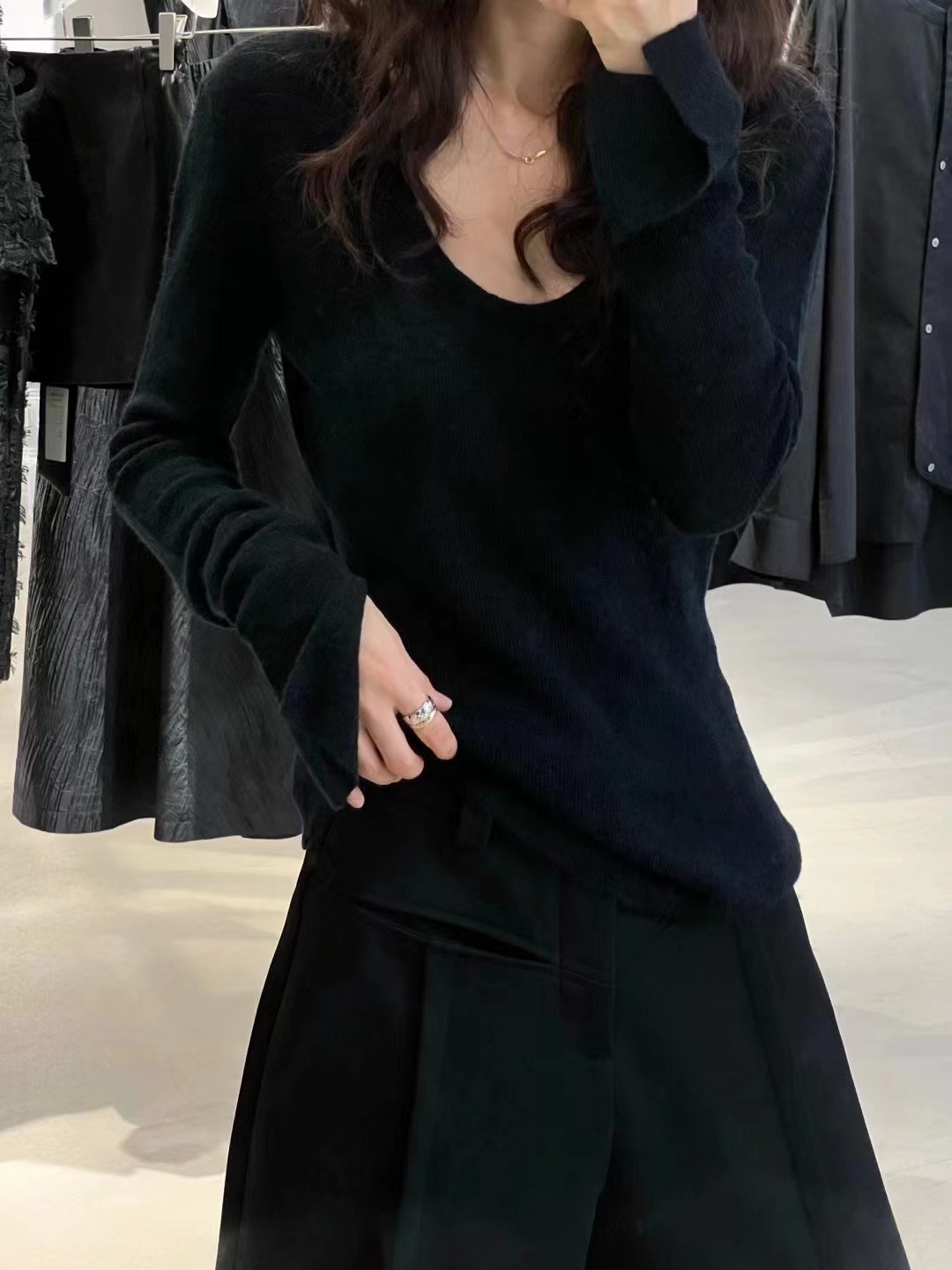 2024 осень и зима новые пригородные минималистские сплошные мягкие клейкие U-образные воротники тонкое тело с длинными рукавами шерстяная трикотажная нижняя рубашка женская