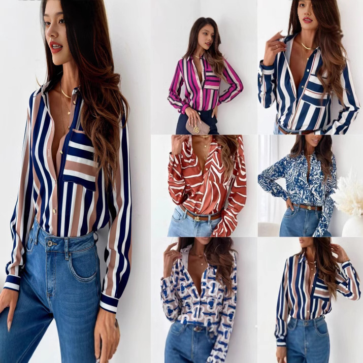 Трансграничная независимая станция 3D печатная мода весна и осень в полоску с длинными рукавами отворот карман леди рубашка pod один на заказ