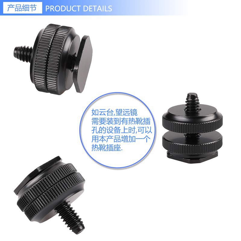 对于底部只有标准1/4"螺孔的产品,如相机,尼康SC-28 TTL线,永诺CTR-301P无线引闪器,需要装到有热靴插孔的设备上时,可以用本产品增加一个热靴插座。