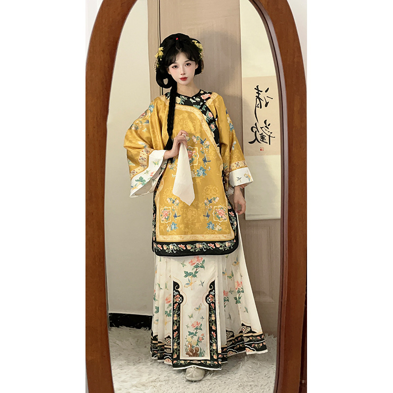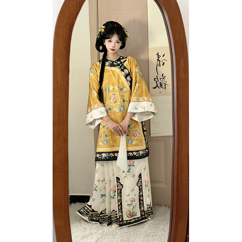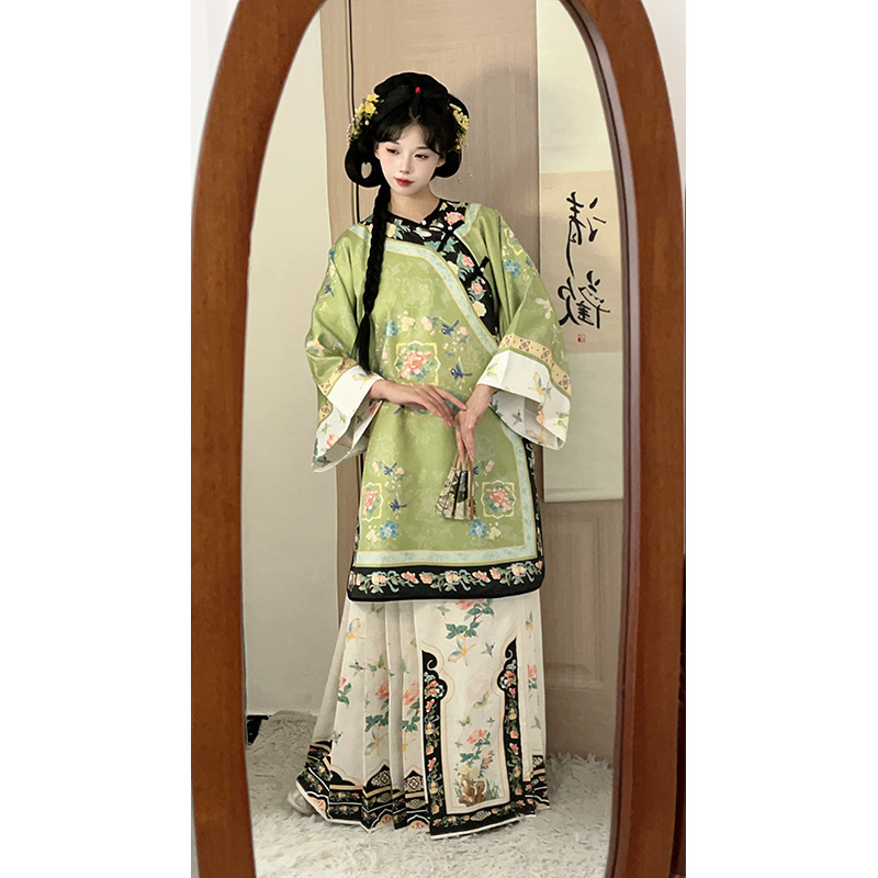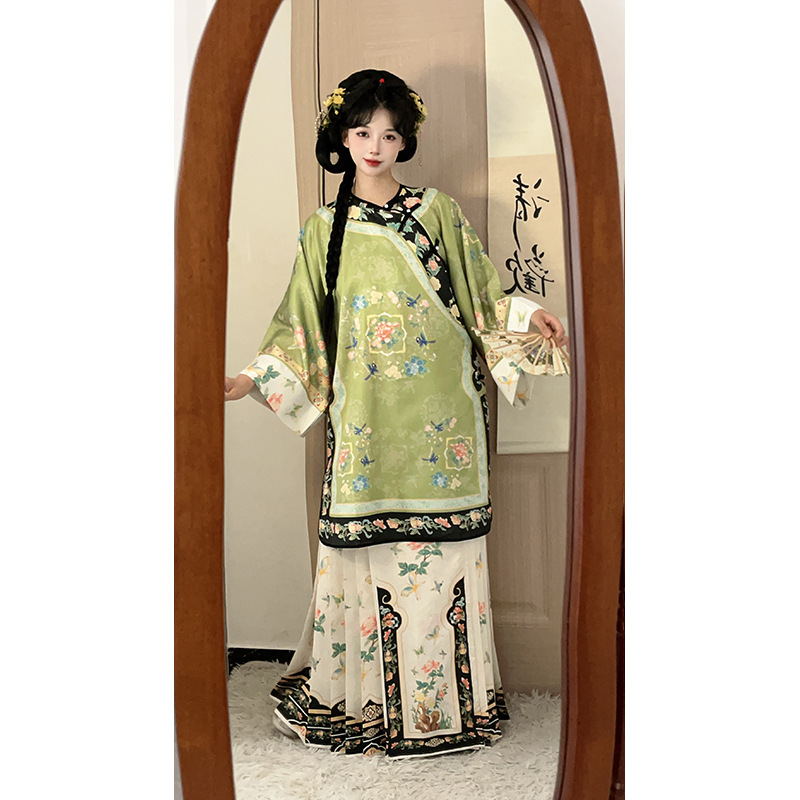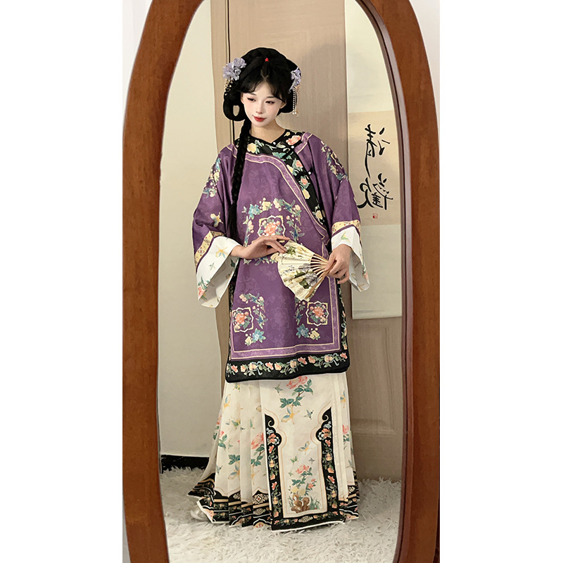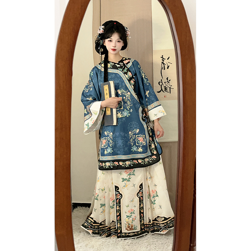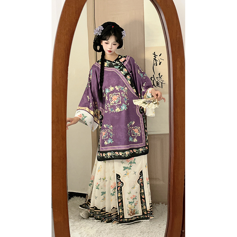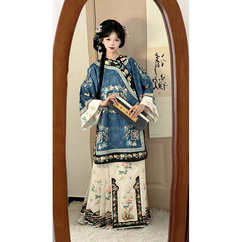 Новый осенний и зимний костюм в клетку Hanfu династии Цин с диагональным круглым вырезом