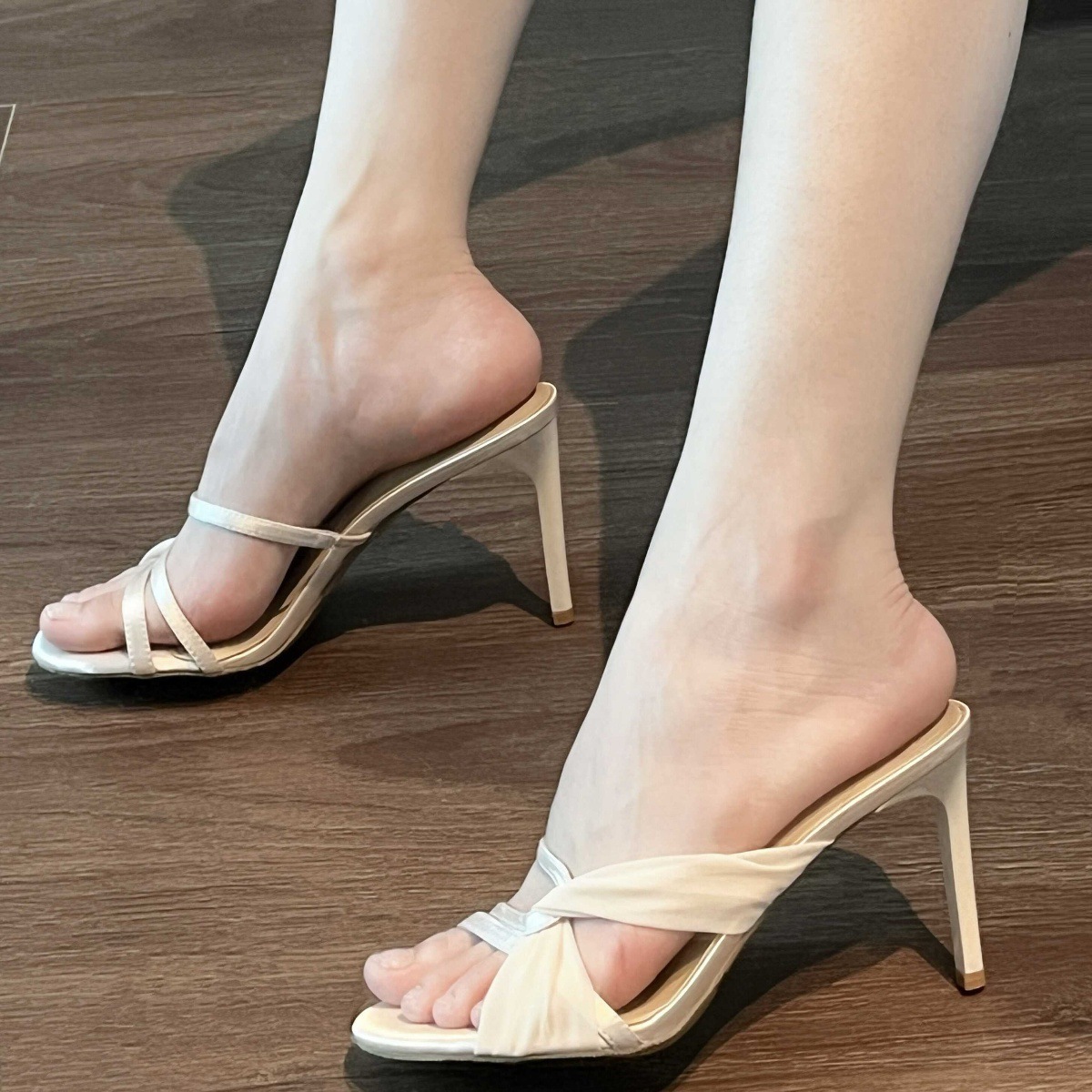 2024 Летняя новая сетчатая пряжа с круглой головкой со скрещенными ремешками сандалии женские каблуки на высоких каблуках холодные тапочки фея ветра