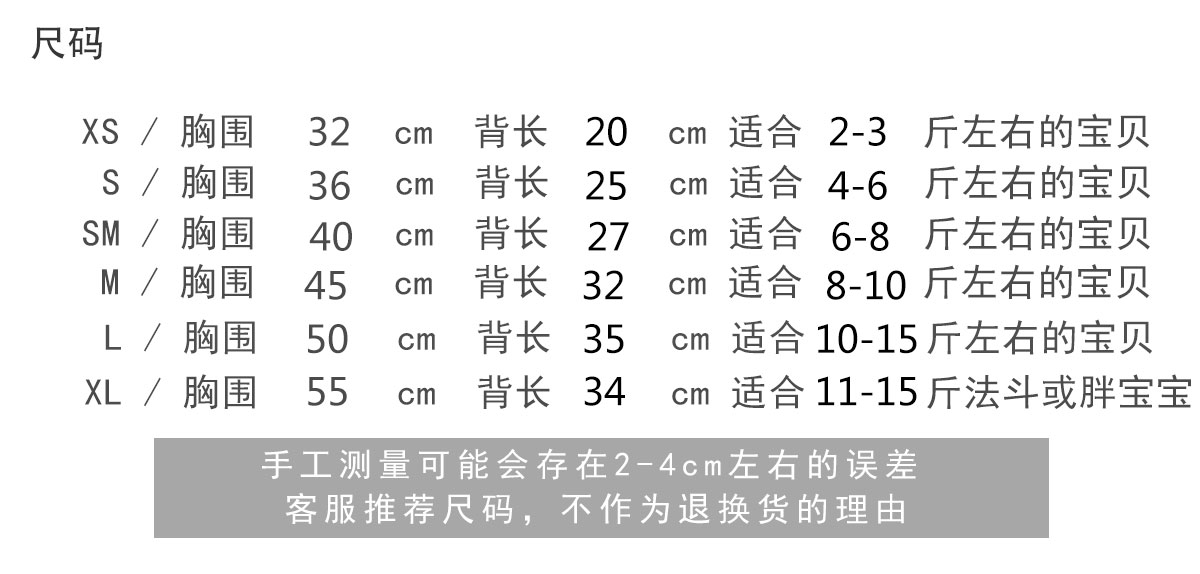 Грудь XS 32, длина 20, рекомендуется 1.0-1.5kg; S, обхват груди 36, длина 25, рекомендуется 2-3kg; SM Грудь 40, длина 27, рекомендуется 3-4kg; Грудь М 44, рекомендуемая длина 28, 4-5kg; L Грудь 50 см Длина 30 см Рекомендуется 5-7.5kg; Грудь XL длиной 52 см, 31 кг, французский бульдог или толстая собака.; Рекомендуется носить пуловер, пуговицы из марлевого материала плотно прилегают.; Жилет короткий