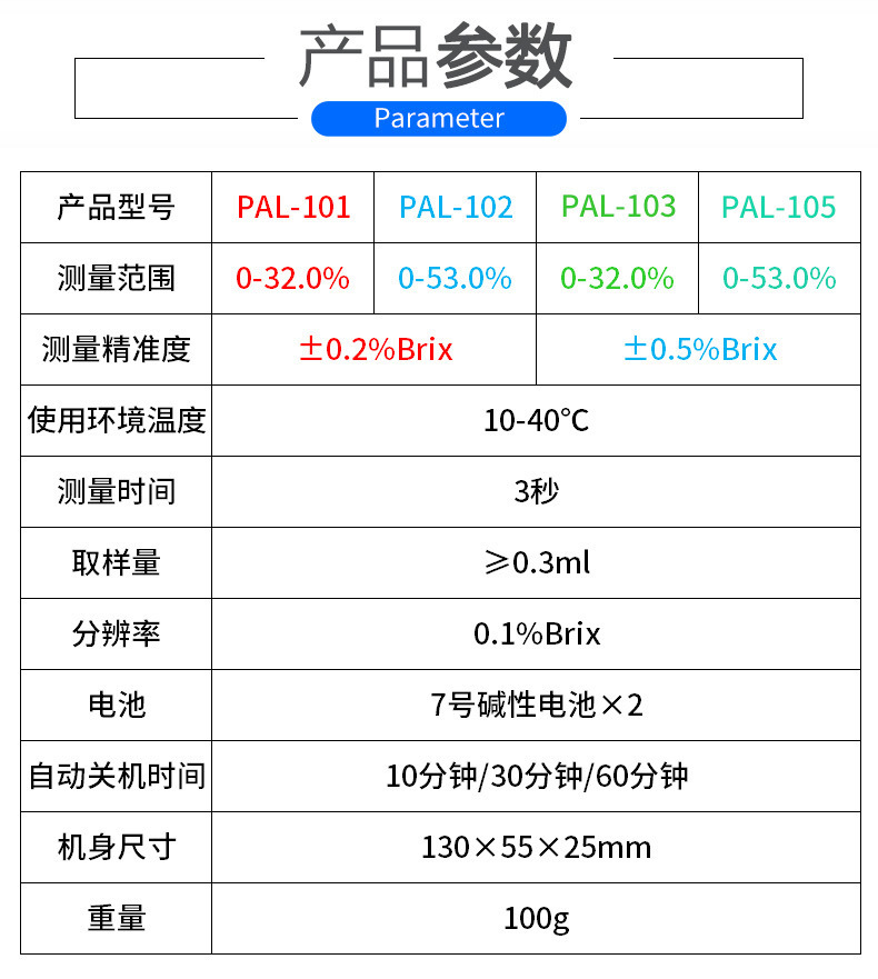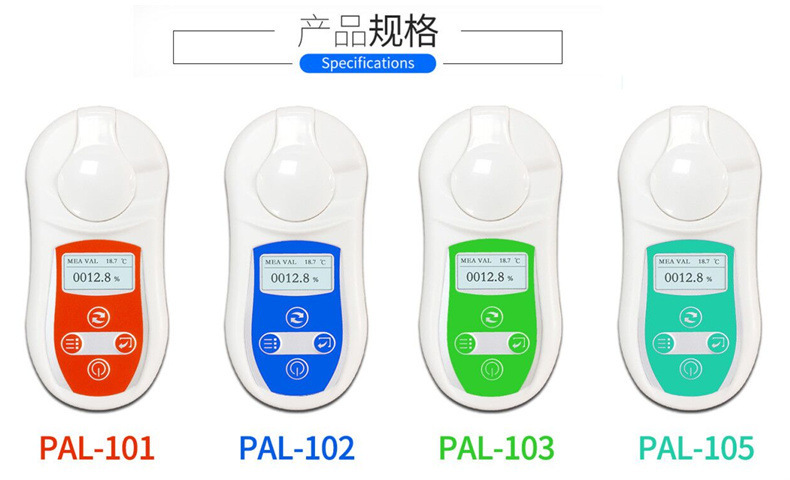 Диапазон PAL-101 0-32% погрешность 0,2% + соковыжималка в комплекте.; Диапазон PAL-102 0-53% погрешность 0,2% + соковыжималка в комплекте.; Диапазон PAL-103 0-32% погрешность 0,5% + соковыжималка в комплекте.; Диапазон PAL-105 0-53% погрешность 0,5% + соковыжималка в комплекте