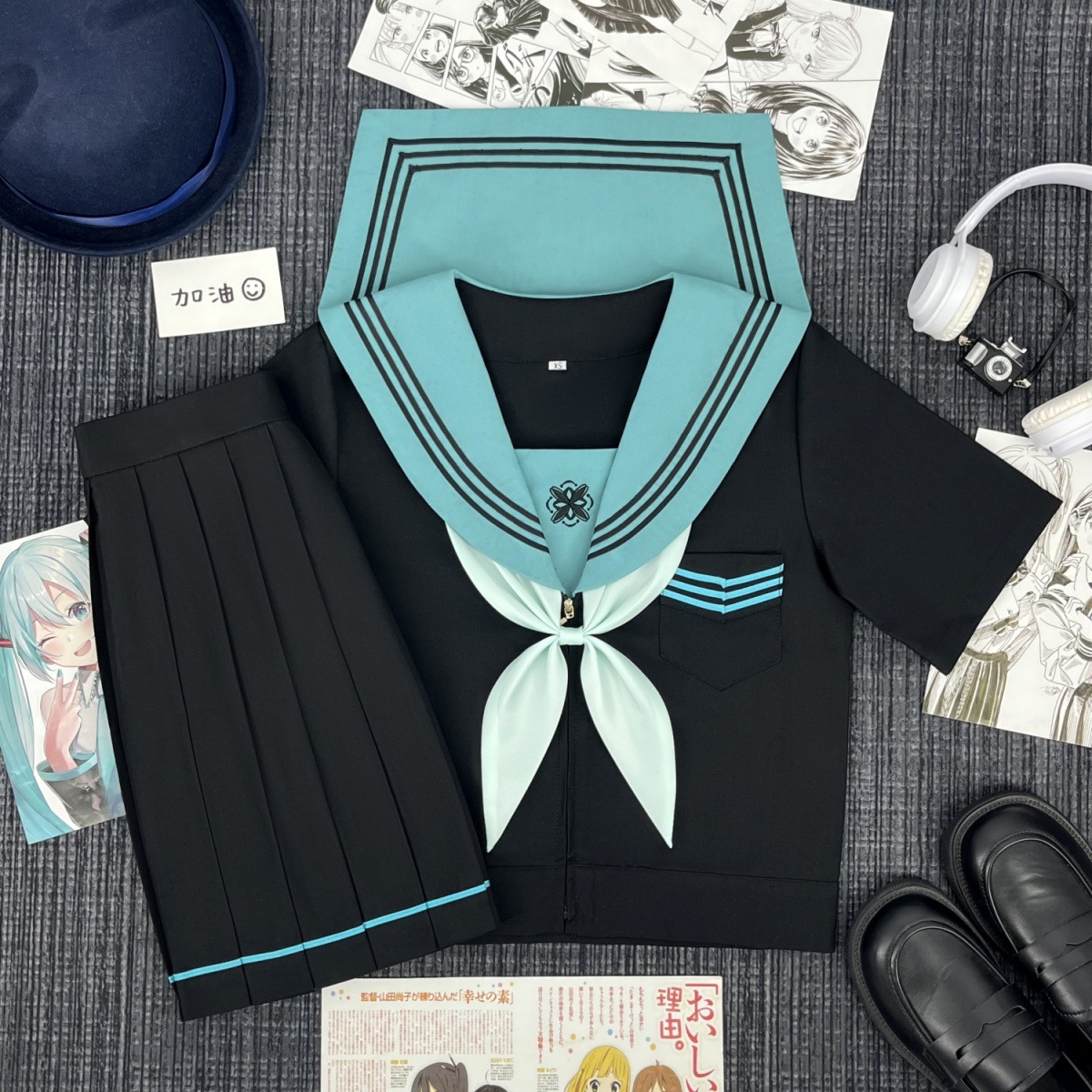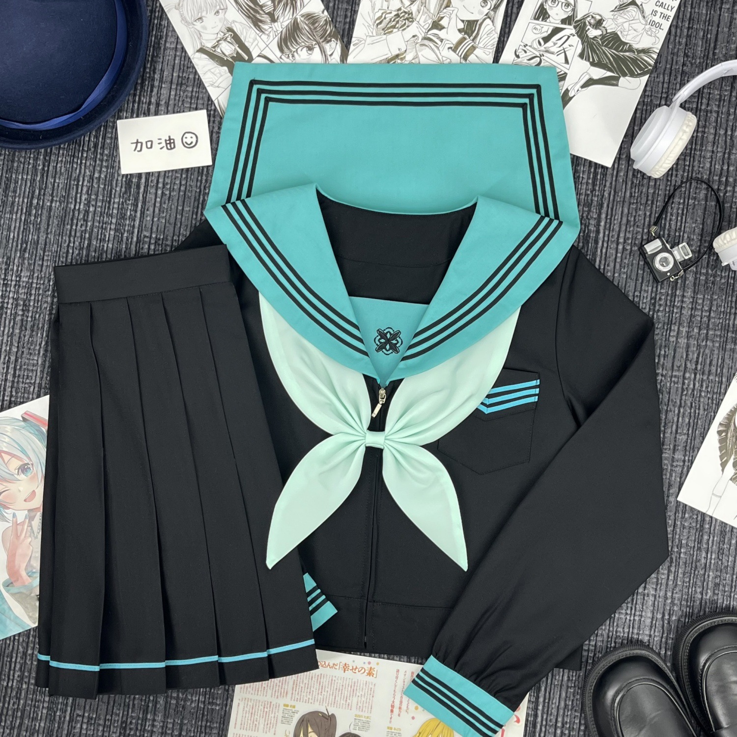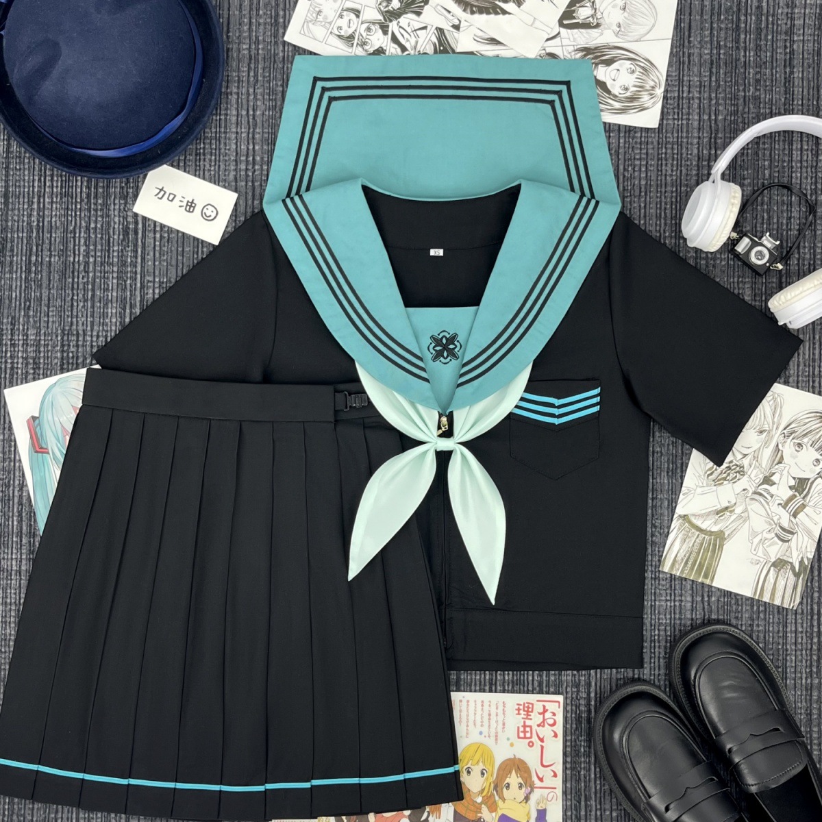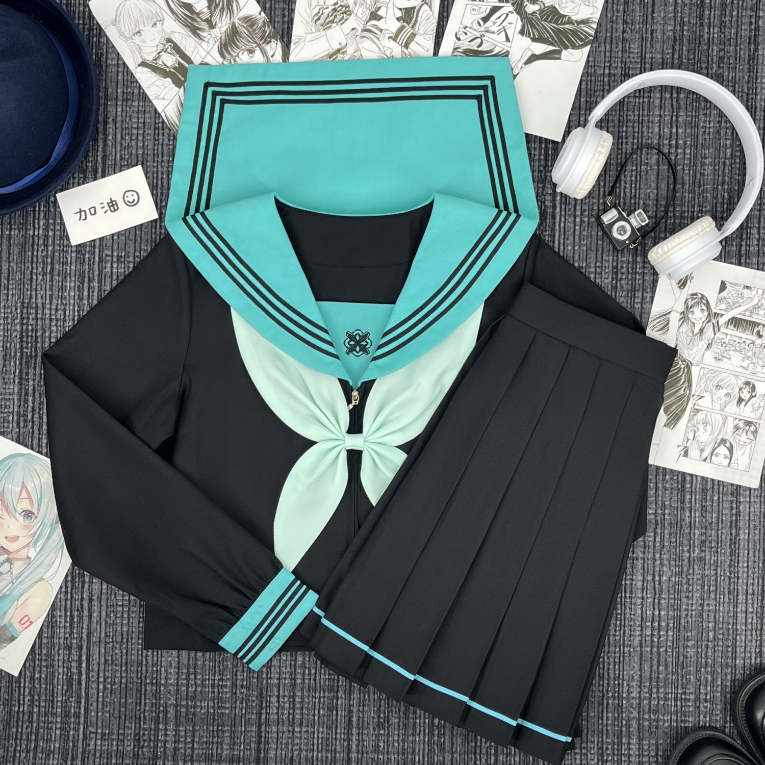 Qingli с длинными рукавами + узел золотой рыбки травяного зеленого цвета + юбка в тон; Qingli с короткими рукавами + узел золотой рыбки травяного зеленого цвета + юбка в тон; Qingli с длинными рукавами + узел золотой рыбки травяного зеленого цвета; Цинли с короткими рукавами + узел золотой рыбки травяного зеленого цвета; Черная юбка с зелеными полосками + носки