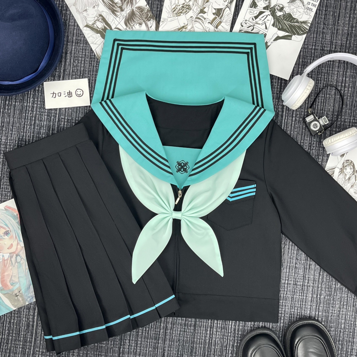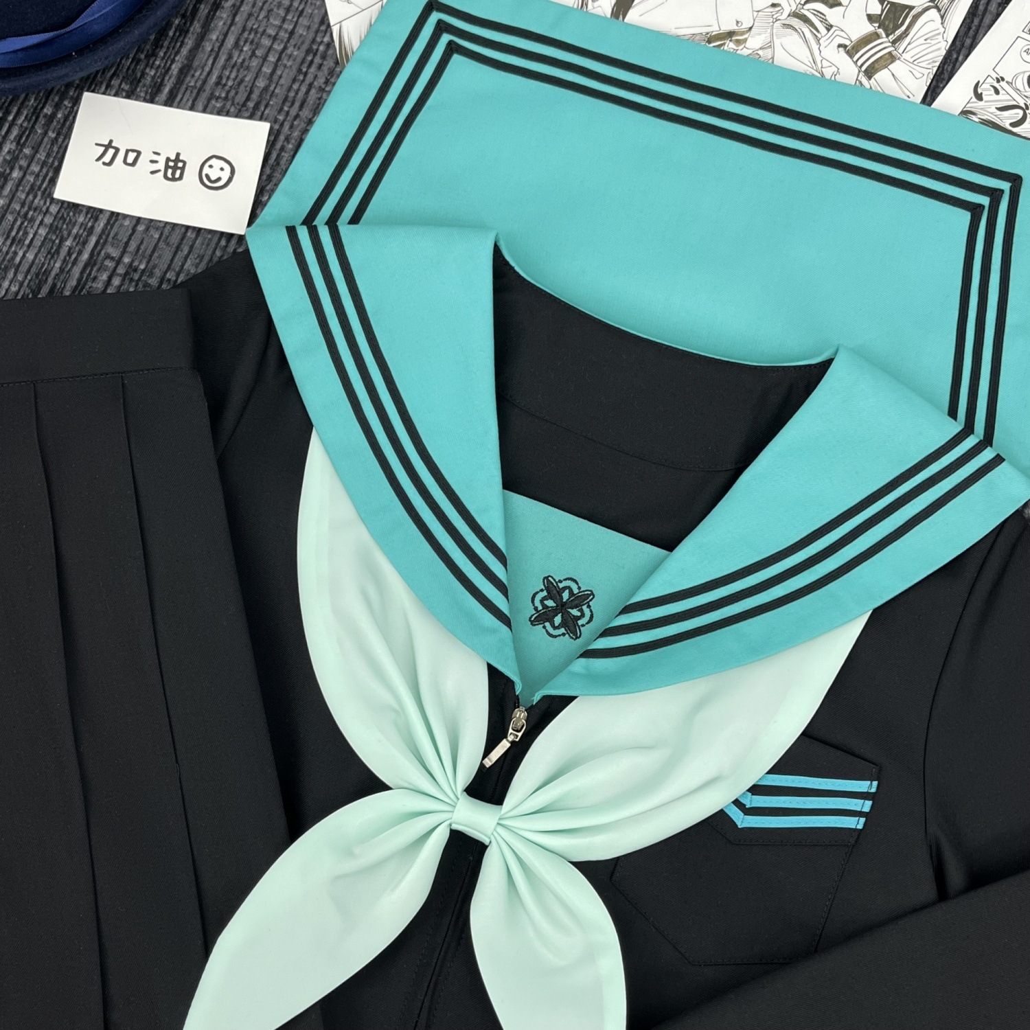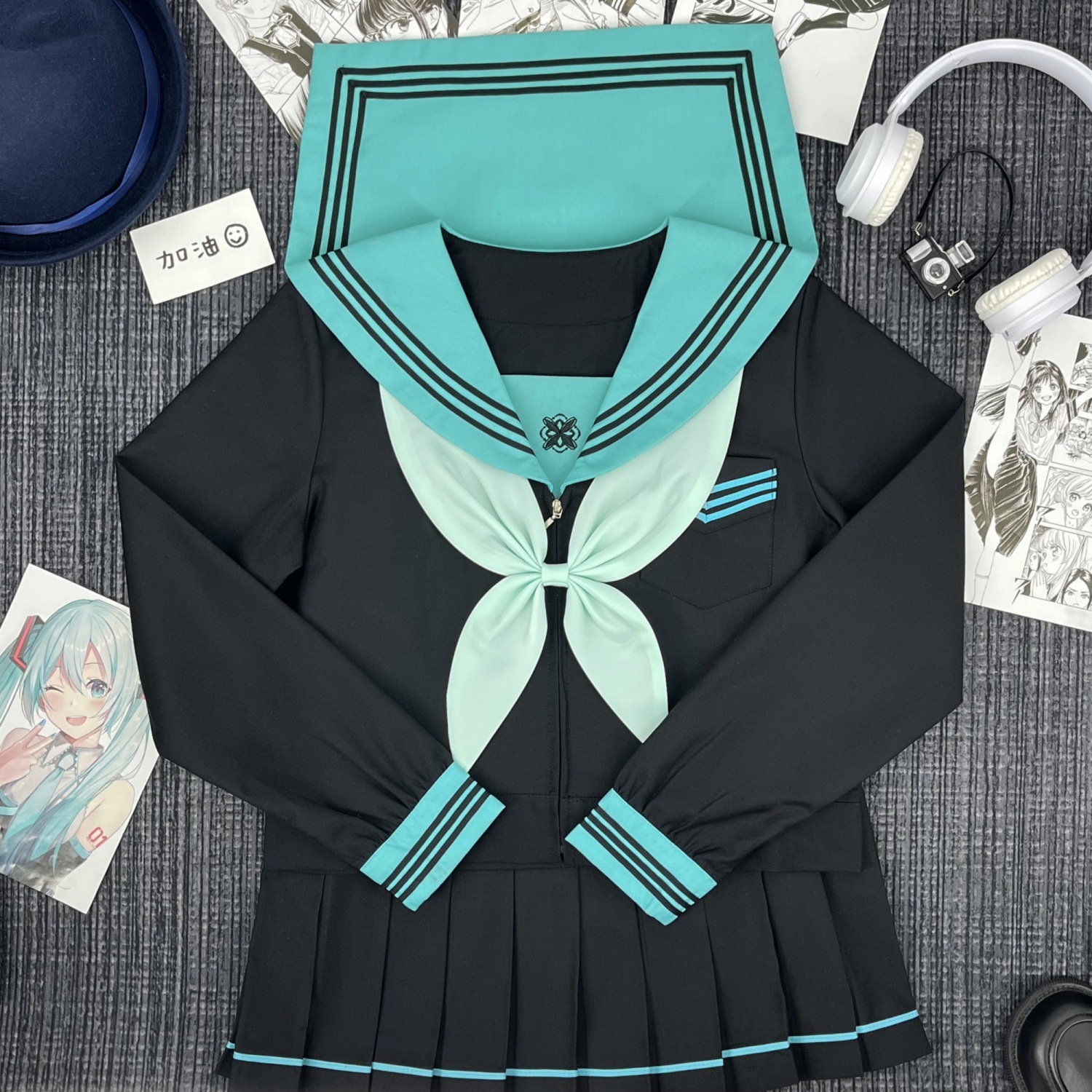 Qingli с длинными рукавами + узел золотой рыбки травяного зеленого цвета + юбка в тон; Qingli с короткими рукавами + узел золотой рыбки травяного зеленого цвета + юбка в тон; Qingli с длинными рукавами + узел золотой рыбки травяного зеленого цвета; Цинли с короткими рукавами + узел золотой рыбки травяного зеленого цвета; Черная юбка с зелеными полосками + носки