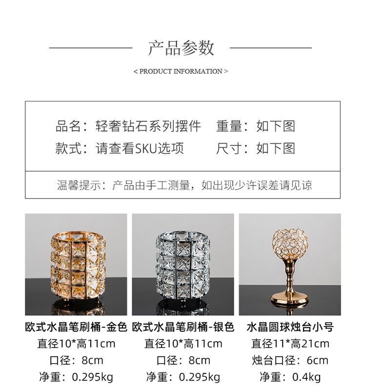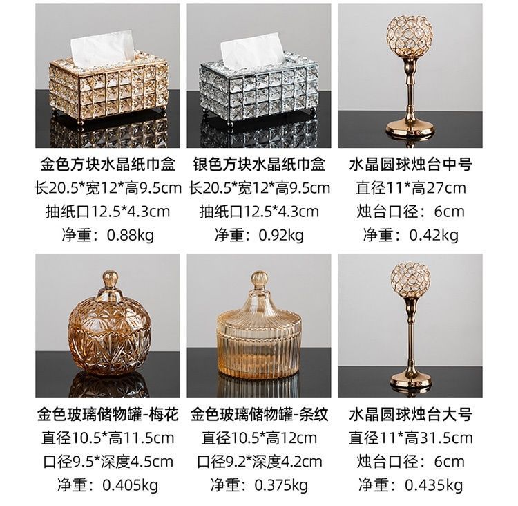 Коробка для салфеток с золотым квадратным кристаллом; Коробка для салфеток из серебряного квадратного хрусталя; Коробка для салфеток с золотой кристаллической полосой; Европейская хрустальная кисть-ведро-золото; Европейская хрустальная кисть-ведро-серебро; Маленький подсвечник с хрустальным шариком; Подсвечник среднего хрустального шара; Большой подсвечник из хрустального шара