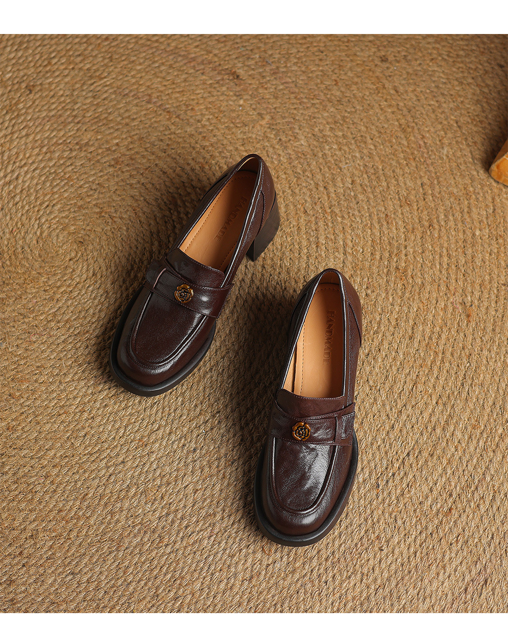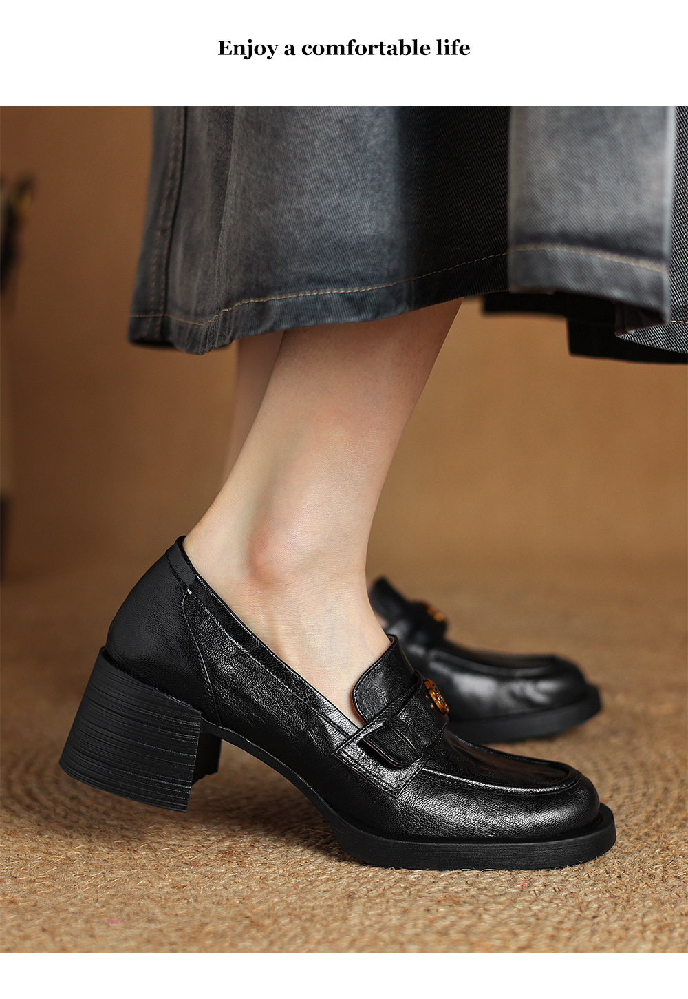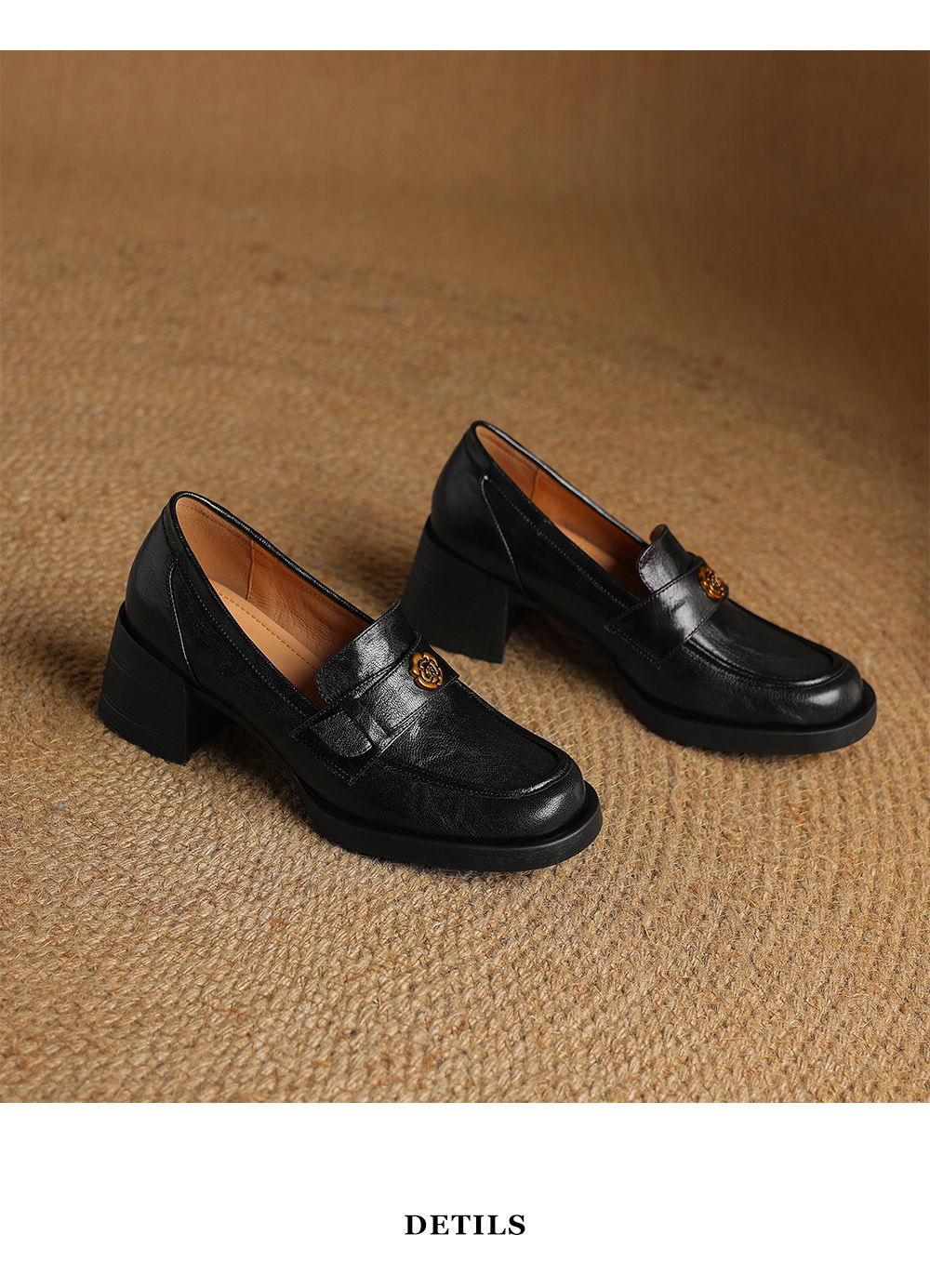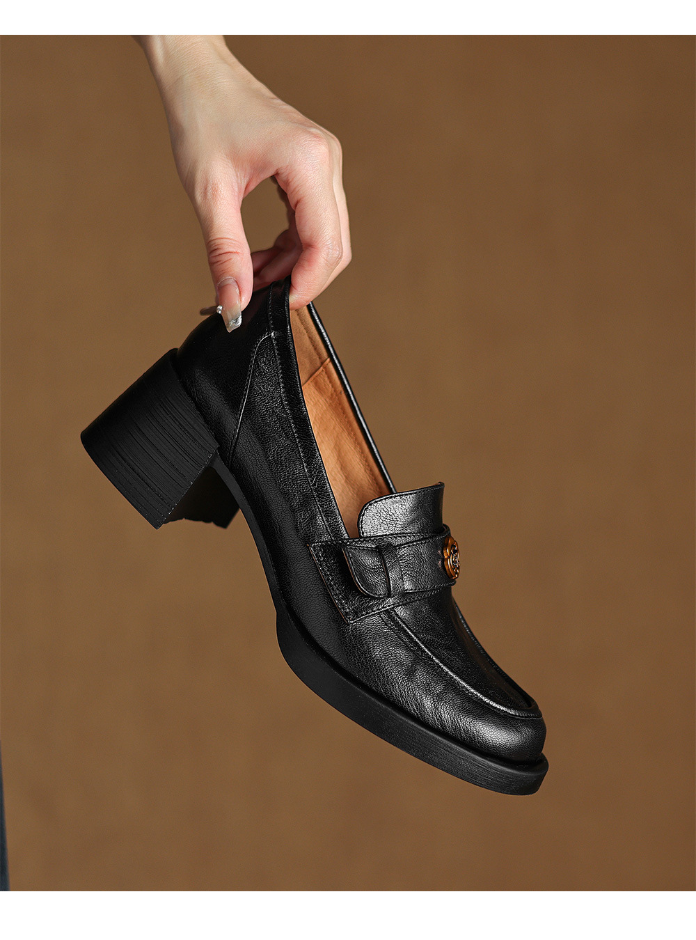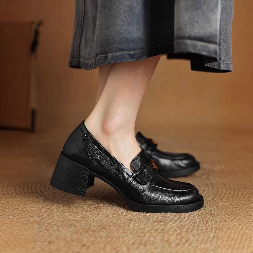 Мягкая овечья кожа черные туфли с высоким каблуком камелии рафу 2025 весна и осень новый британский стиль один педаль толстая подошва одиночные туфли для женщин