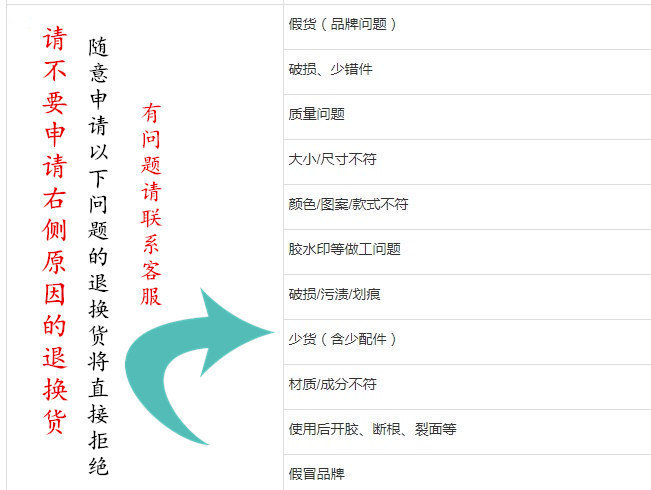 换货邮费承担问题: 线头, 小瑕疵,少量胶水印,包边处理不是很平整,少量气泡问题,鞋底不平(不影响穿着)这些买家自行处理,鞋子都是劳动密集型企业生产,不会像品牌鞋做的那么完美,请知晓,一定要退换的,买家自行承担来去运费。 特别注意:购物无法避免的色差问题,我们不承担来去运费! 7天无理由退换货制度:从收到货起7天内,整首未卖的,可以退换!(退换时需用原包装鞋盒发回,不影响我们第2次销售为前提) 以下情况 属于质量问题: 出现大面积(脱胶,破皮,断底)穿过的不算,脱线以及大面积污染,大小脚,左右脚,缺少装饰品