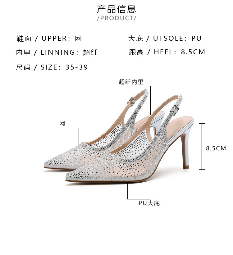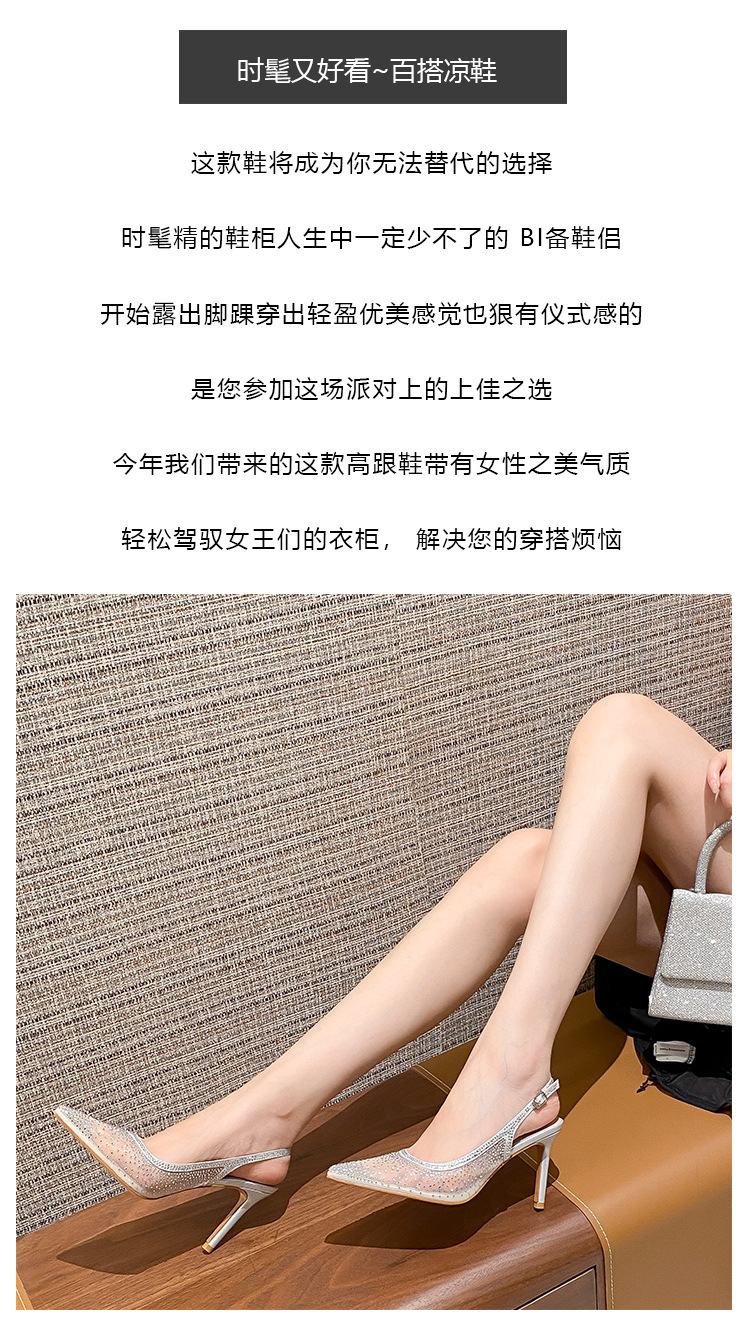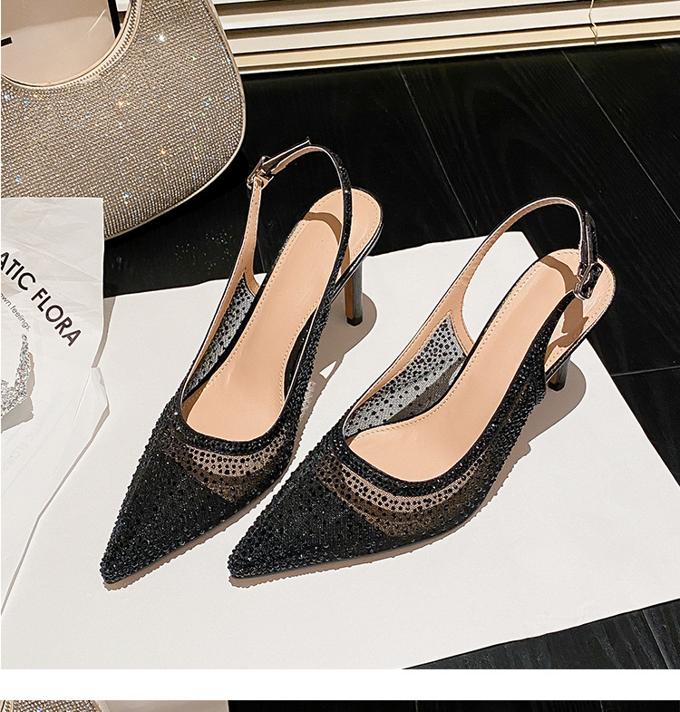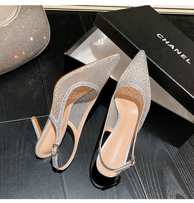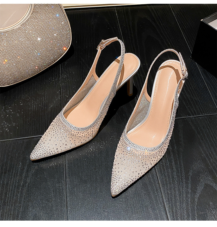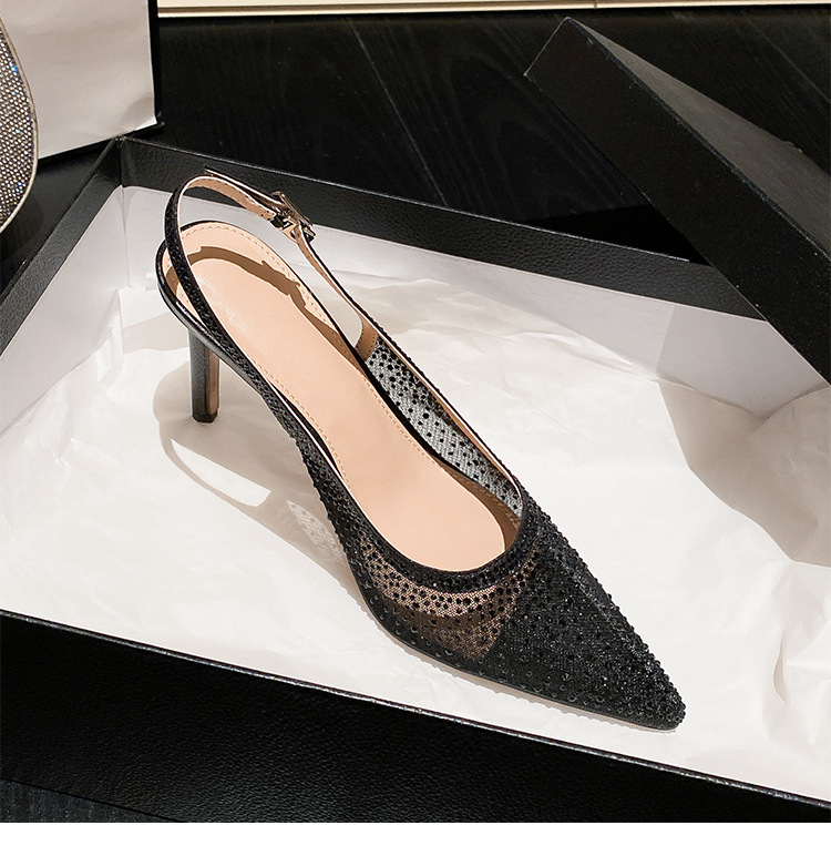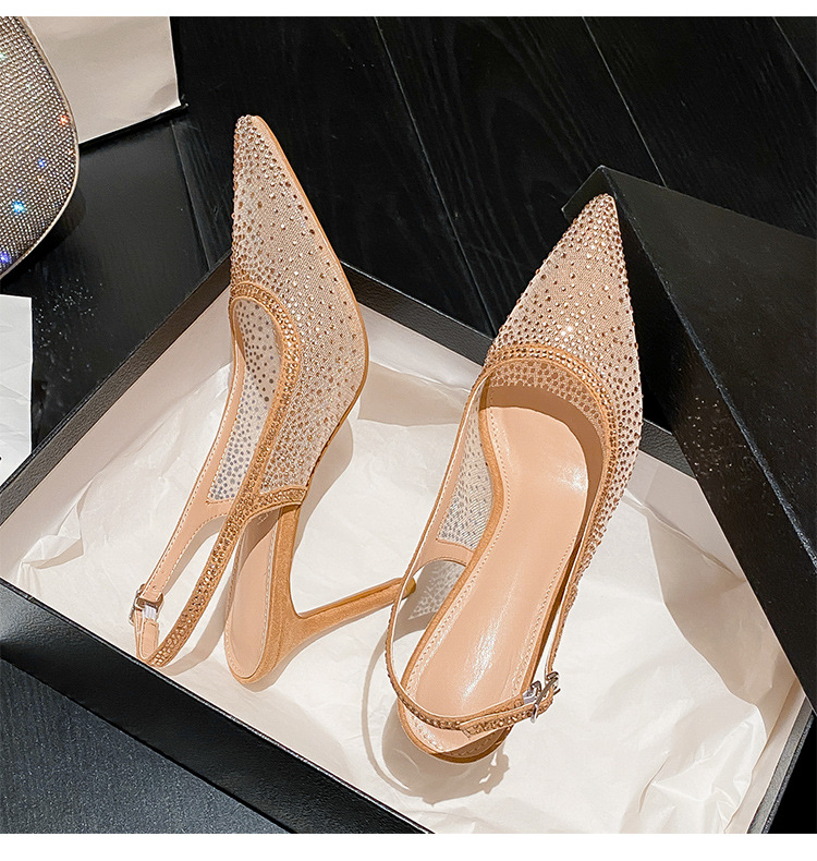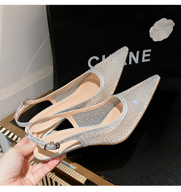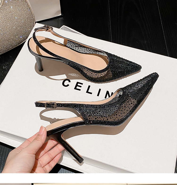 Женские босоножки-стилето с заостренным носком, сетчатые, с блестящими стразами, летняя новинка 2025 года, элегантные, закрытые, потрясающие высокие каблуки, французский стиль, однотонные туфли.