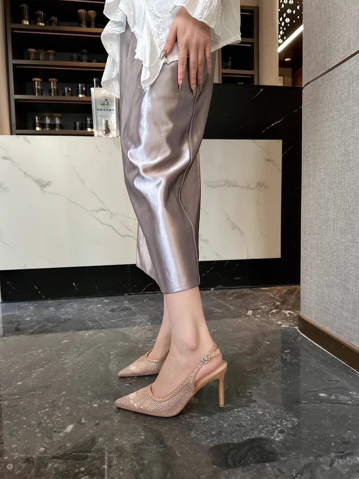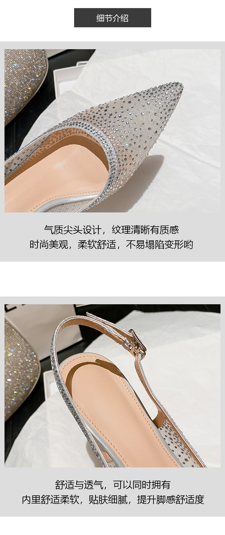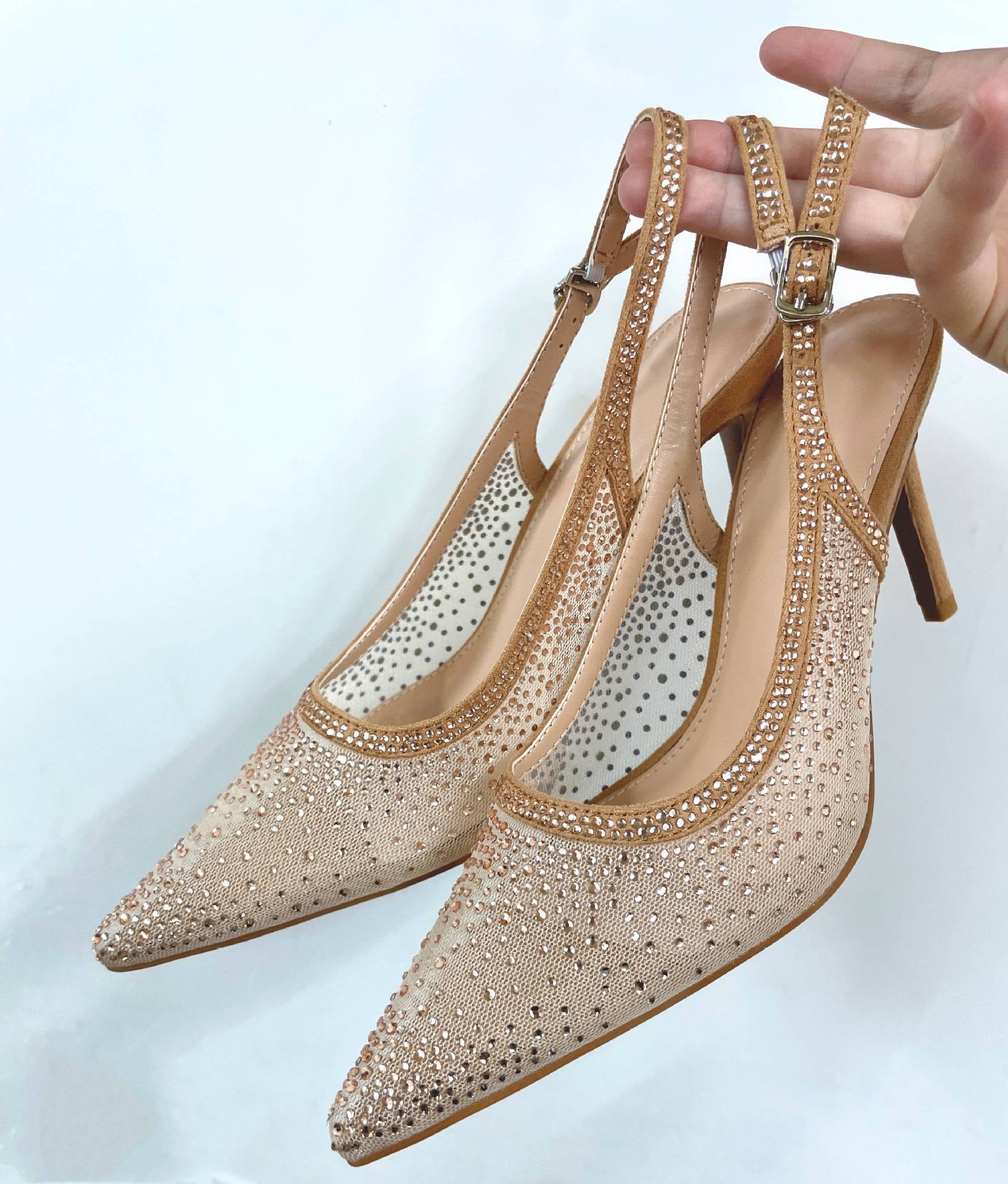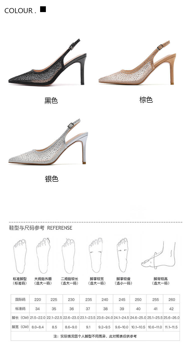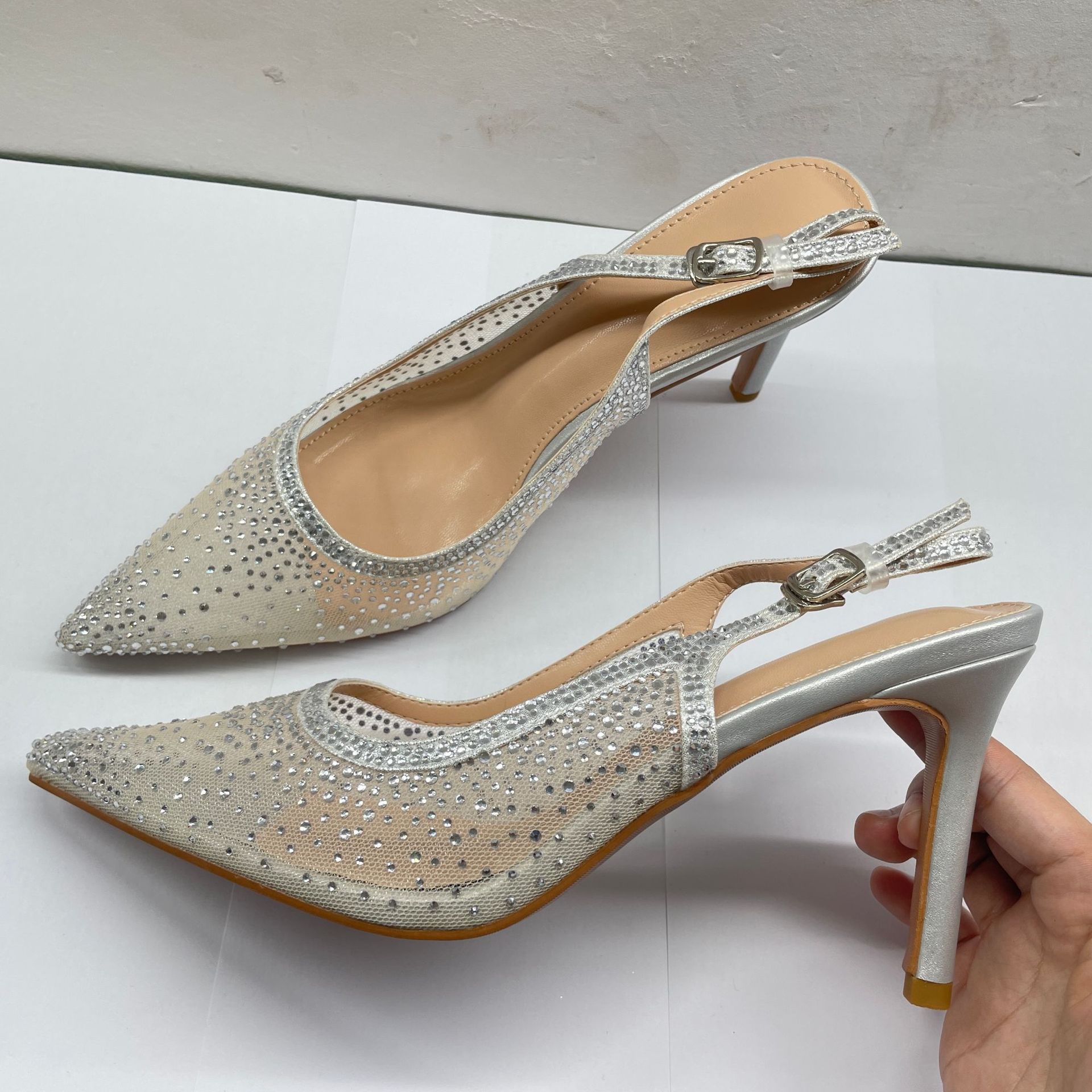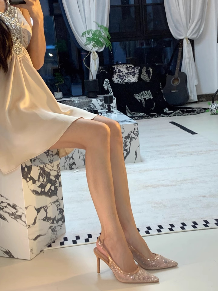 Женские босоножки-стилето с заостренным носком, сетчатые, с блестящими стразами, летняя новинка 2025 года, элегантные, закрытые, потрясающие высокие каблуки, французский стиль, однотонные туфли.
