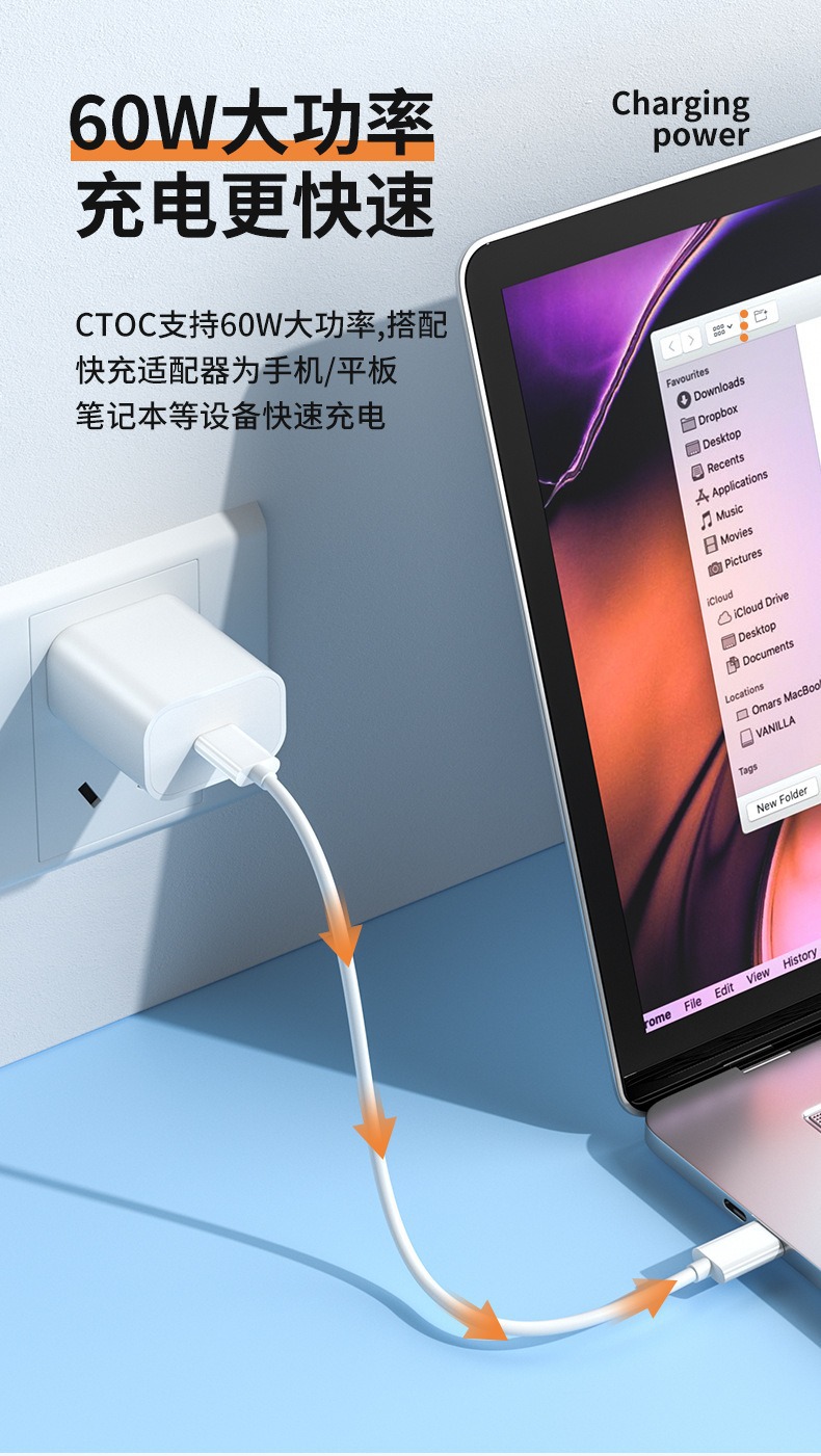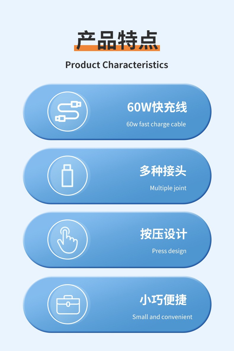 1.全系列兼容60W QC3.0 4.0快充、PD快充+数据传输。