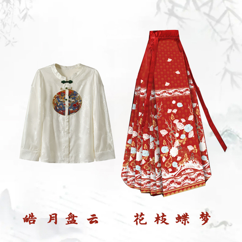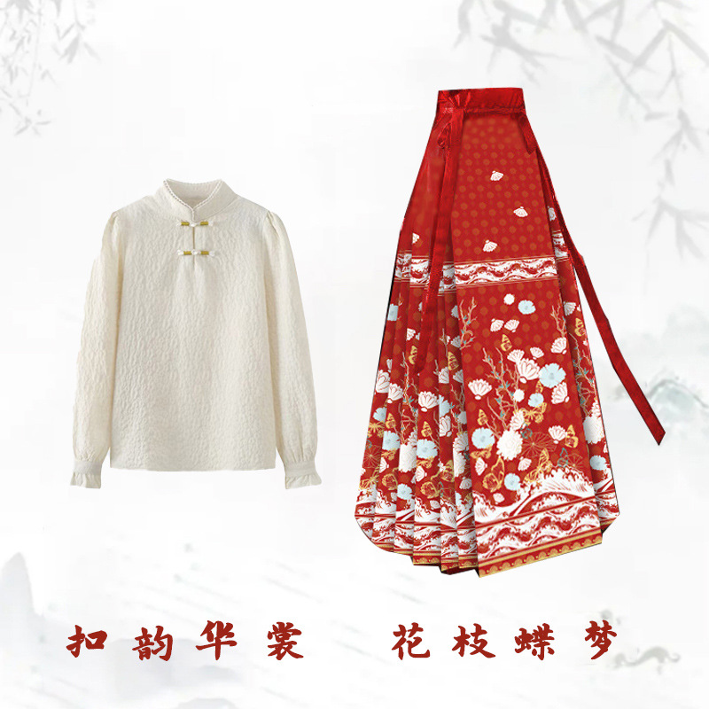 Женский костюм с юбкой на конском листе, новая юбка-шинуазри, плиссированная юбка на весну и осень, драпировка и элитный [местория с цветочной веткой-бабочкой]