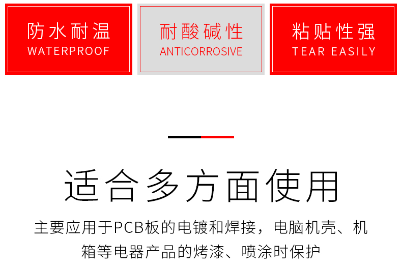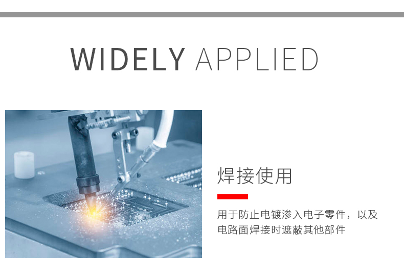 特点:主要应用于PCB板的电镀和焊接,用于防止电镀液渗入电子零件,防止电镀液飞沫和蒸汽等污染被动原件,以及电路面焊接时遮蔽端子部件;确保把电子零件封装到基板上时的焊接处理工序中耐焊性,耐溶性以及密封性。即使在焊接、研磨、烘干、电镀这样严酷的条件下也能与电路板精密贴合,使用后能够无残胶剥离。