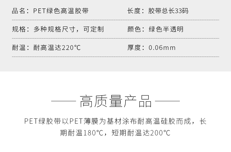 产品介绍:品名PET绿胶带又称喷涂胶带,是以PET聚脂薄膜为基材,涂以进口有机硅胶。