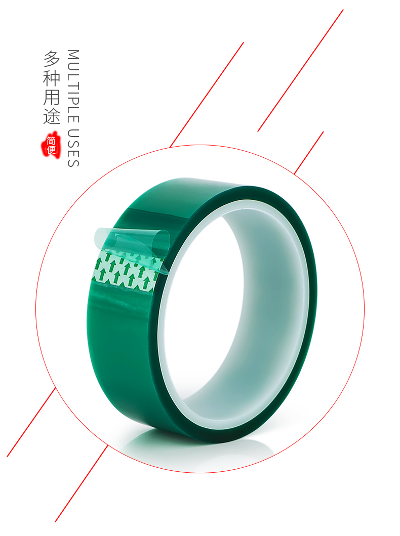 绿胶,由聚酯薄膜和矽利康胶系所构成,是一种应用在印刷电路板和皮膜接合用的胶带,不仅在电镀金手指时能符合PCB生产厂商的需求,即使运用在各式薄膜、合成皮膜、纸类接合时,也能满足使用者的需要。适用于PCB电镀金的保护;各式薄膜、合成皮、纸类之接合;耐热性佳;不脱胶;不同储存环境也能均匀的撕开。