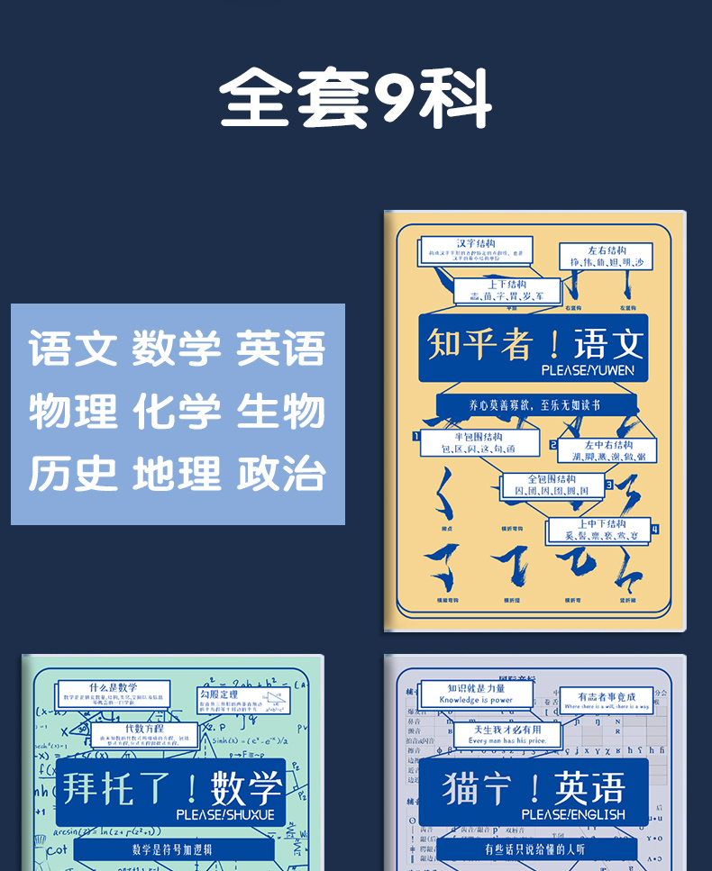 Китайский/1 книга; Математика/1 книга; Английский/1 книга; Политика/1 книга; История/1 книга; География/1 книга; Биология/1 книга; Физика/1 книга; Химический состав/1 книга; Внешняя китайская и математическая/3 упаковки; Политическая история и земля/3 упаковки; Студенты физики и химикатов/3 упаковки; Литература средней школы Комплекс/6 книг; Наука средней школы и подсказка/6 книг; Первый класс 7 предметов/7 книг; Второй класс 8 предметов/8 книг; 9 книг для всех предметов