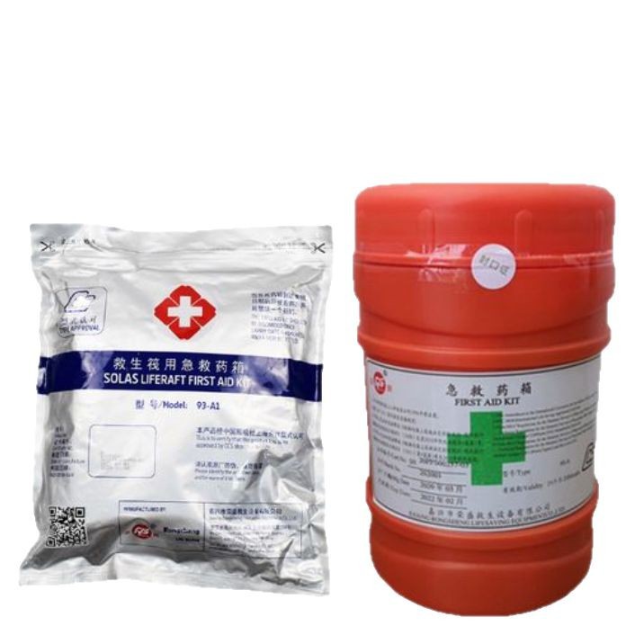 构造:适用于海上遇险救生艇,救生筏上人员急救时使用。1,绷带(4.8x600cm, 5卷);2, 纱布(34x40cm, 10块);3, 三角巾绷带(底130cm腰90cm, 3块),4, 医用胶布(1.2x100cm,1卷);5, 药棉10g,1包);6, 止血带(55cm,2根);7, 绷带剪(园头10cm,1把);8, 别针(3cm, 5只);9, 创可粘(2.5x2.0cm, 20张);10, ***膏(20g, 1支);11, 止痛片(0.42-0.50, 25片);12, 复方磺胺甲(0.5g, 40片);13,镊子(12cm,1把);14,氨溶液(10ml);15酒精(75%,20ml);16,***膏4支;17红霉素眼膏(2g,3支)18,碘酒(1瓶),19,压舌板(1只),20,体温表(1只),21,硝酸甘油(20片)22克感敏(20片)23,雷尼丁(20片)