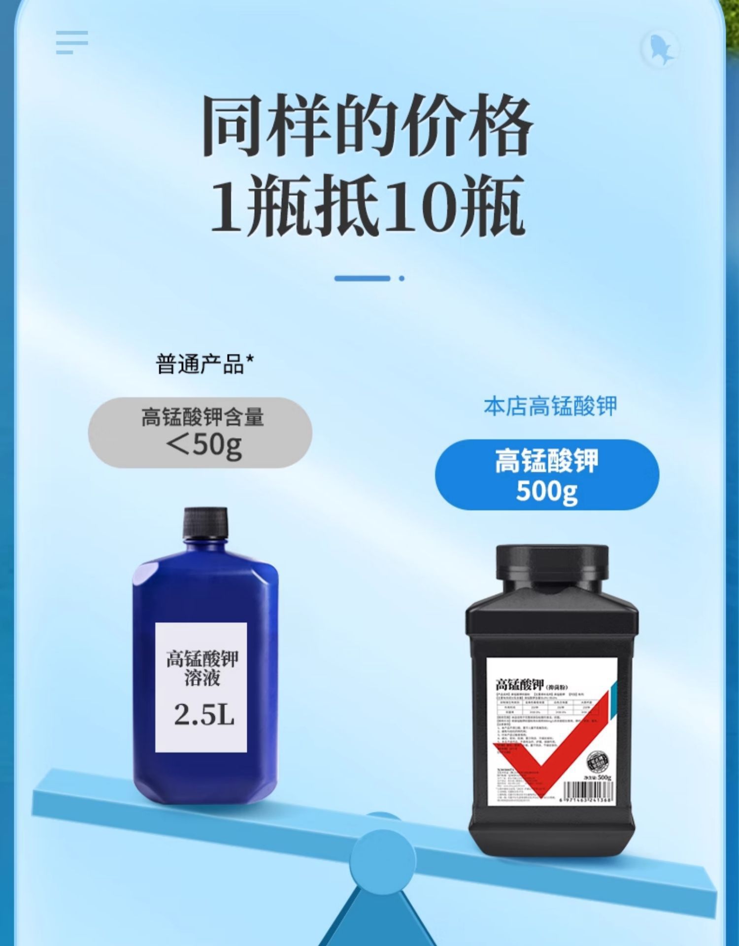1 бутылка пермаганата калия 500 г [высококонцентрированная большая емкость]; 2 бутылки пермаганата калия 500 г [высококонцентрированная большая емкость]; 5 бутылочек пермаганата калия 500 г [высококонцентрированная большая емкость]; 10 флаконов пермаганата калия 500 г [высококонцентрированная большая емкость]; 50 г/флакон пермаганата калия