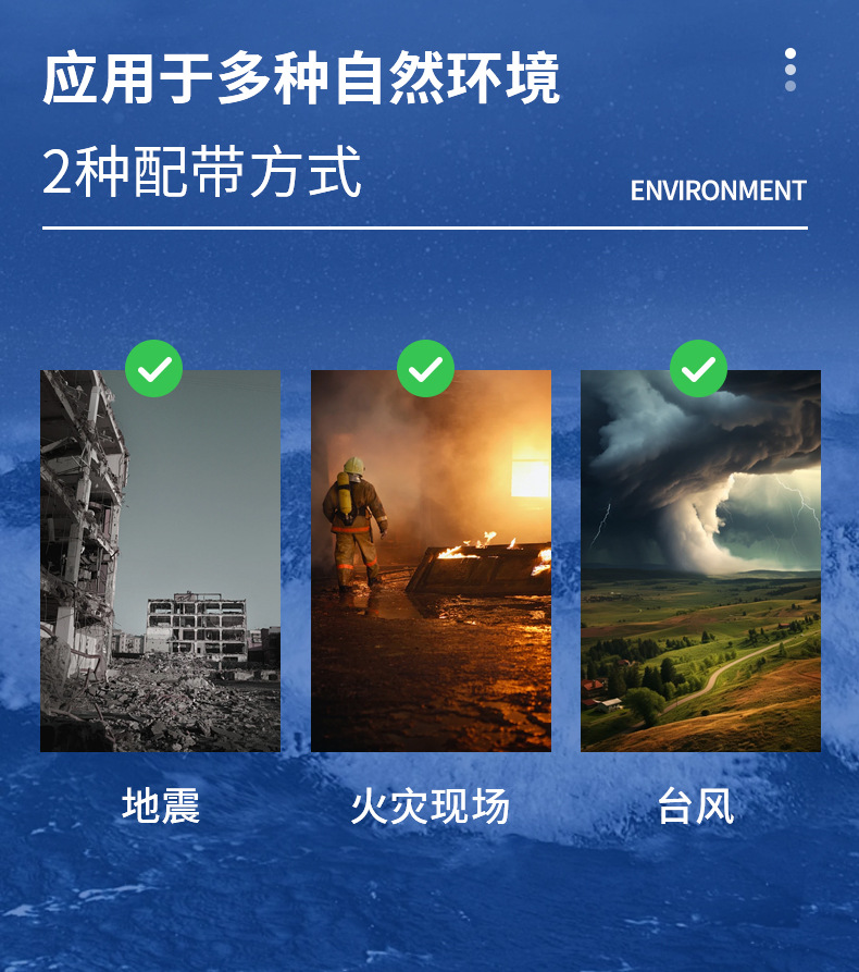 Он используется при стихийных бедствиях, таких как пожарные площадки, землетрясения, тайфунды, наводнения и т. д., или в определенном месте утечки и утечки после разрушения здания.