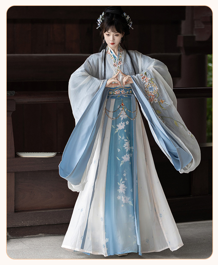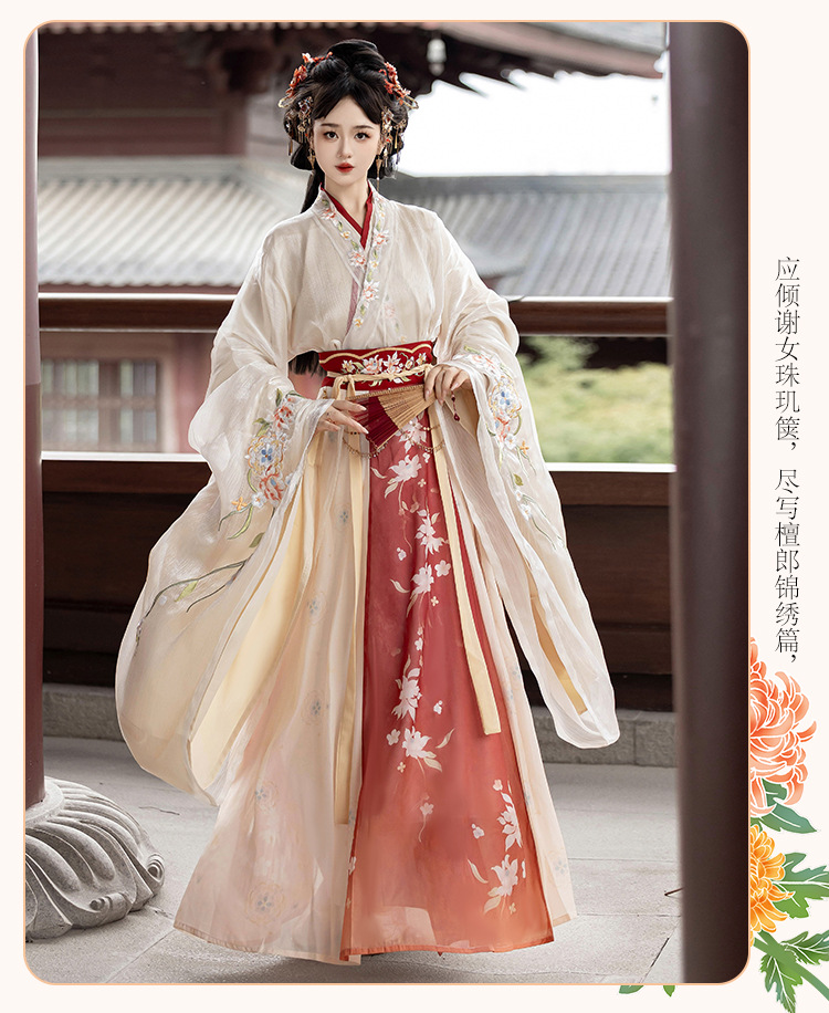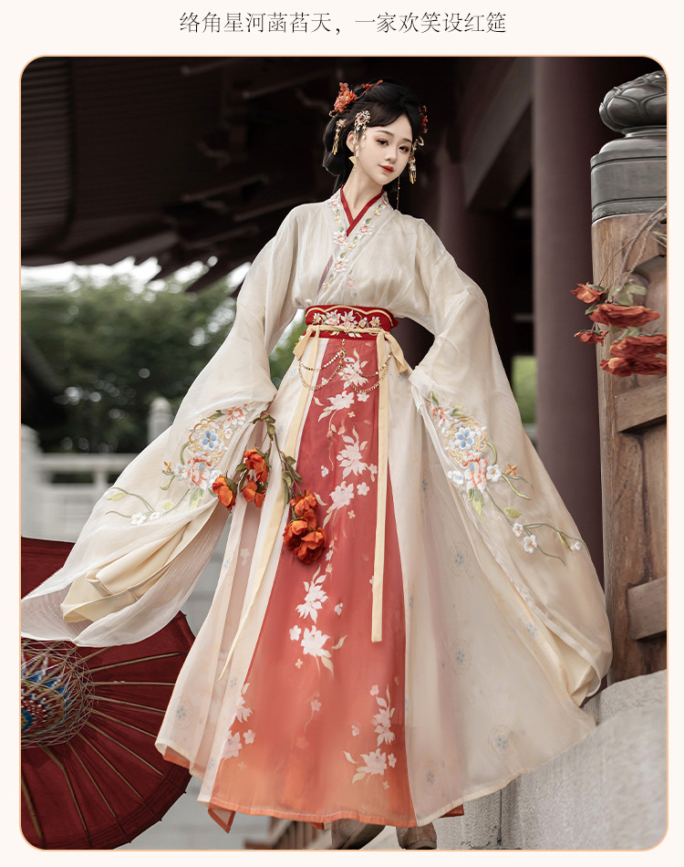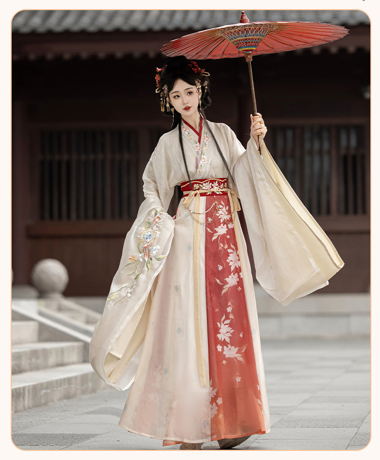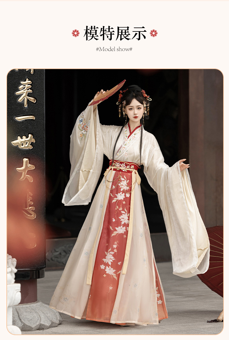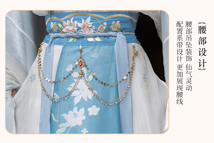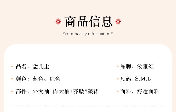 Бежевые верхние большие рукава + бежевые внутренние большие рукава + красная восьмибортная юбка + поясная цепочка; Бежевые большие внешние рукава + синие большие внутренние рукава + синяя восьмибортная юбка + поясная цепочка