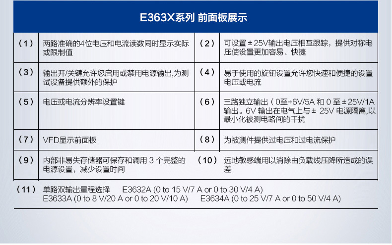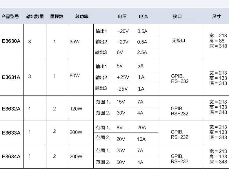 E3631A (с производства, доставка по умолчанию E36311A; E3632A (120 Вт двойной диапазон 15 В/7 А 30 В/4 А); E3633A (200 Вт двойного диапазона 8 В/20 А 20 В/10 А); E3634A (с производства 200 Вт, двойной диапазон 25 В/7 А, 50 В/4 А)