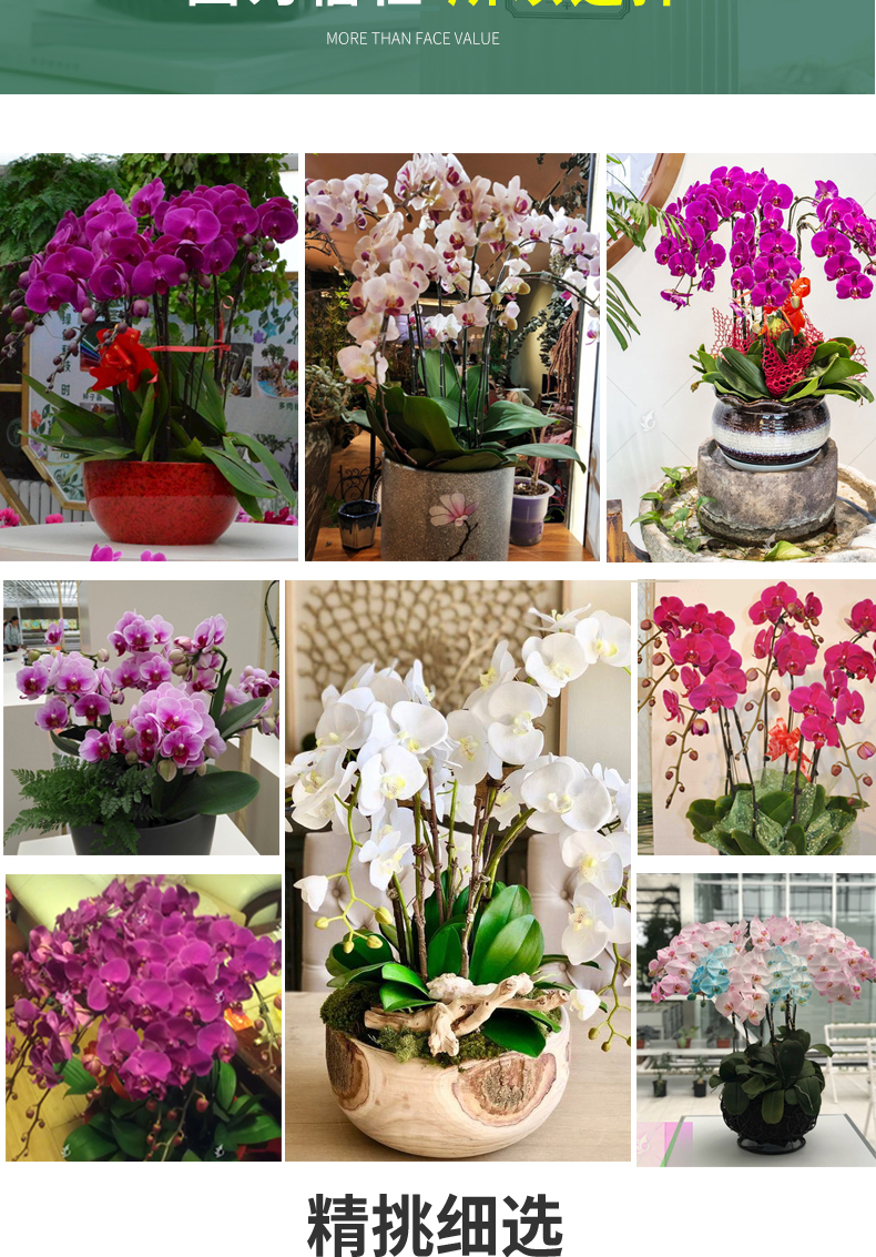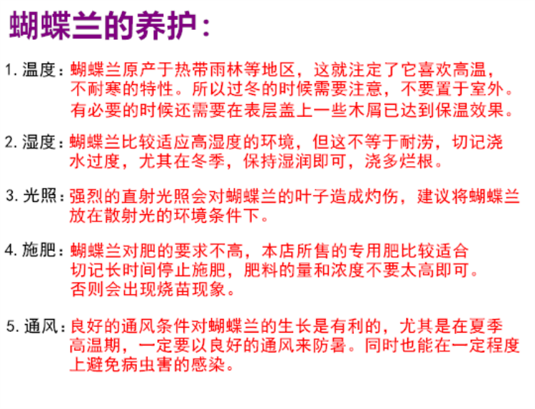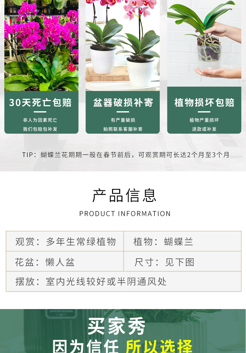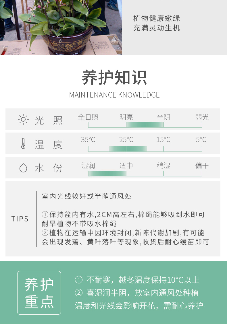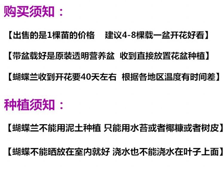 本链接里面蝴蝶兰都是按照品种发货,包终生对版,目前不在花期,发货均不带花苞和花剑,介意者慎拍。我们都是基地精选花苗发货。包成活是指种植2周内出现死亡可以补发一次。