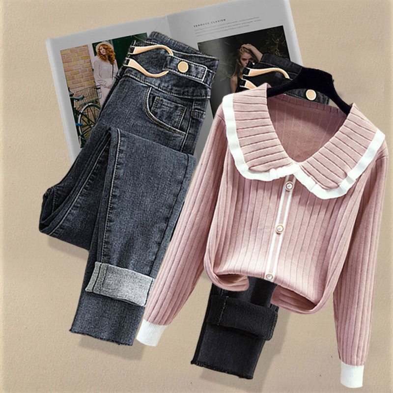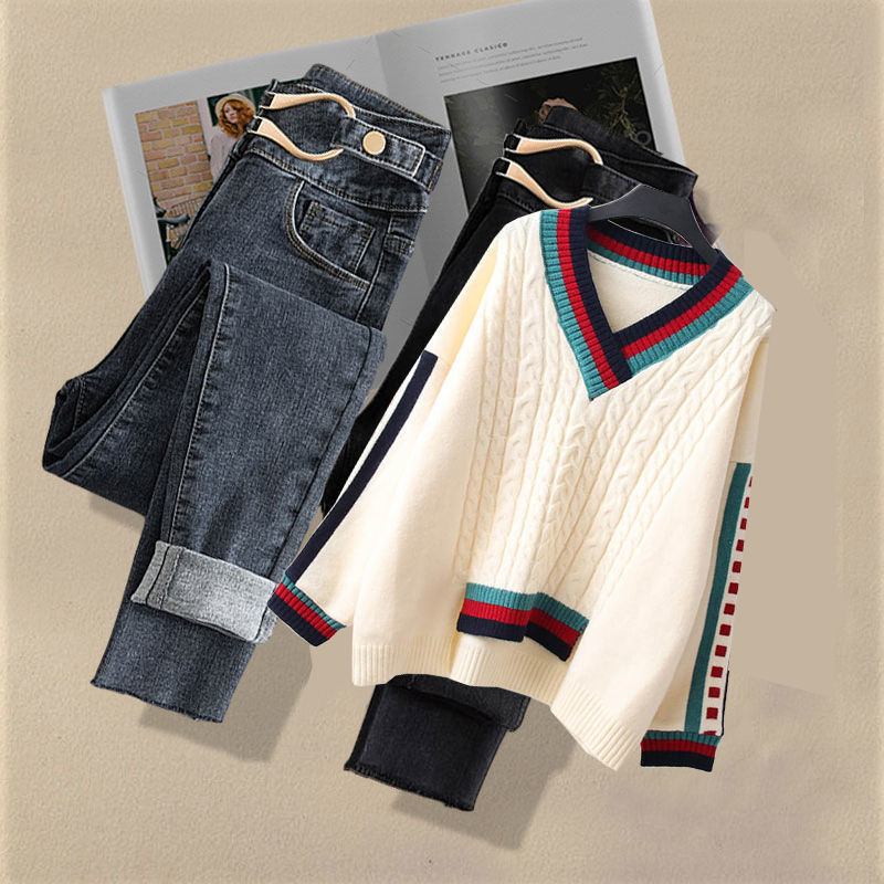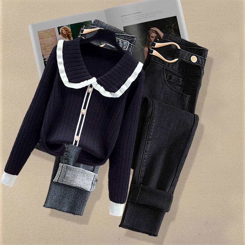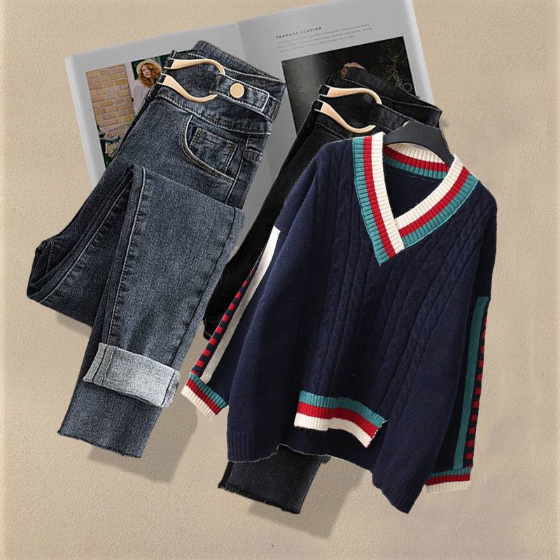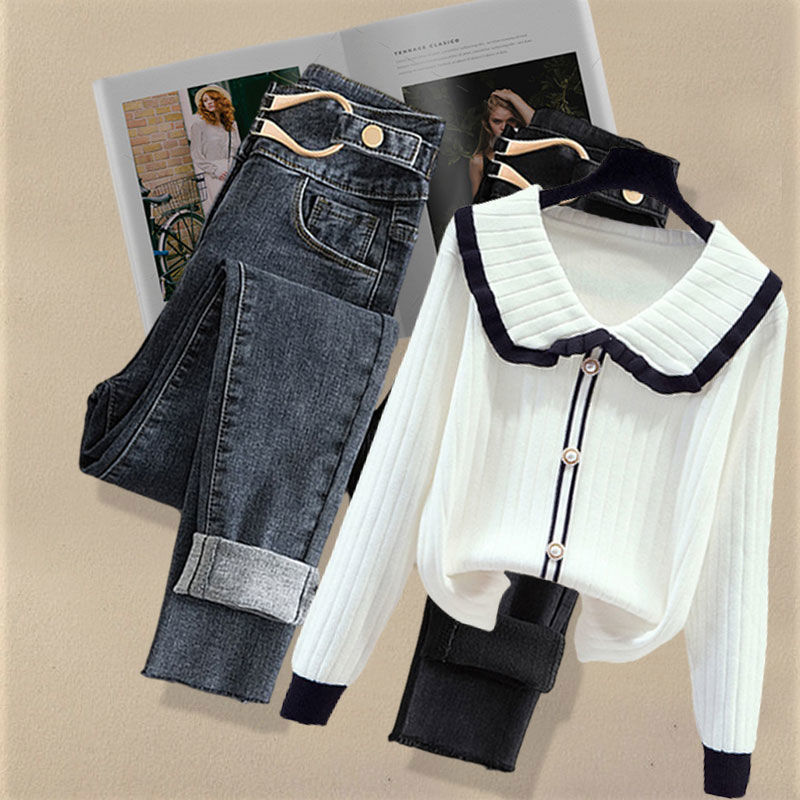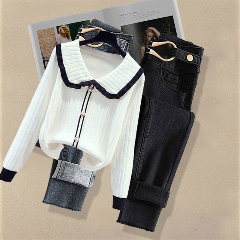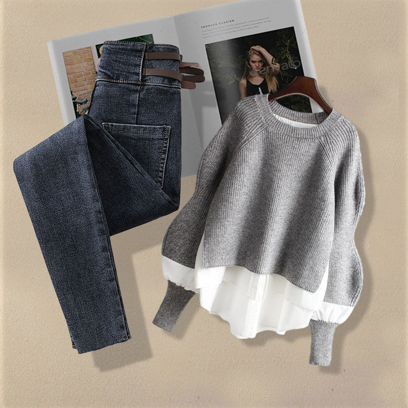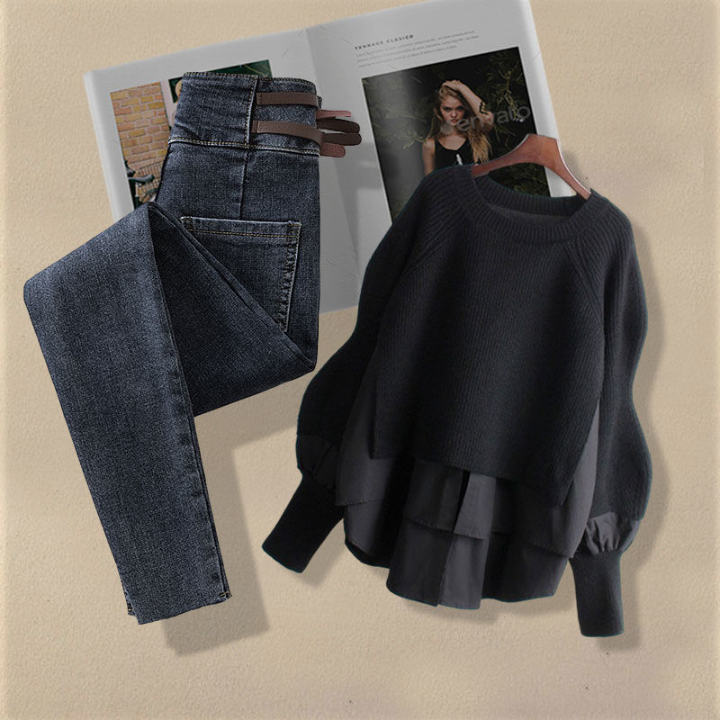 Осенний костюм женский 2024 новая корейская версия нишевые дизайнерские чувства поддельные два свитера тонкие джинсы набор из двух частей