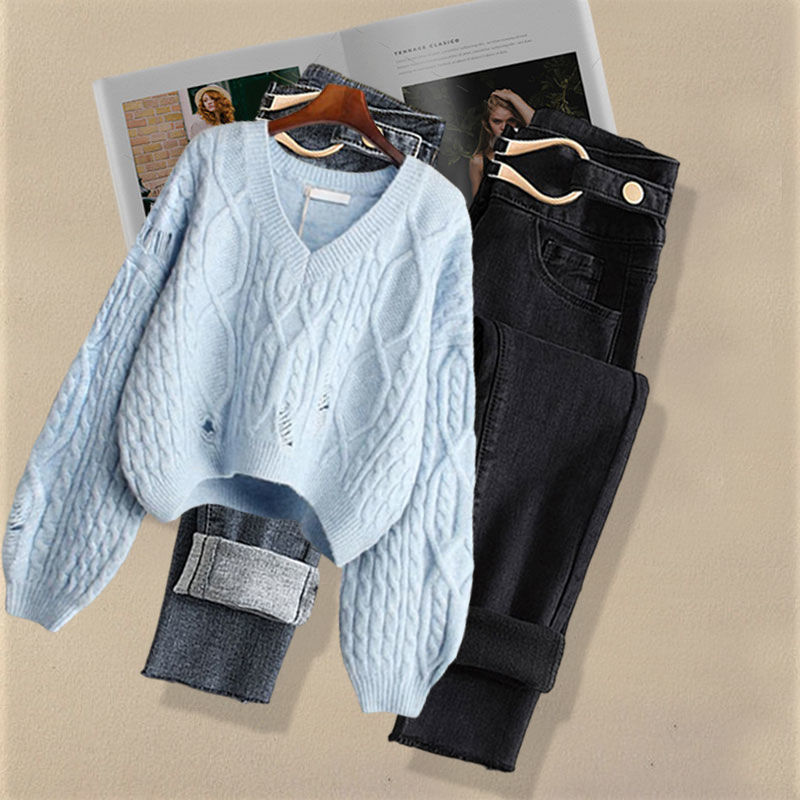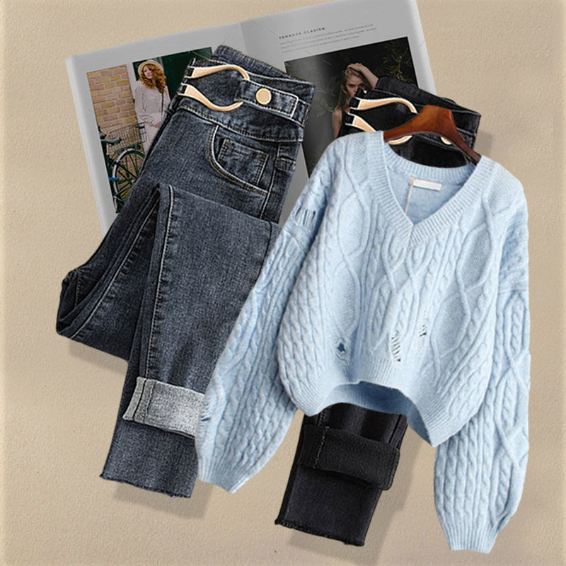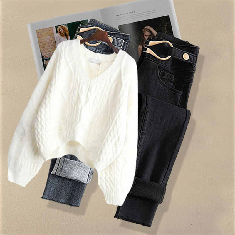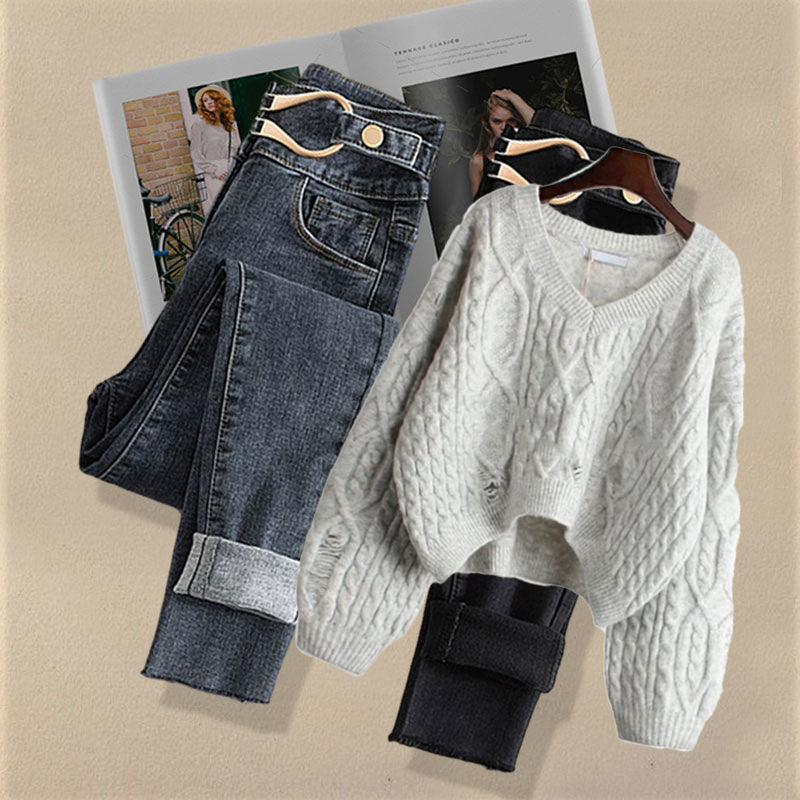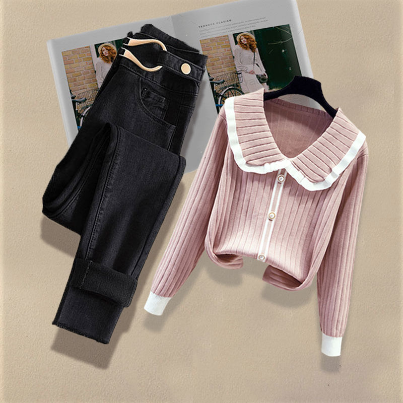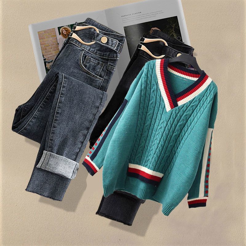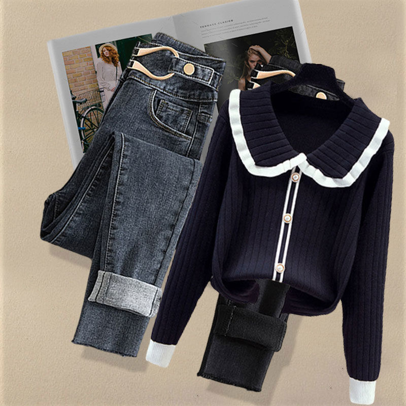 Осенний костюм женский 2024 новая корейская версия нишевые дизайнерские чувства поддельные два свитера тонкие джинсы набор из двух частей
