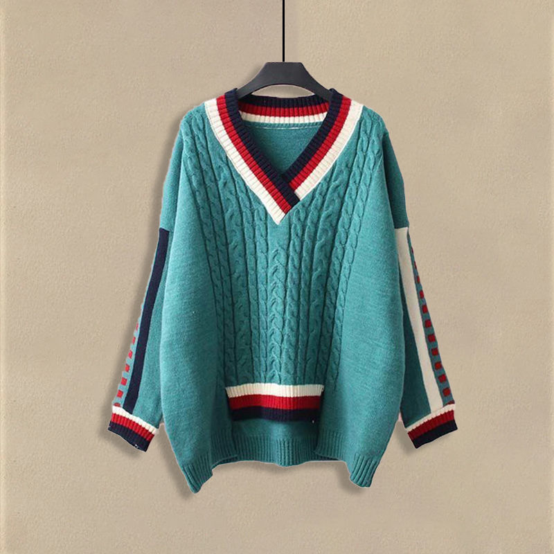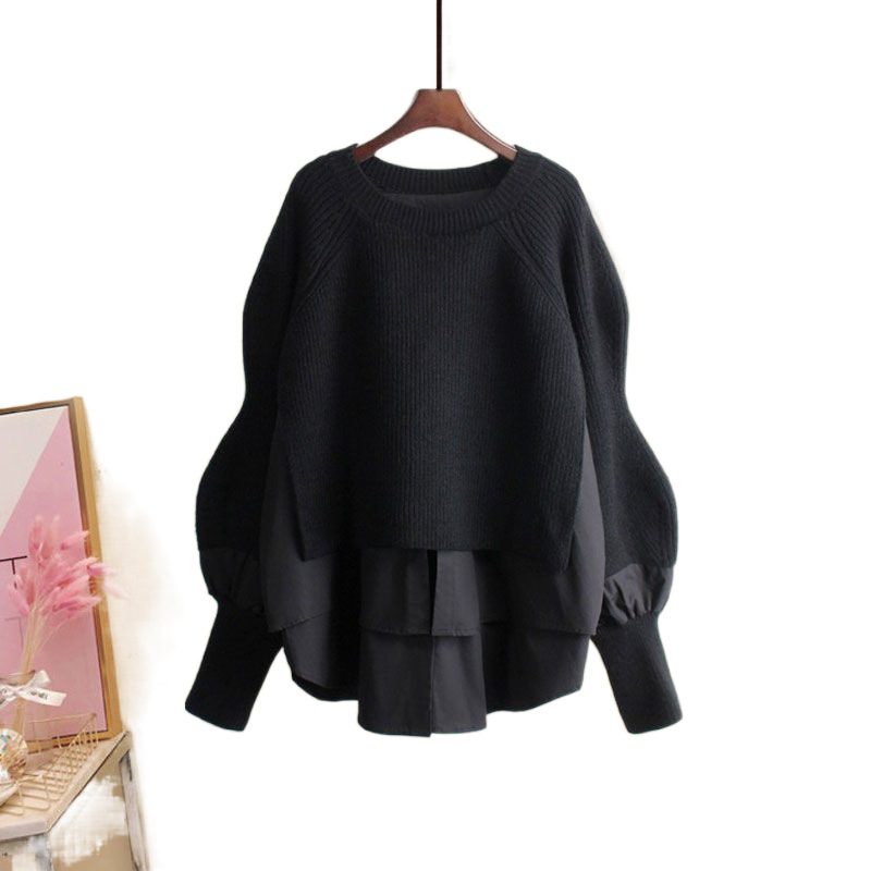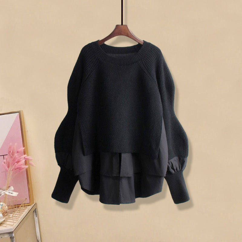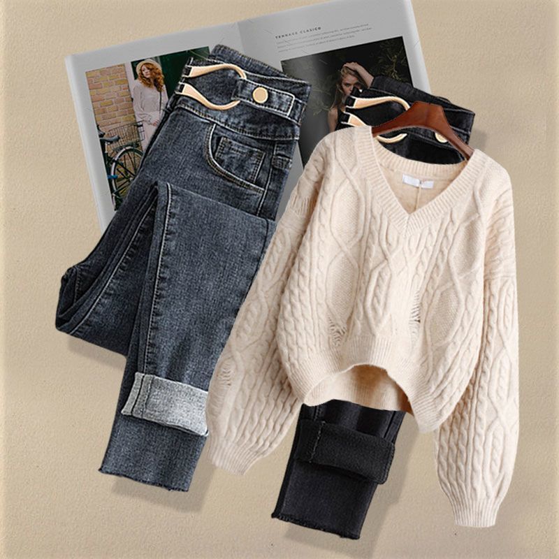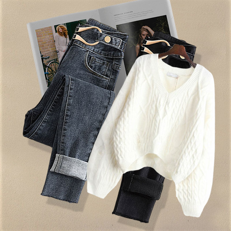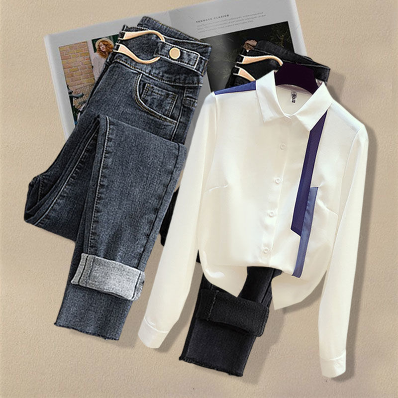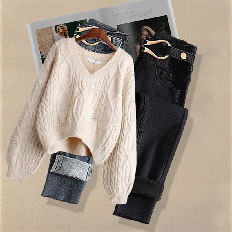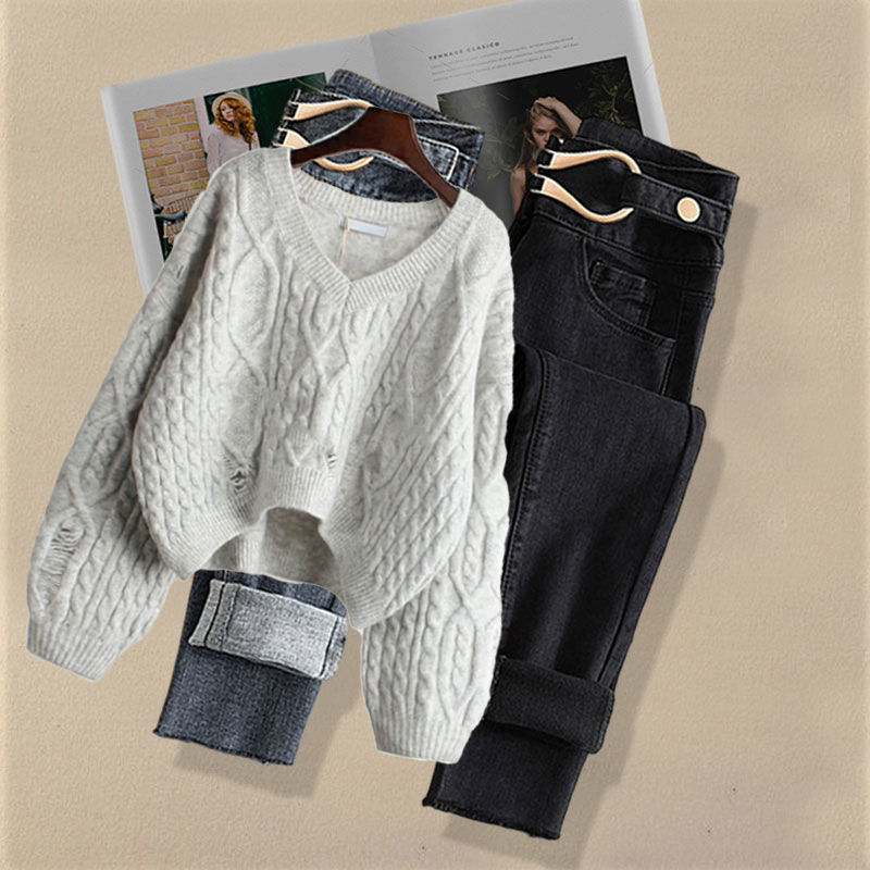 Осенний костюм женский 2024 новая корейская версия нишевые дизайнерские чувства поддельные два свитера тонкие джинсы набор из двух частей