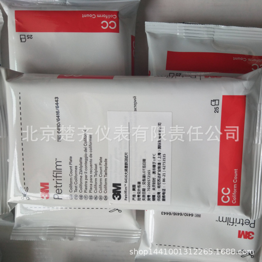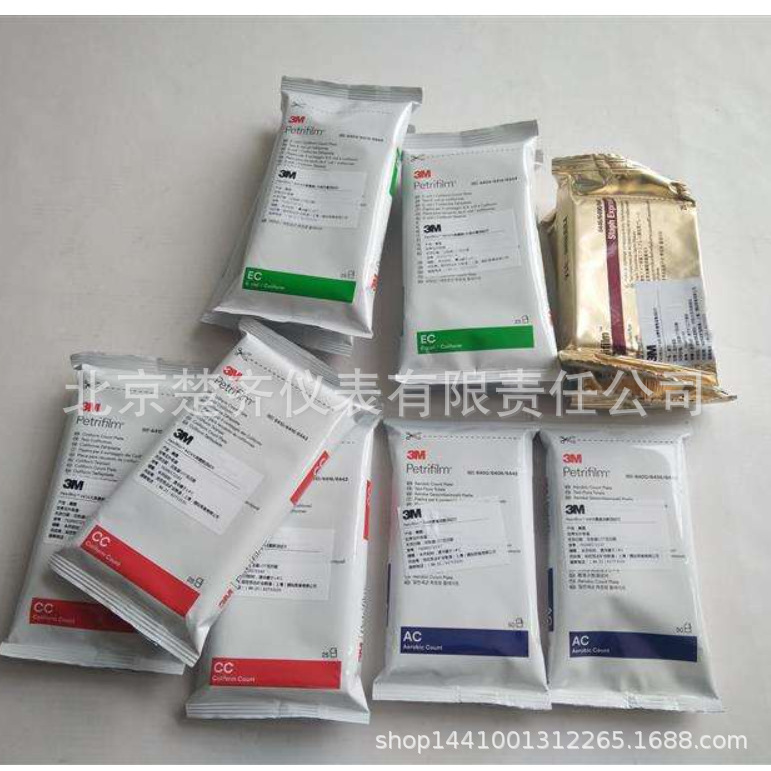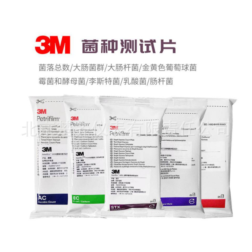 Petrifilm™测试片是美国3M公司发明的一种进行菌落计数的干膜,采用可再生的水合物材质,由上下两层薄膜组成。上层聚丙烯薄膜含有粘合剂、指示剂及冷水可溶性凝胶;下层聚乙烯薄膜含有细菌生长所需的营养琼脂培养基。细菌在测试片上生长时,细胞代谢产物与上层的指示剂TTC发生氧化还原反应,将指示剂还原成红色非溶解性产物三苯甲臜,从而使细菌着色。故测试片上红色菌落判断为菌落总数。具体方法详见行业标准SN/T 1897-2007食品中菌落总数的测定Petrifilm™测试片法。