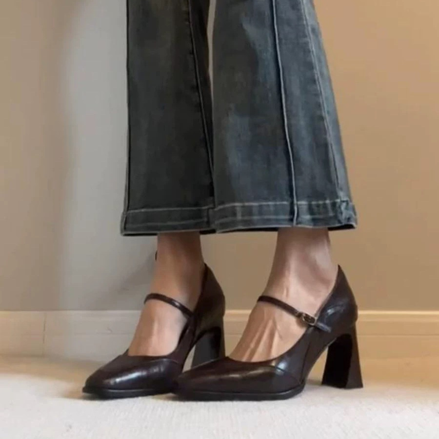 Коровья кожа версия ~ Французские кожаные туфли на высоком каблуке женский 2025 новый черный Мэри Джейн с юбкой на толстом каблуке
