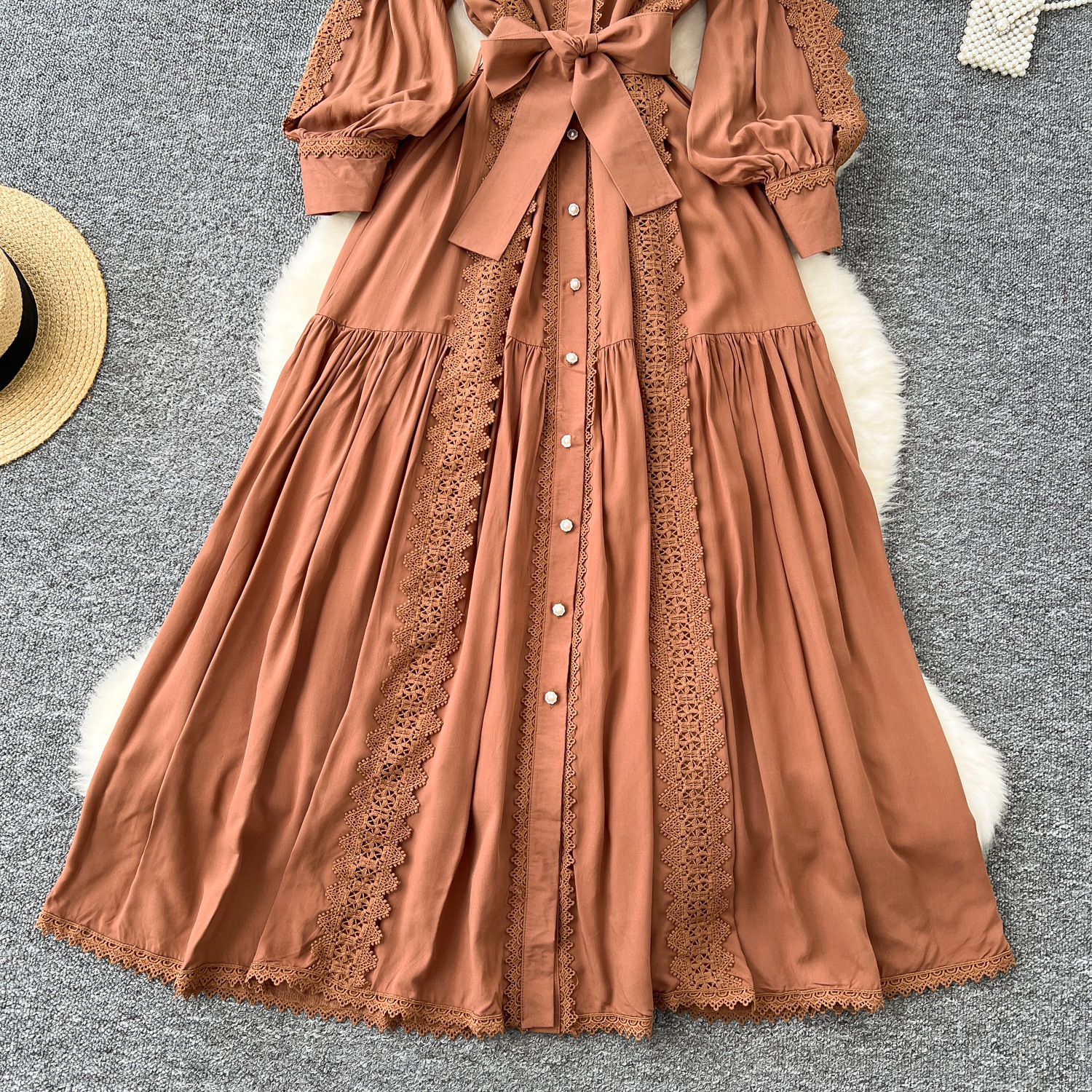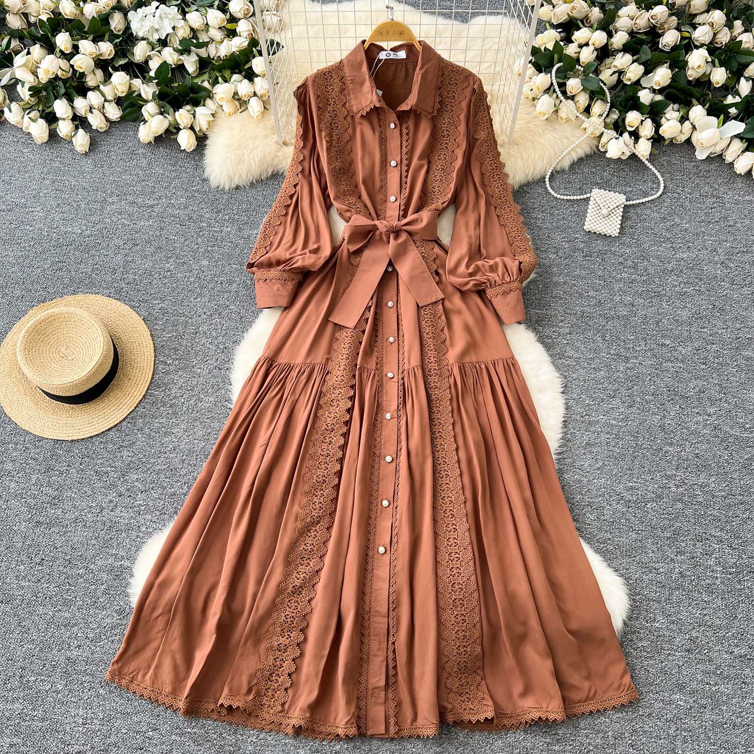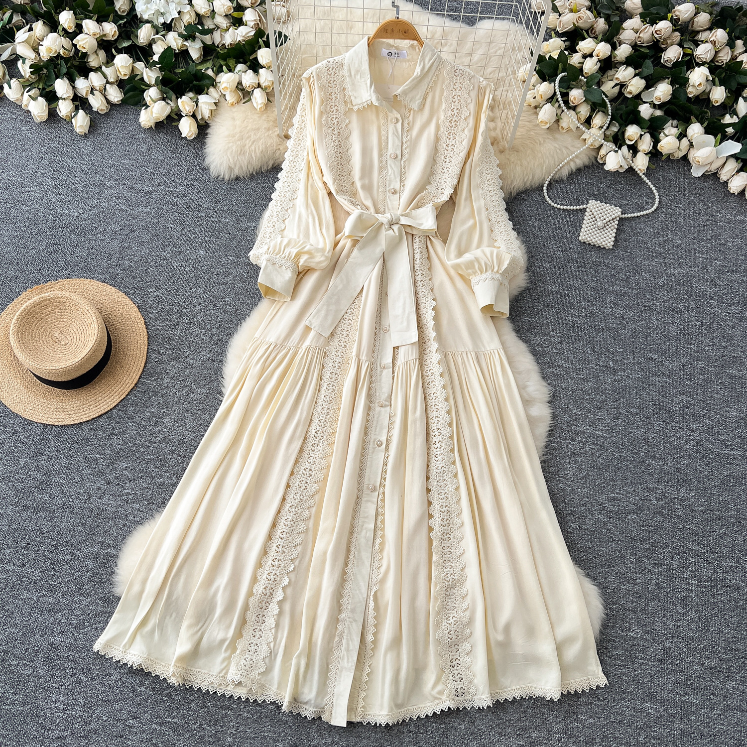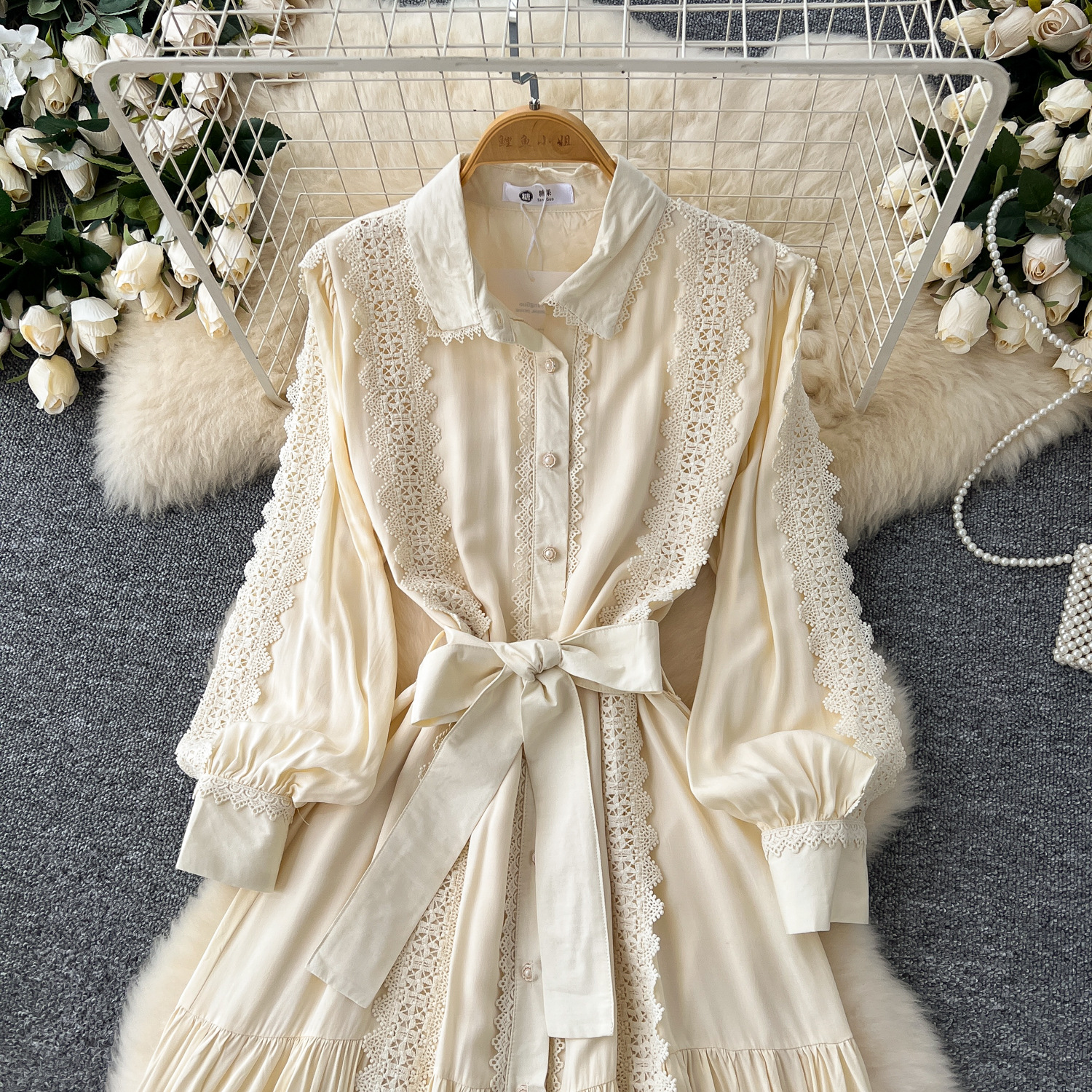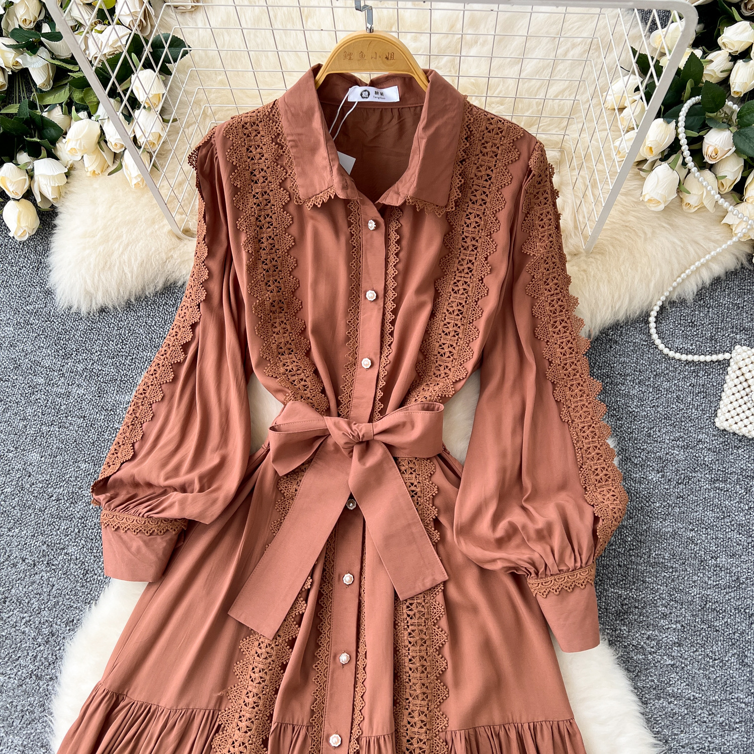 Французское элегантное платье женская осенняя леди нишевые старшее кружевное сшивание однобортное платье