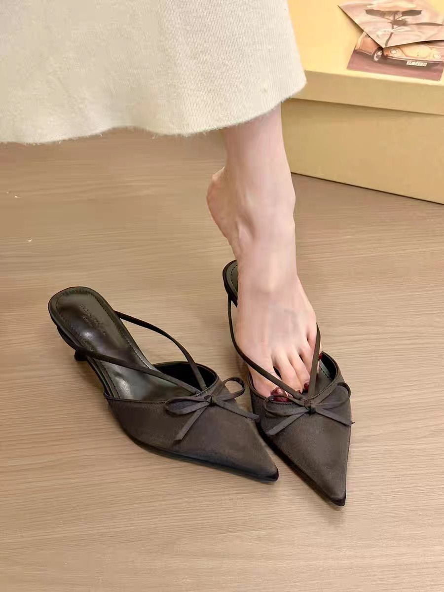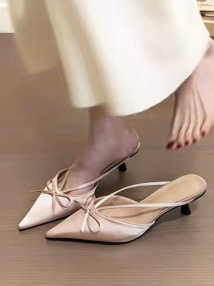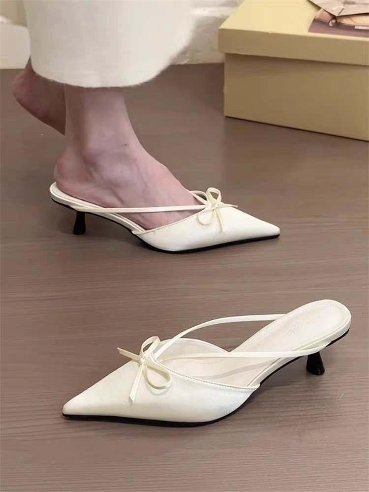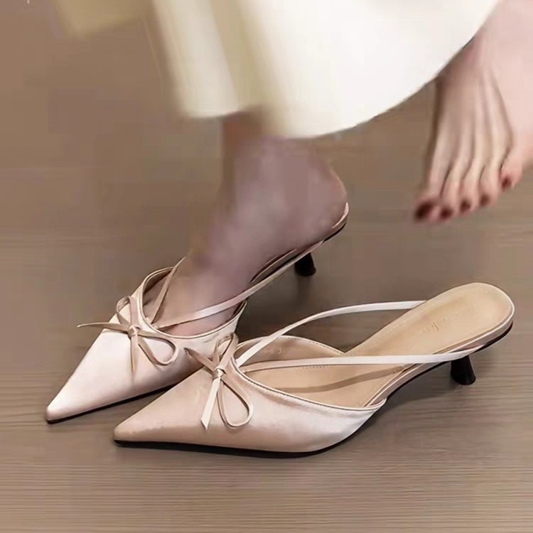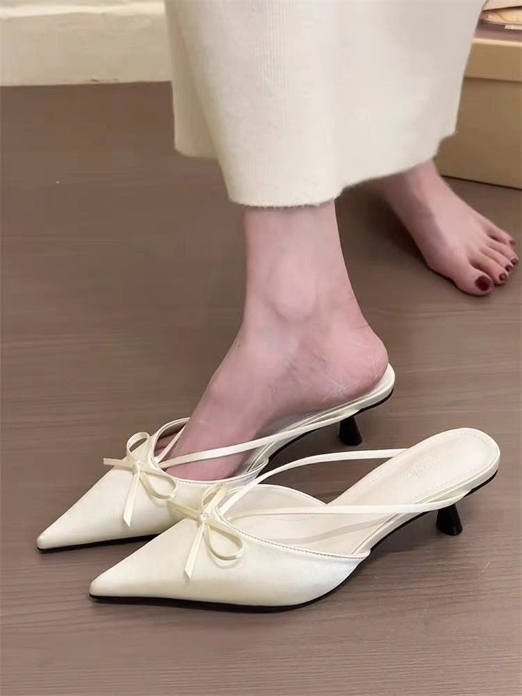 2025 новая весенняя мода дикий остроконечный бант на высоком каблуке полужасачка женская внешняя одежда показывает, что ноги длинные, а ноги не устали