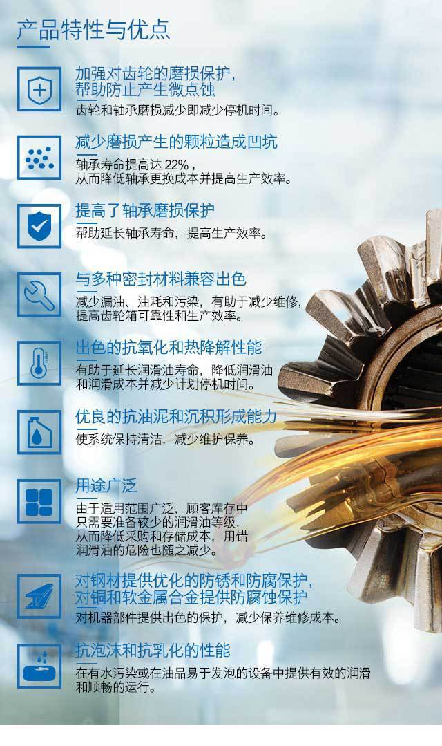 Mobilgear 600 XP 系列配方保护齿轮齿,避免早期磨损。微量磨损(称之为微点蚀)可导致齿轮齿严重损坏。Mobilgear 600 XP系列超过工业界对轴承磨损保护的要求。事实上,Mobilgear 600 XP 系列提供的磨损保护相当于工业标准 FAG FE8 试验的15 倍. Mobilgear 600 XP 系列均衡的配方可提供最大的抗磨损和防腐保护,同时与常用齿轮箱密封材料保持兼容。Mobilgear 600 XP 有助于保持齿轮箱密封完好,从而防止漏油并避免污染。 通过保护齿轮、轴承和密封, Mobilgear 600 XP 可改进设备的可靠性并提高生产效率。