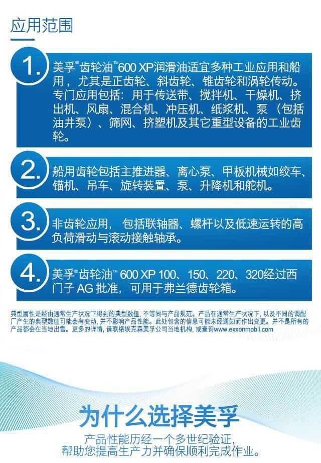 Mobilgear 600 XP润滑油适宜各种工业应用和船用 ,尤其是正齿轮、斜齿轮、锥齿轮和涡轮传动。 专门应用包括: