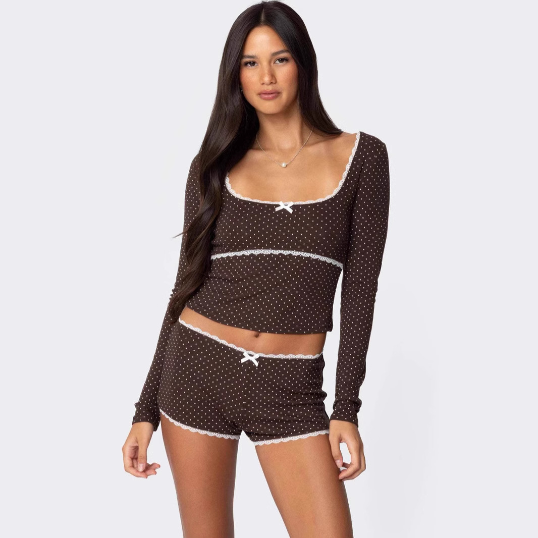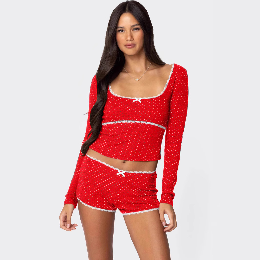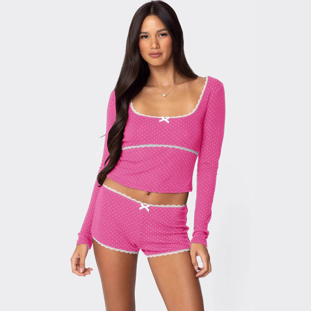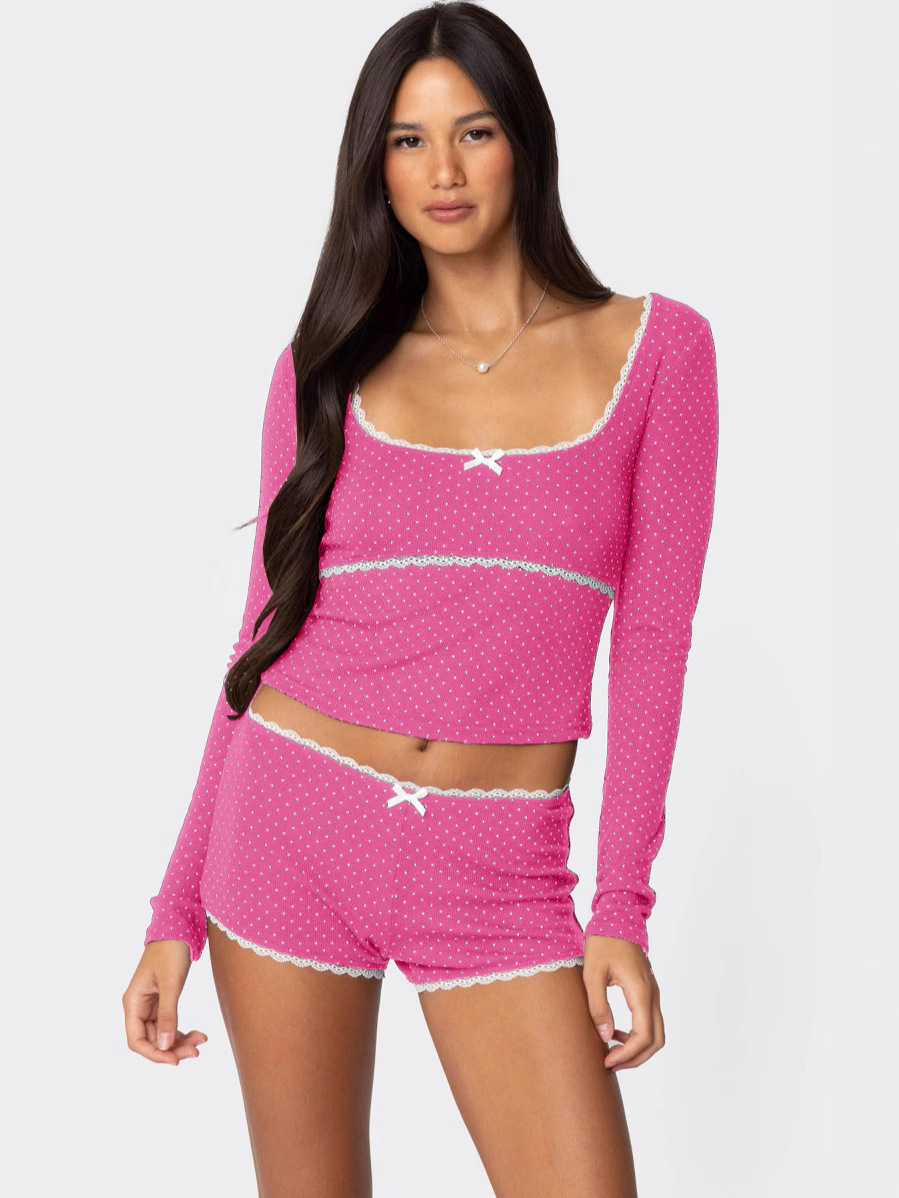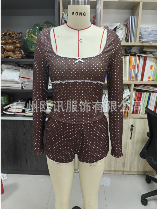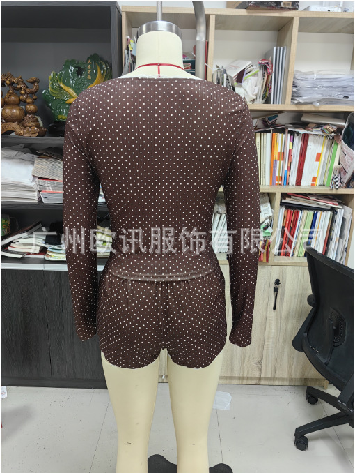 Европейский и американский кросс-зеркальный набор с волновой точкой печати новый подтяжка топ с бантом кружево сшивание сексуальные шорты набор из двух частей