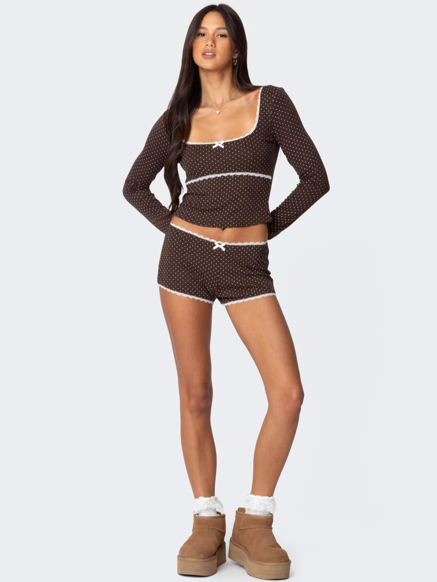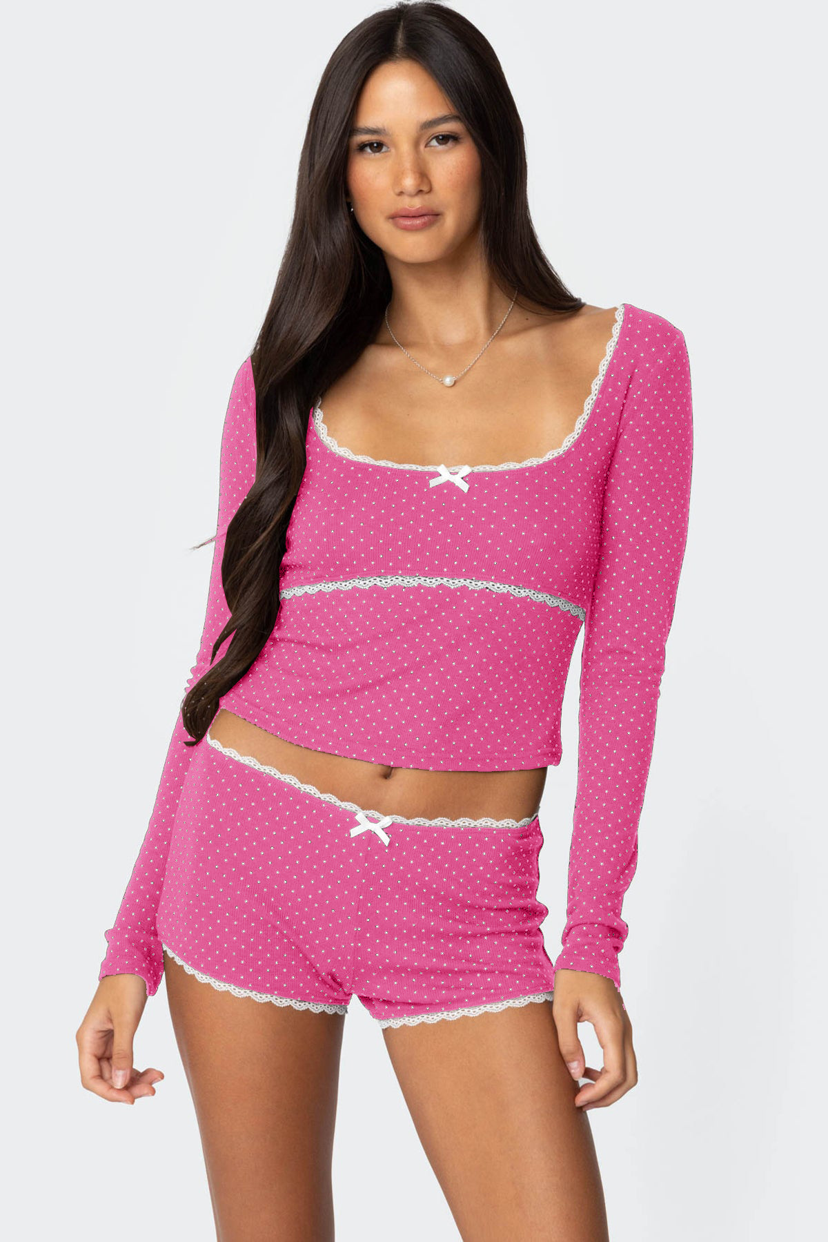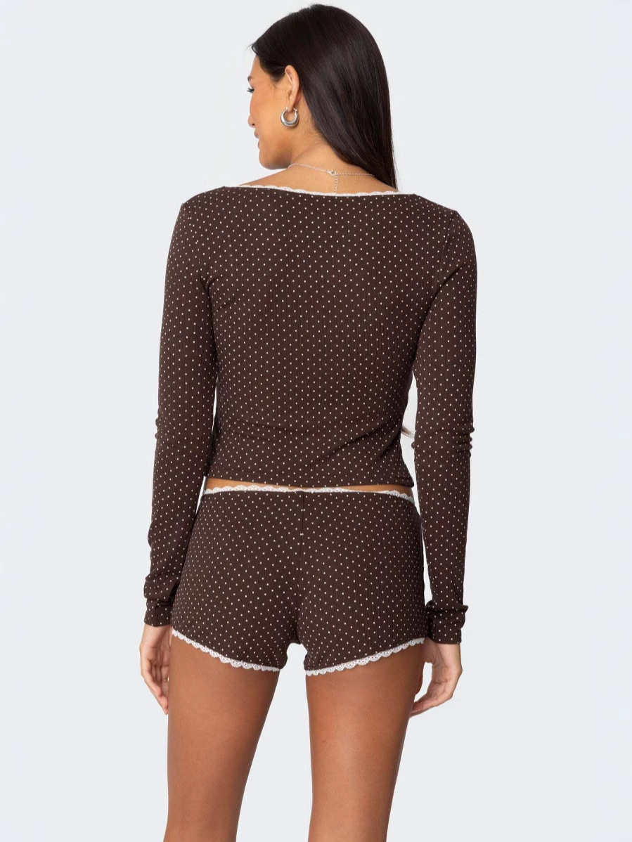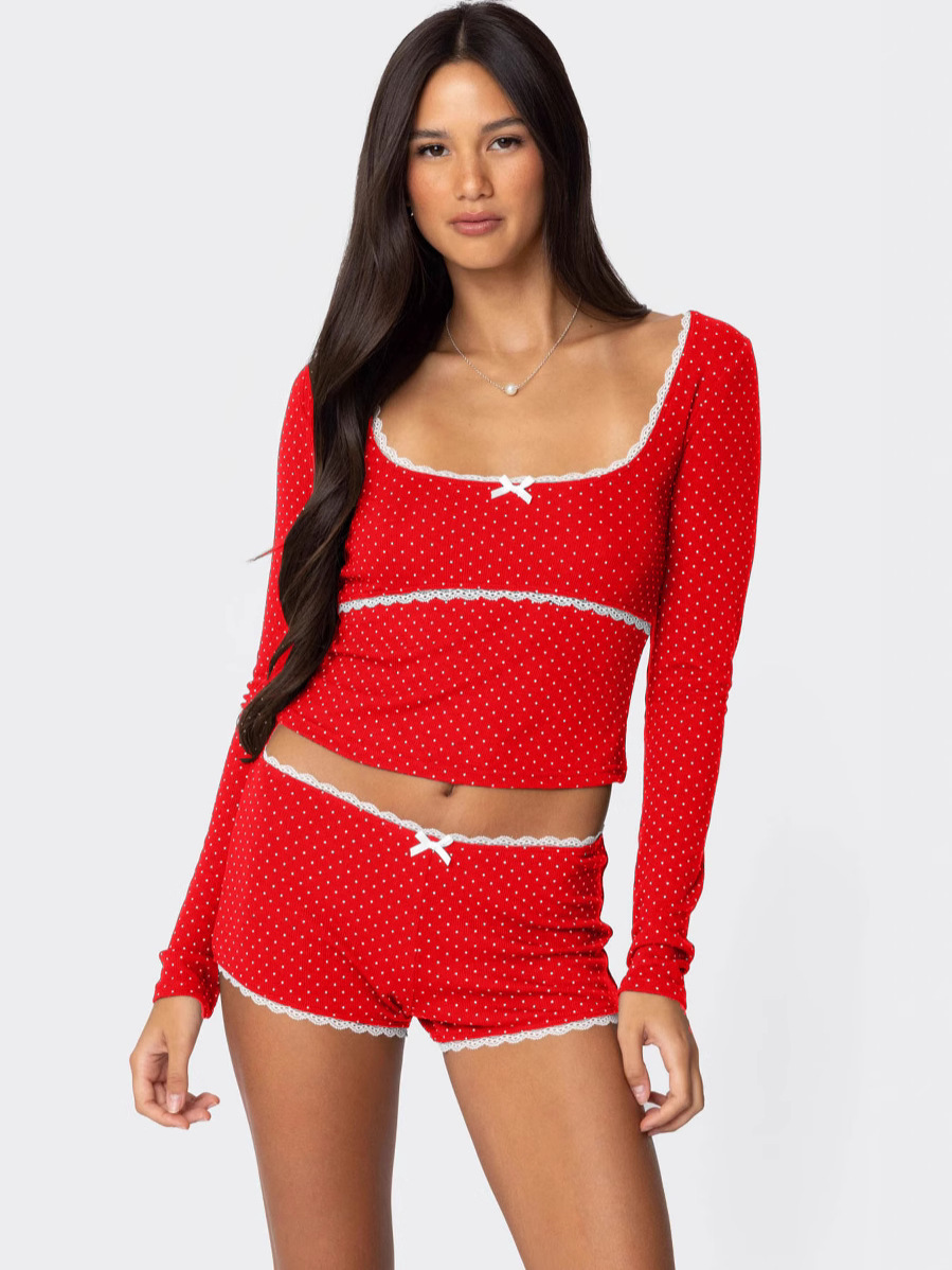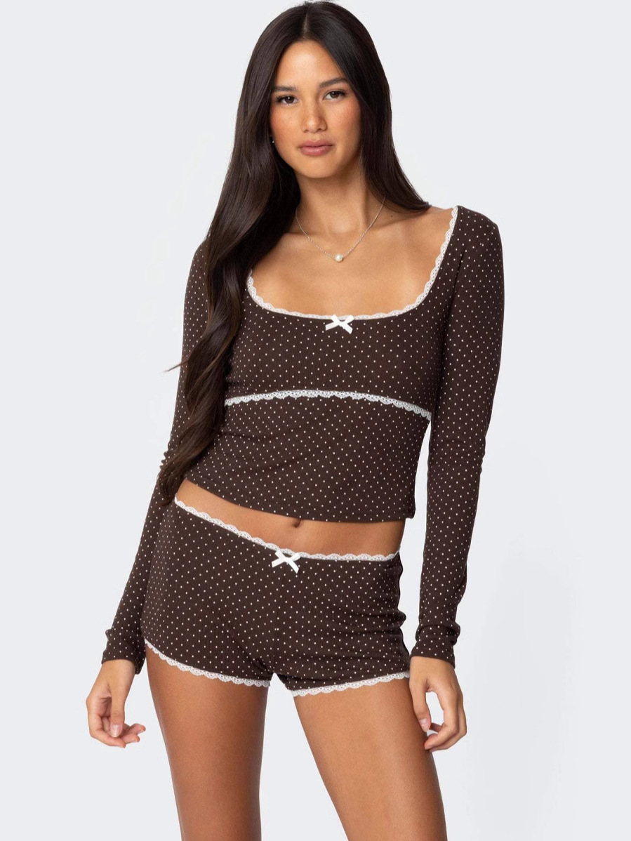 Европейский и американский кросс-зеркальный набор с волновой точкой печати новый подтяжка топ с бантом кружево сшивание сексуальные шорты набор из двух частей