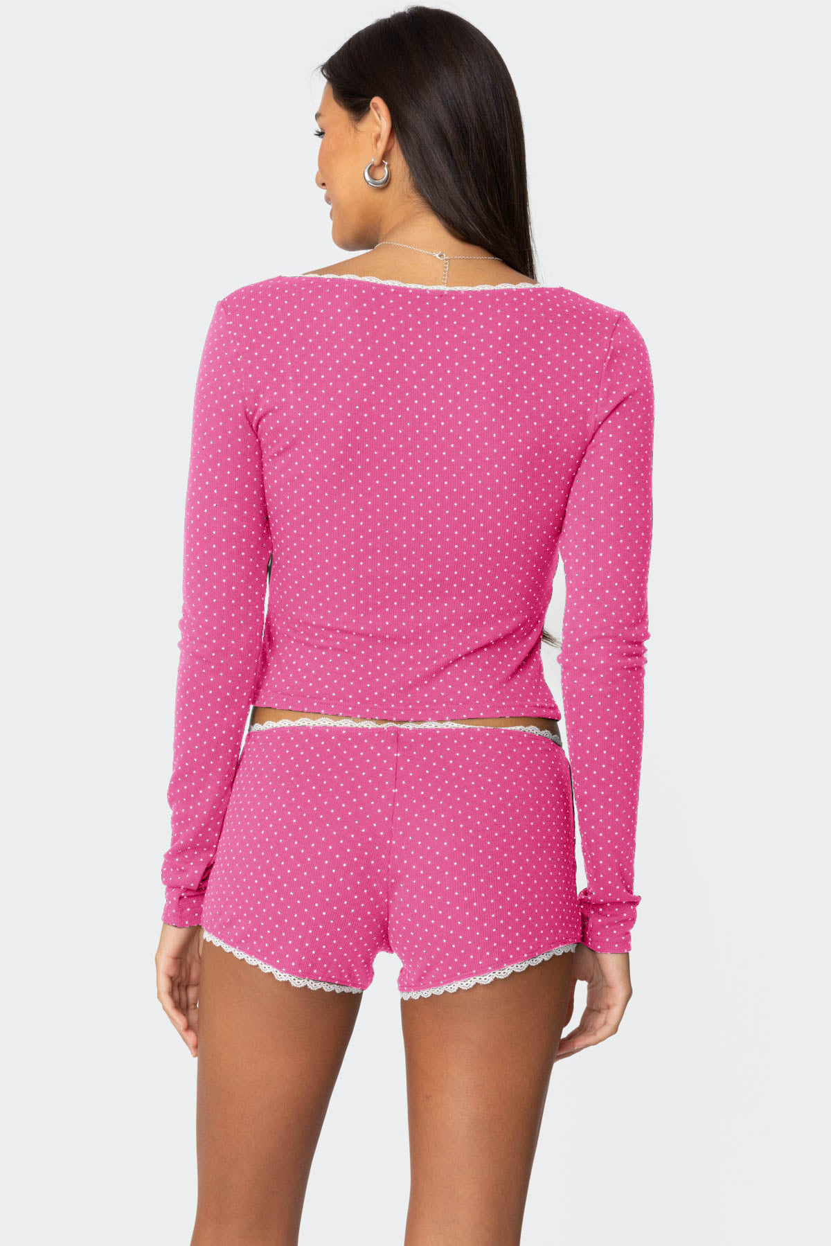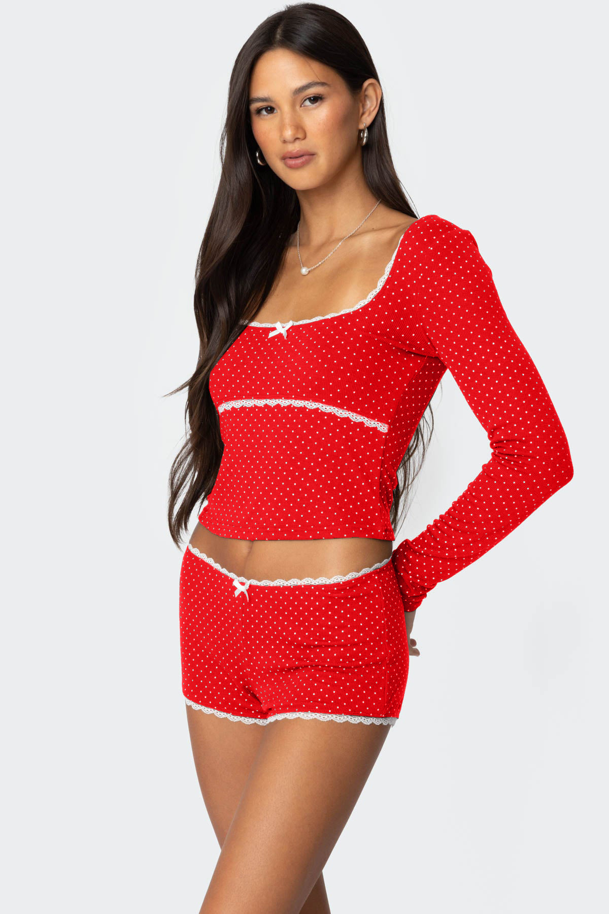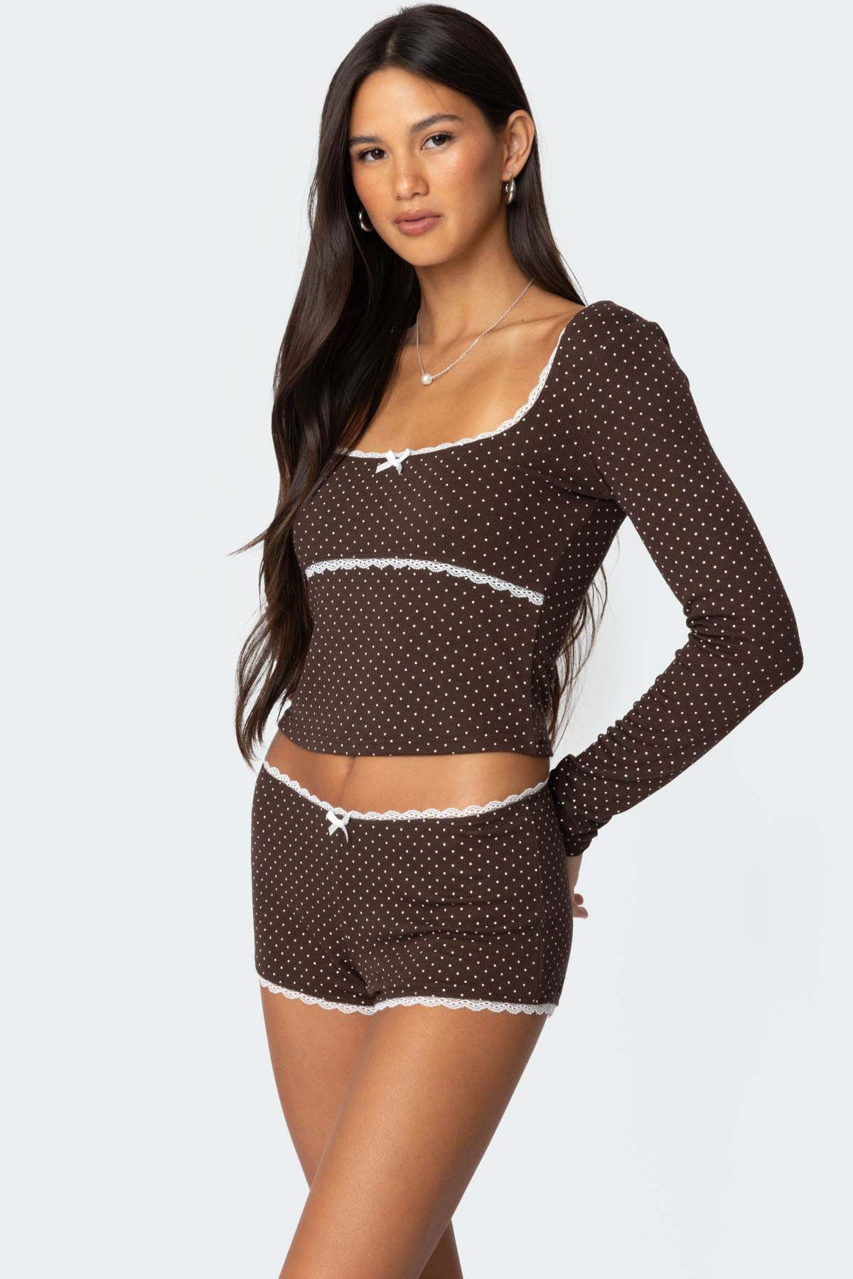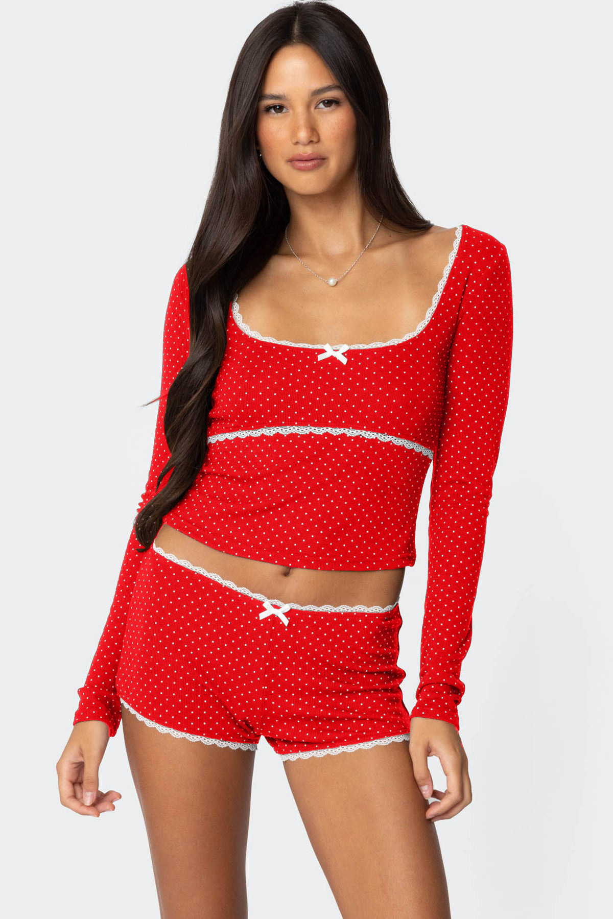 Европейский и американский кросс-зеркальный набор с волновой точкой печати новый подтяжка топ с бантом кружево сшивание сексуальные шорты набор из двух частей