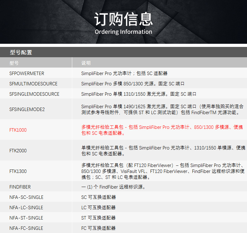 SFPOWERMETER оптический измеритель мощности; Многомодовый источник света SFM; Одномодовый источник света SFS; FTK1000 (многомодовый источник света + измеритель оптической мощности); FTK2000 (одномодовый источник света + измеритель оптической мощности); FTK1475 (заменяет FTK1450|Одиночный многорежимный пакет)