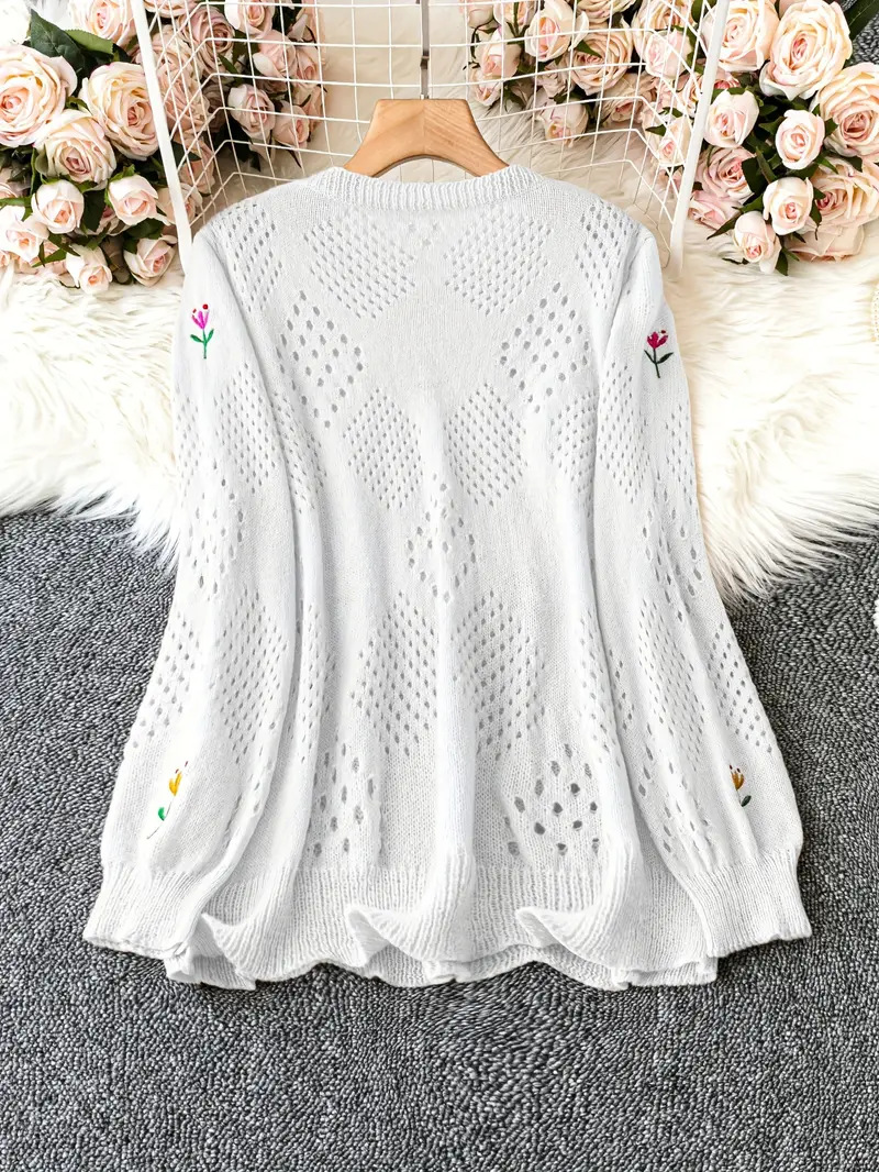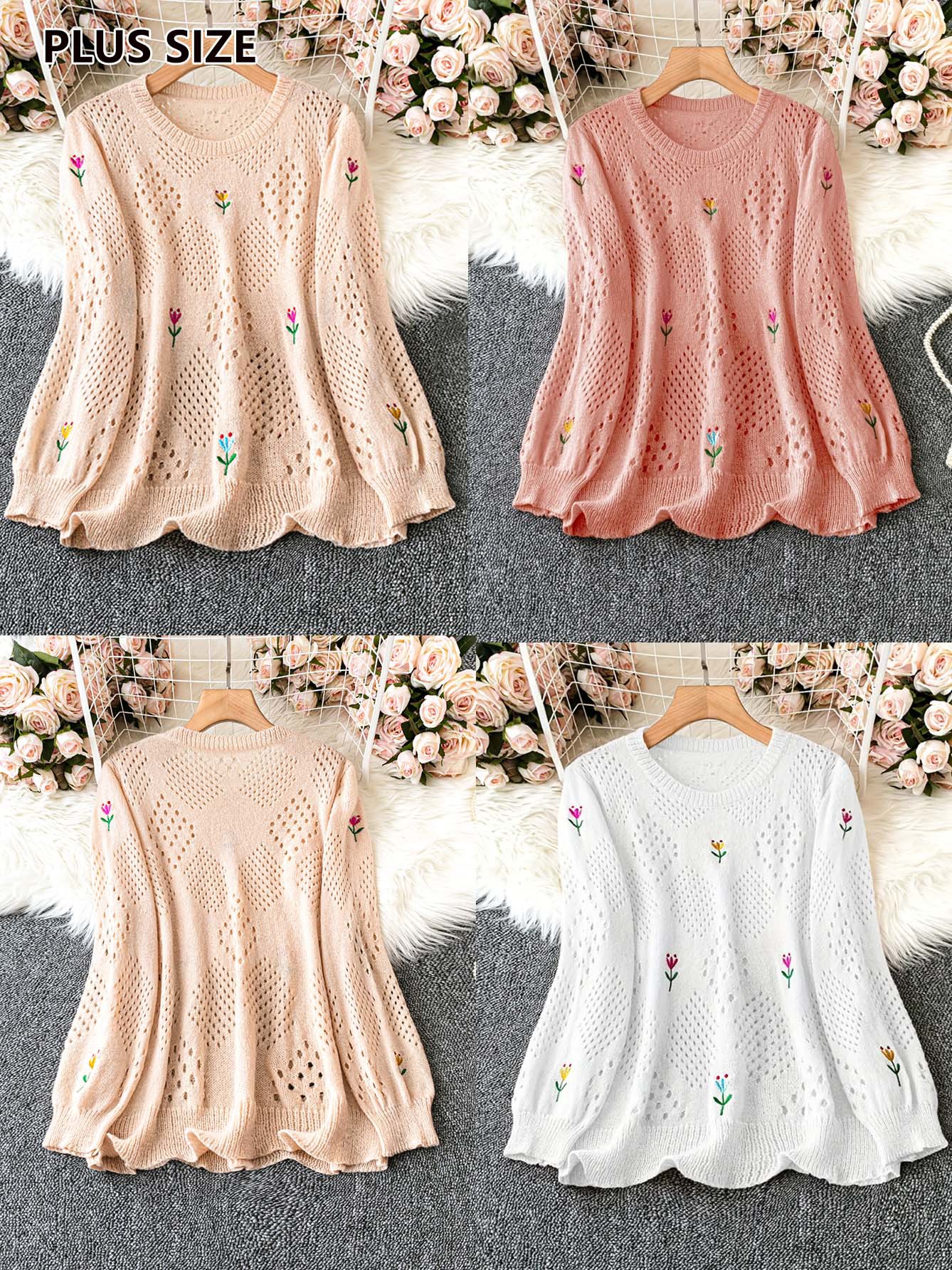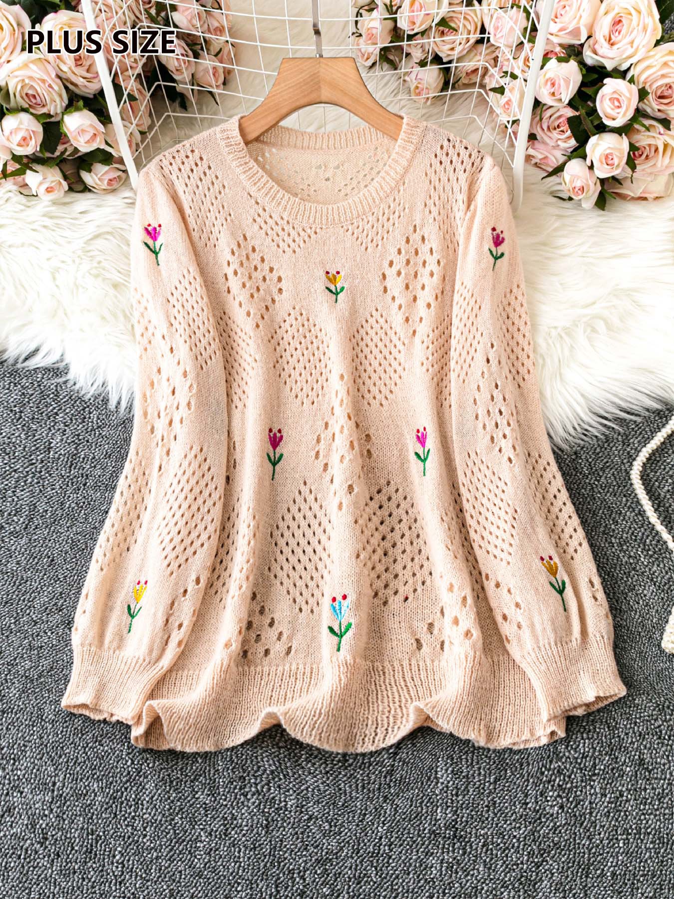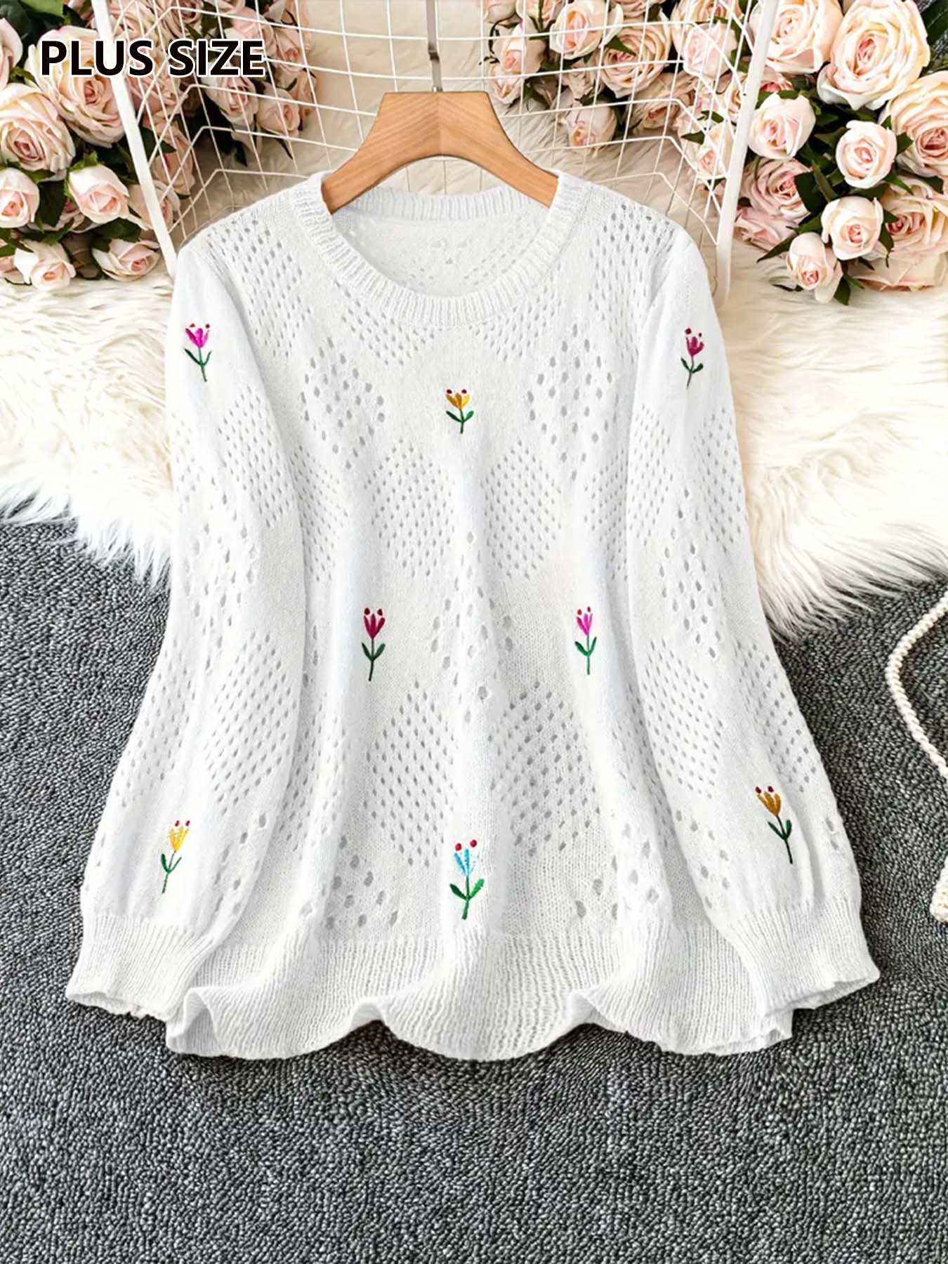 Трансграничная повседневная цветочная вышивка с длинными рукавами и круглым вырезом с полым элегантным темпераментом свитер трикотажный топ